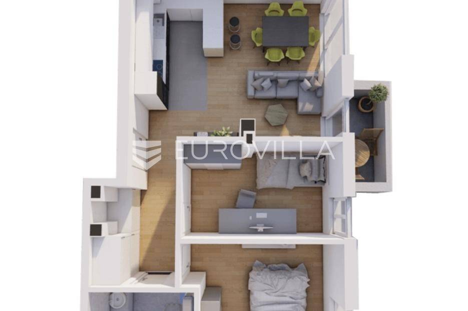 Zagreb, Odra, trosoban stan u novogradnji iz 2026. godine, smješten na 2. katu (uvućena etaža), ukupne neto površine 65.99 m2. Stan je funkcionalnog rasporeda, orijentacija sjever-zapad.Sastoji se od ulaznog prostora (6.62 m2), dnevnog boravka s kuhinjom i blagovaonicom (19.82 m2) s izlazom na prostranu terasu 45.72 m² (11.43 m2), dvije spavaće sobe (10.62 m2 i 6.97 m2) te kupaonice (4.03 m2).Stanu pripada garažno parkirno mjesto 13 m2 (6.50 m2).OPREMA I TEHNOLOGIJASMART HOME sustav(upravljanje putem mobitela) rasvjetagrijanjesigurnosni sustavipodno grijanje putem dizalice toplineklima uređaj (Wi-Fi upravljanje)STOLARIJA I MATERIJALIPVC stolarija REHAU troslojno stakloelektrične rolete s komarnicimatroslojni hrastov parketprotuprovalna ulazna vrataLOKACIJAodlična prometna povezanostplanirano povezivanje Odre sa Sarajevskom cestombrza dostupnost centra gradablizina svih sadržaja: vrtić i školabolnicaautobusno stajalištetrgovine i trgovački centriZračna lukaZa sva dodatna pitanja, stojimo Vam na raspolaganju.... Više na eurovilla.hr, ID: 291254
