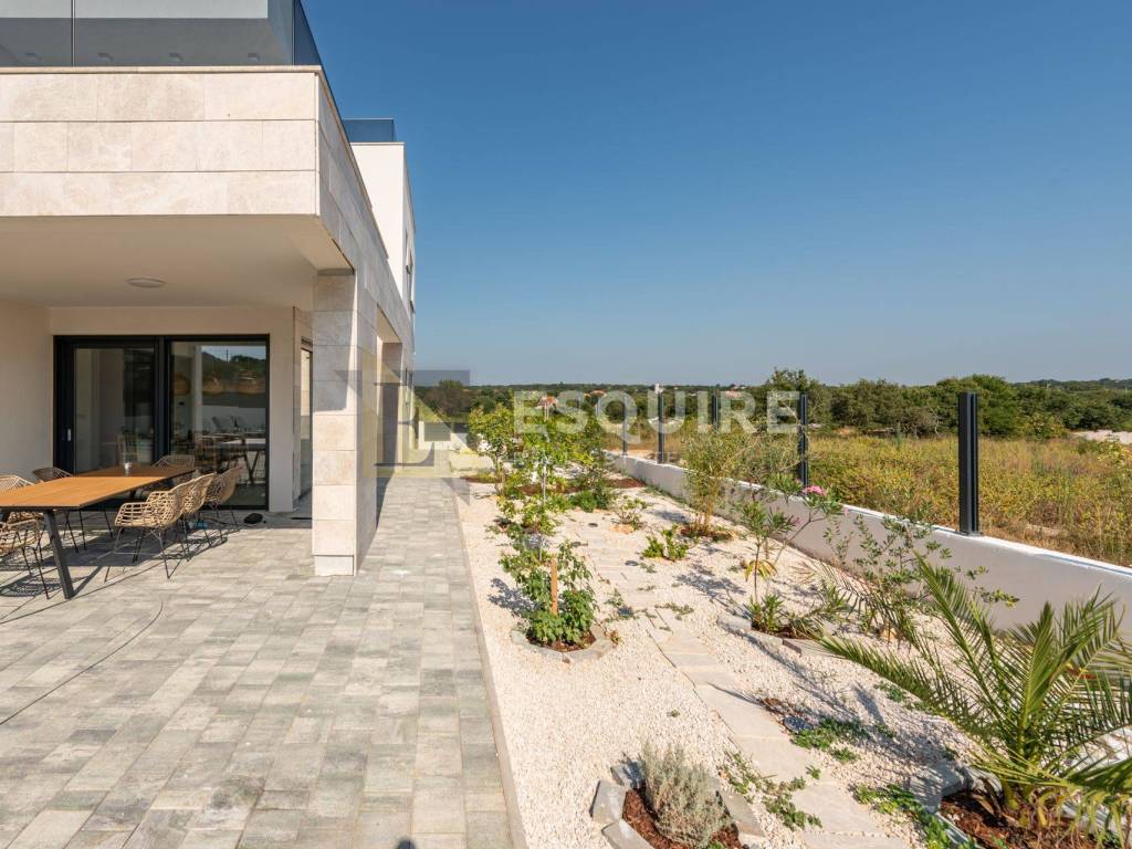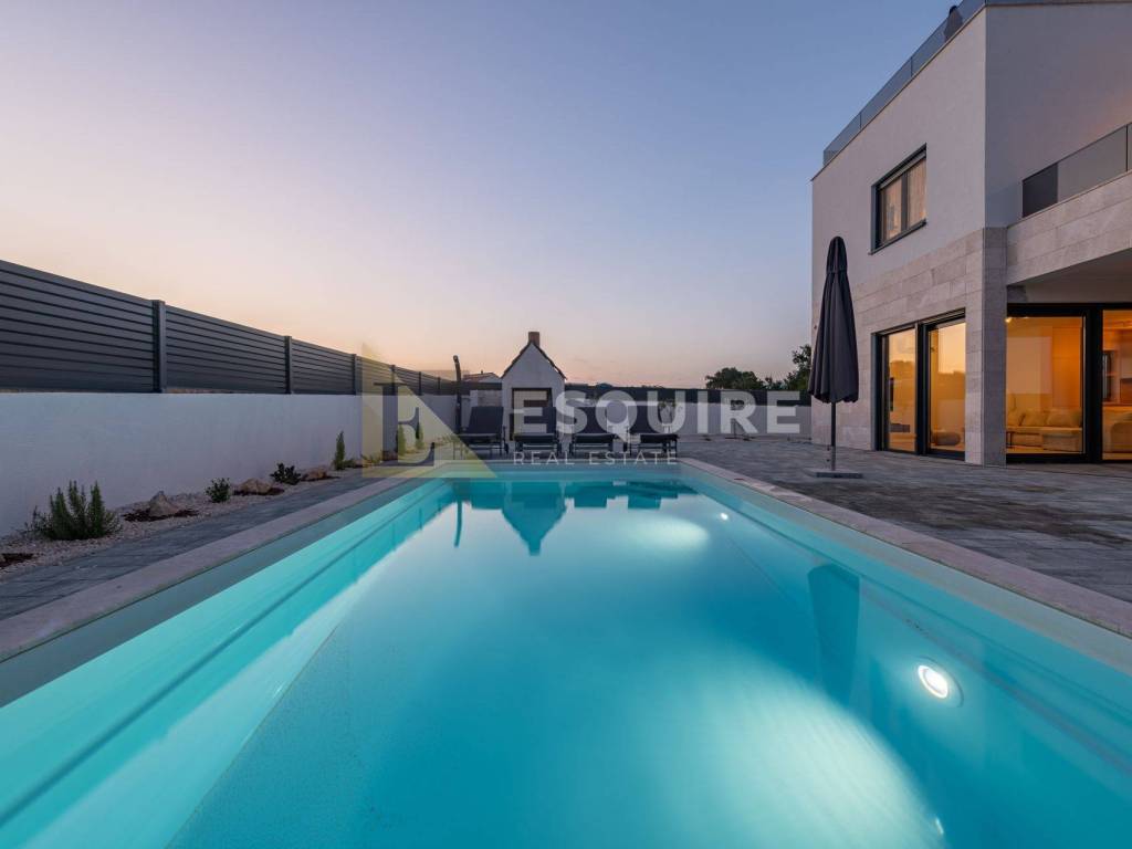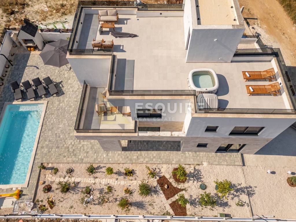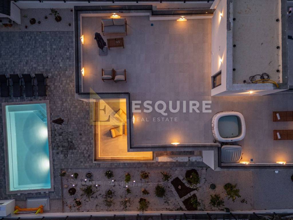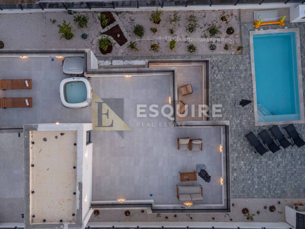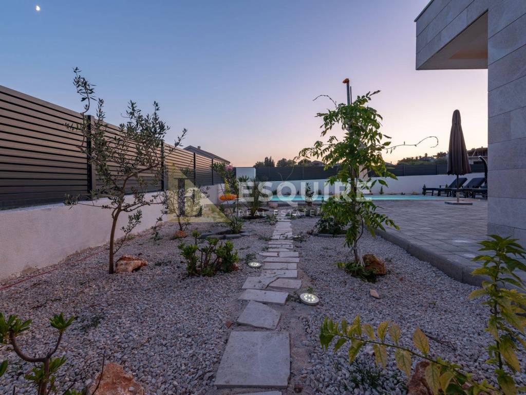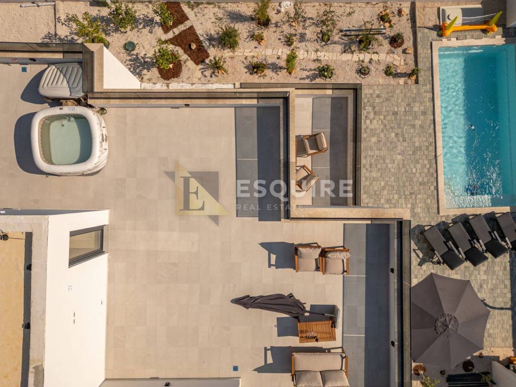 Vanjski prostor pažljivo je uređen – okućnica je obogaćena mediteranskim biljem i sustavom automatskog navodnjavanja, dok se u dvorištu nalazi natkrivena terasa s roštiljem, idealna za boravak na otvorenom. Tu je i prostrani bazen opremljen sustavom za protustrujno plivanje, automatskim doziranjem kemikalija te mogućnošću grijanja i hlađenja putem dizalice topline.