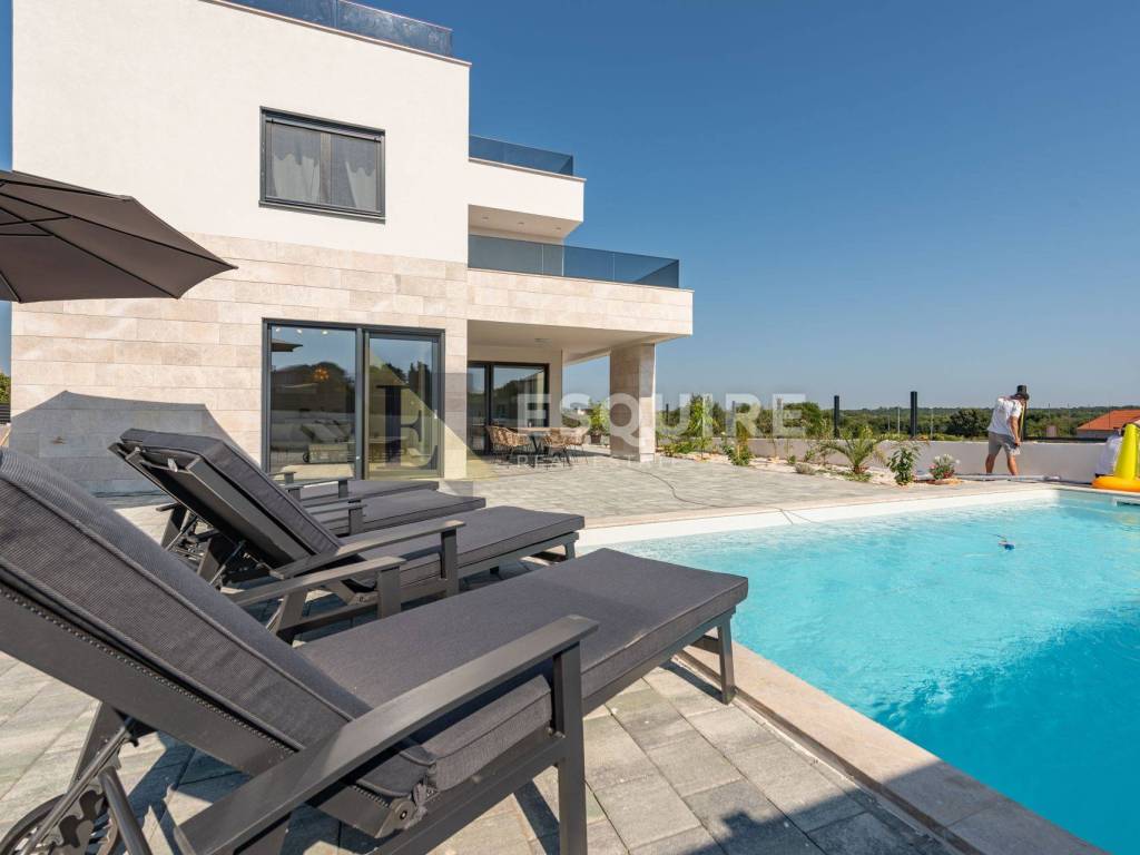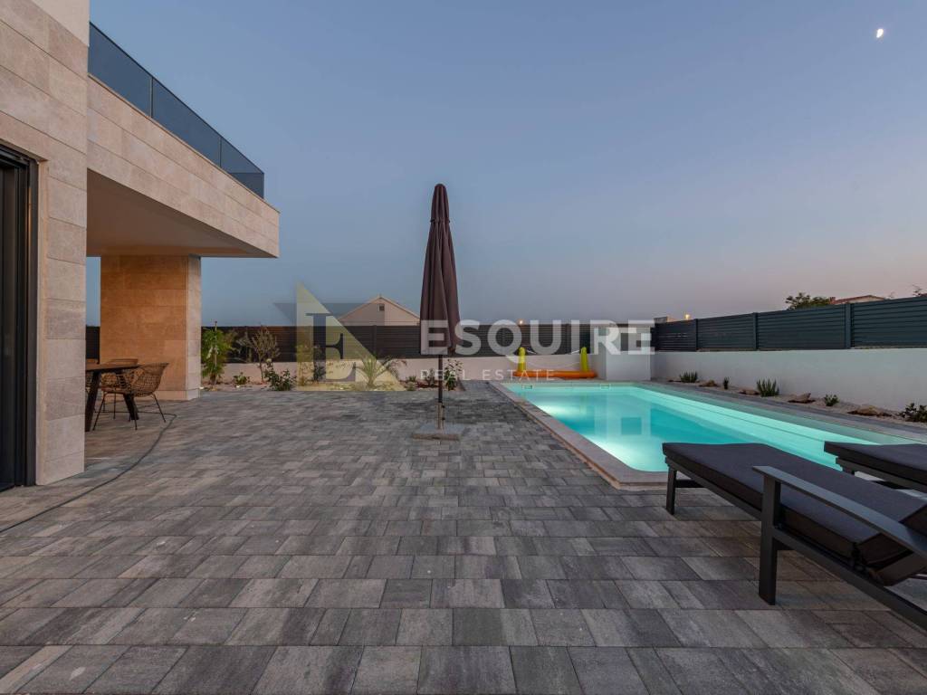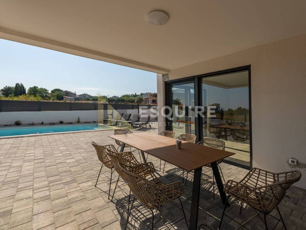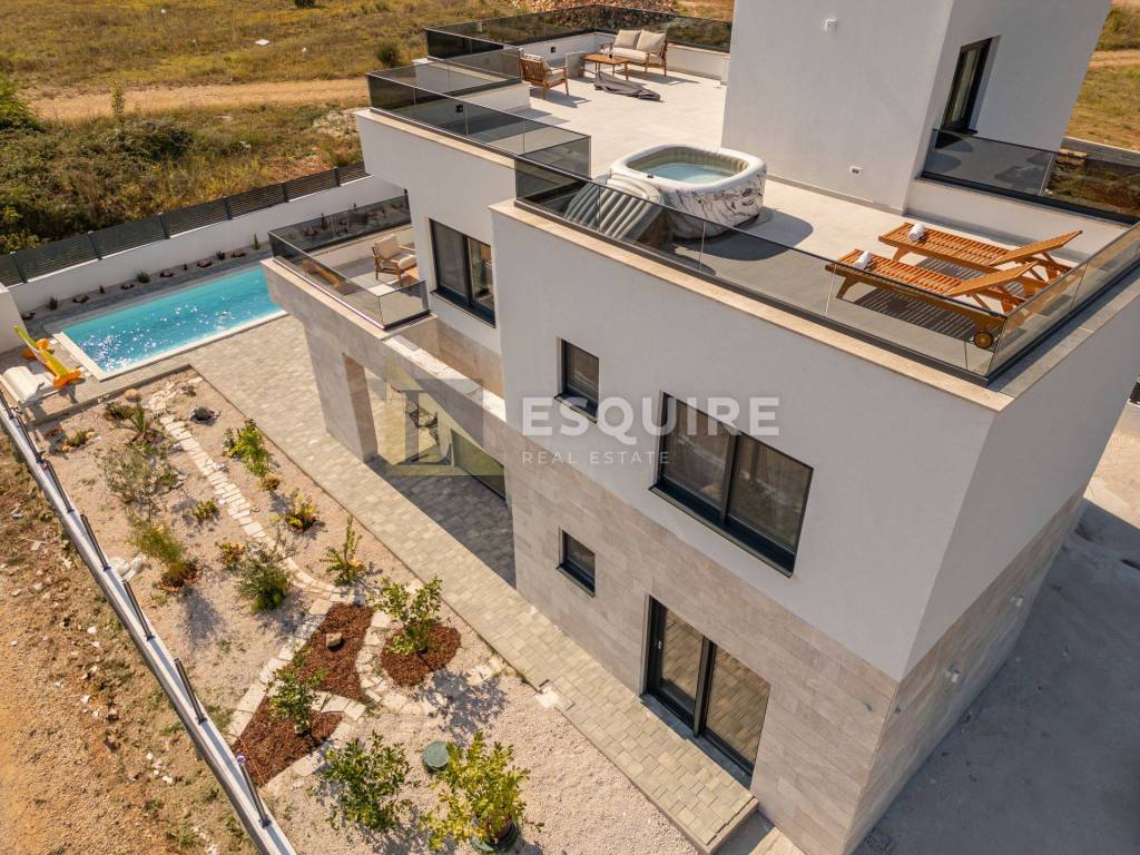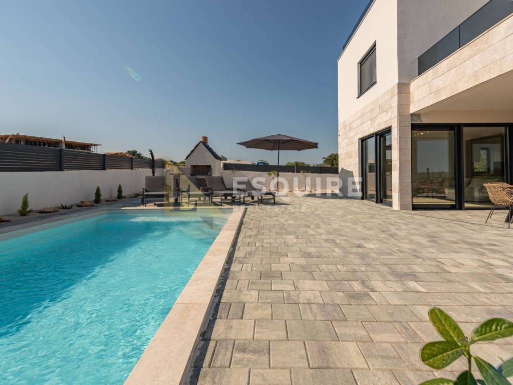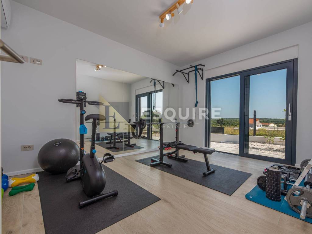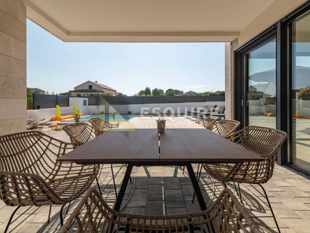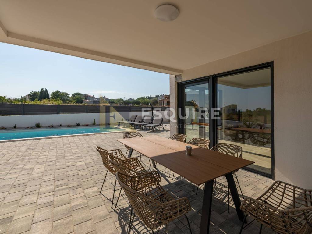 Vanjski prostor pažljivo je uređen – okućnica je obogaćena mediteranskim biljem i sustavom automatskog navodnjavanja, dok se u dvorištu nalazi natkrivena terasa s roštiljem, idealna za boravak na otvorenom. Tu je i prostrani bazen opremljen sustavom za protustrujno plivanje, automatskim doziranjem kemikalija te mogućnošću grijanja i hlađenja putem dizalice topline.