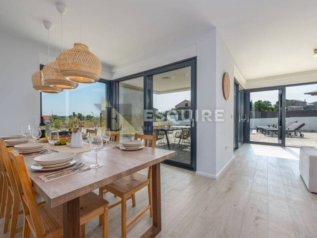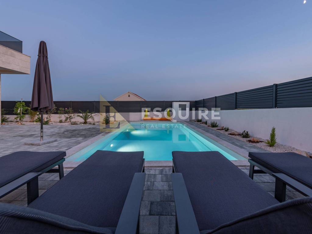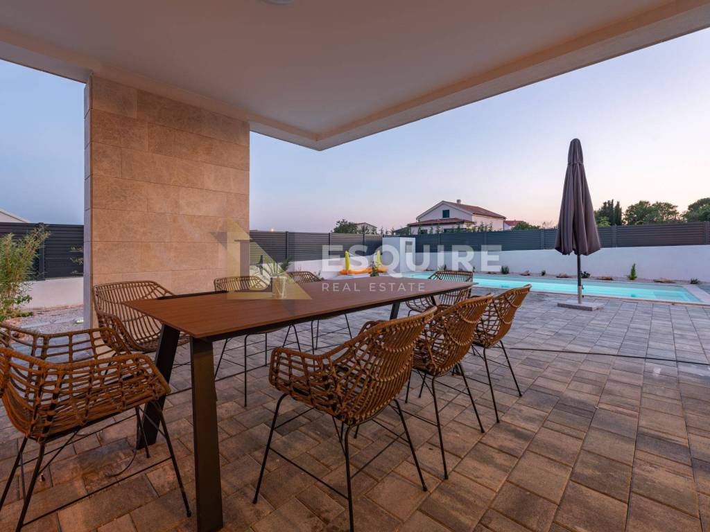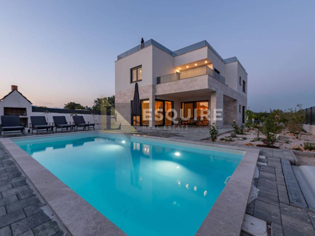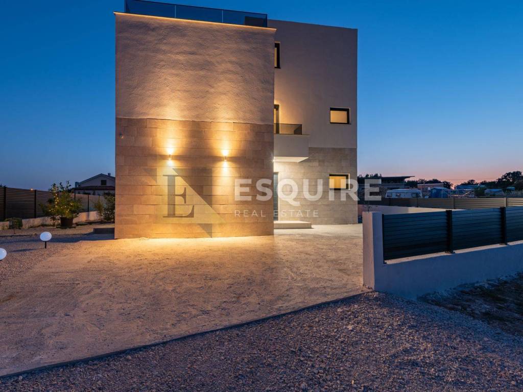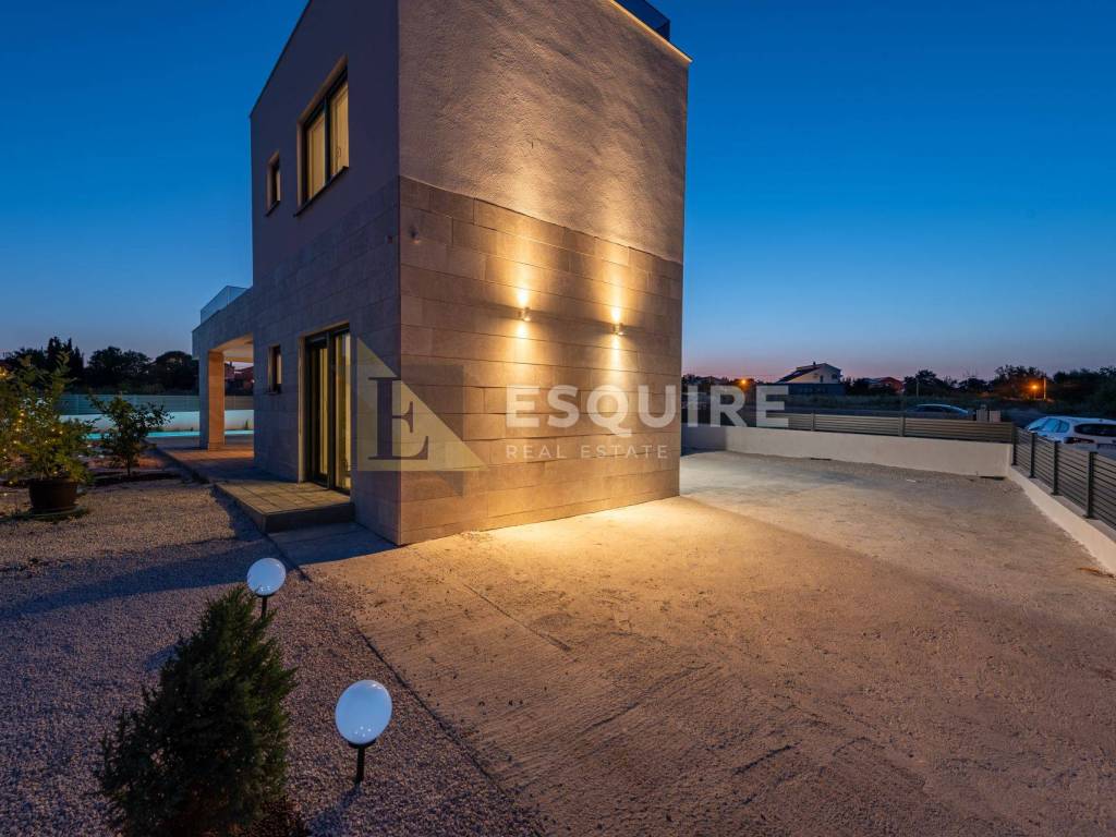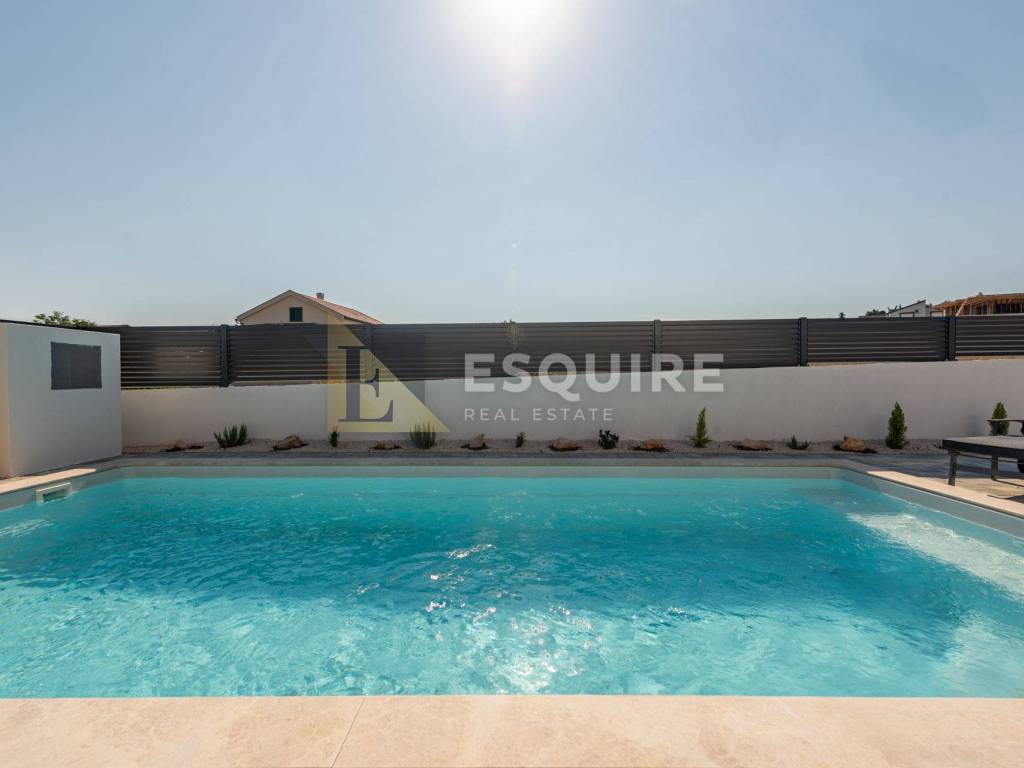 Vanjski prostor pažljivo je uređen – okućnica je obogaćena mediteranskim biljem i sustavom automatskog navodnjavanja, dok se u dvorištu nalazi natkrivena terasa s roštiljem, idealna za boravak na otvorenom. Tu je i prostrani bazen opremljen sustavom za protustrujno plivanje, automatskim doziranjem kemikalija te mogućnošću grijanja i hlađenja putem dizalice topline.