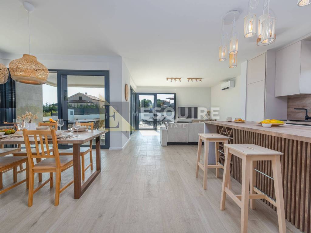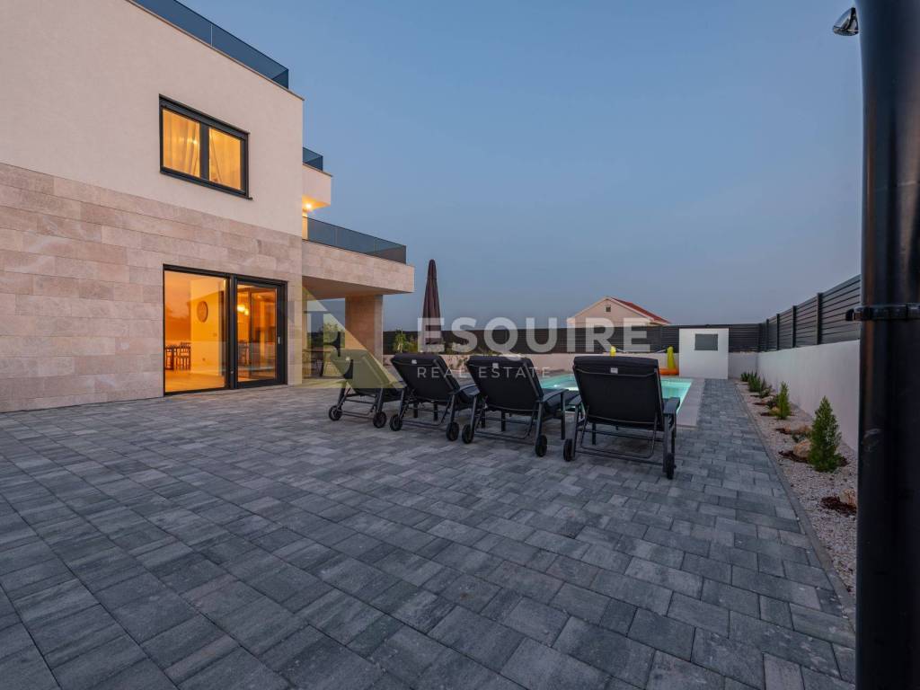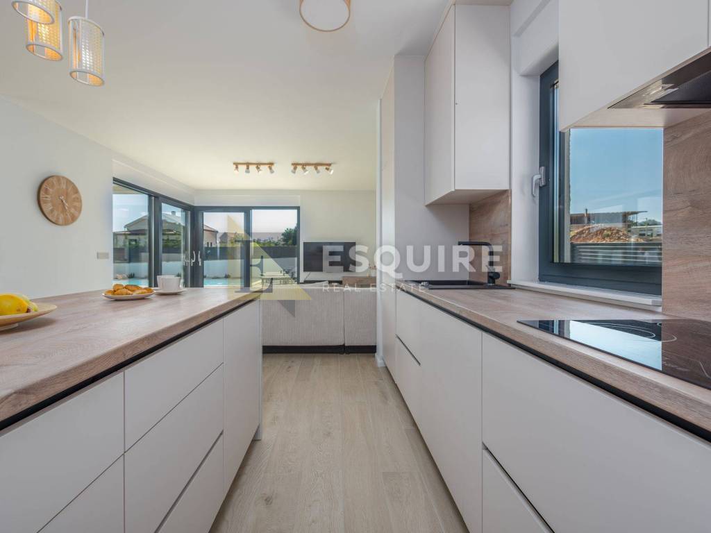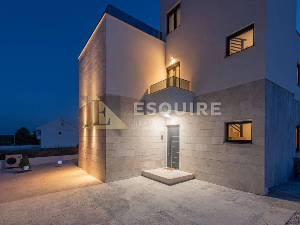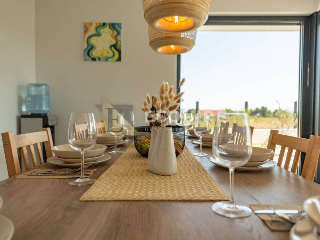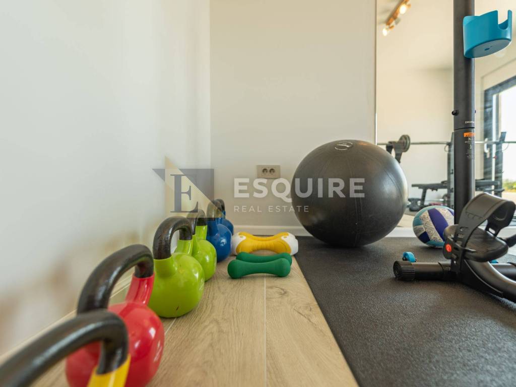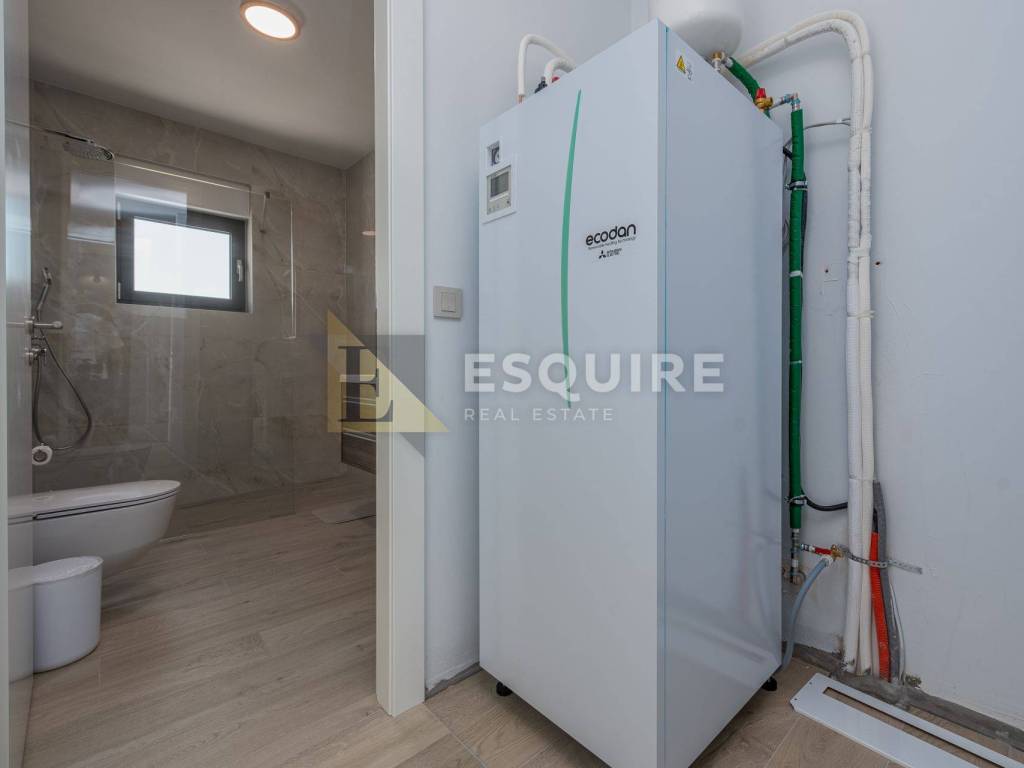 Vanjski prostor pažljivo je uređen – okućnica je obogaćena mediteranskim biljem i sustavom automatskog navodnjavanja, dok se u dvorištu nalazi natkrivena terasa s roštiljem, idealna za boravak na otvorenom. Tu je i prostrani bazen opremljen sustavom za protustrujno plivanje, automatskim doziranjem kemikalija te mogućnošću grijanja i hlađenja putem dizalice topline.
