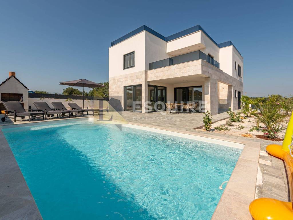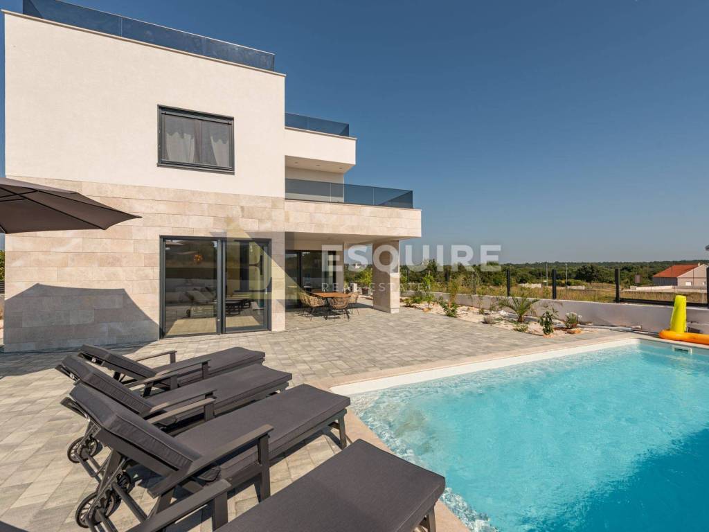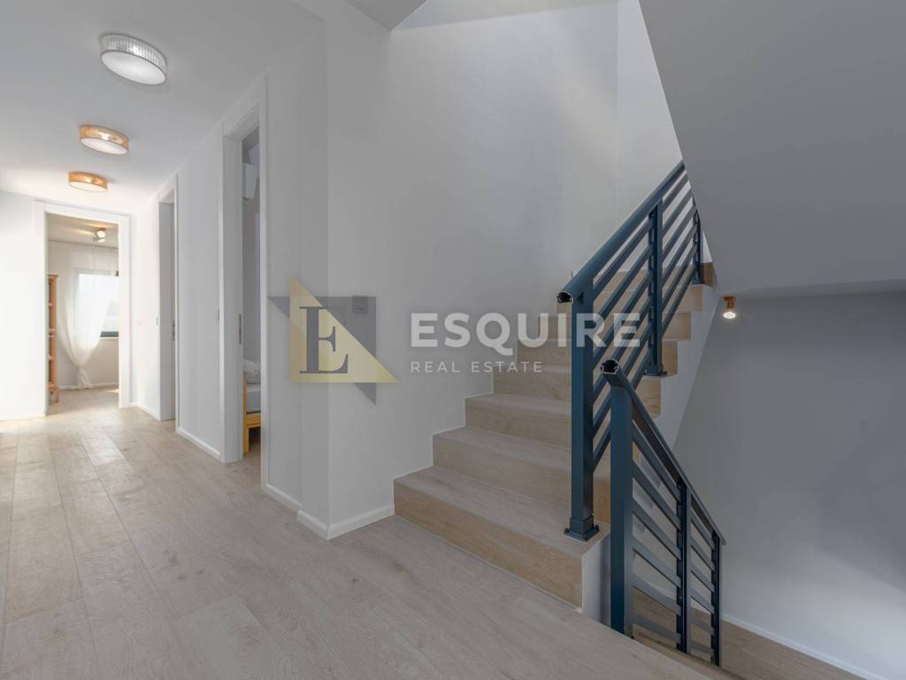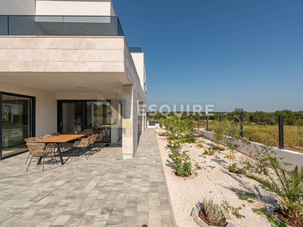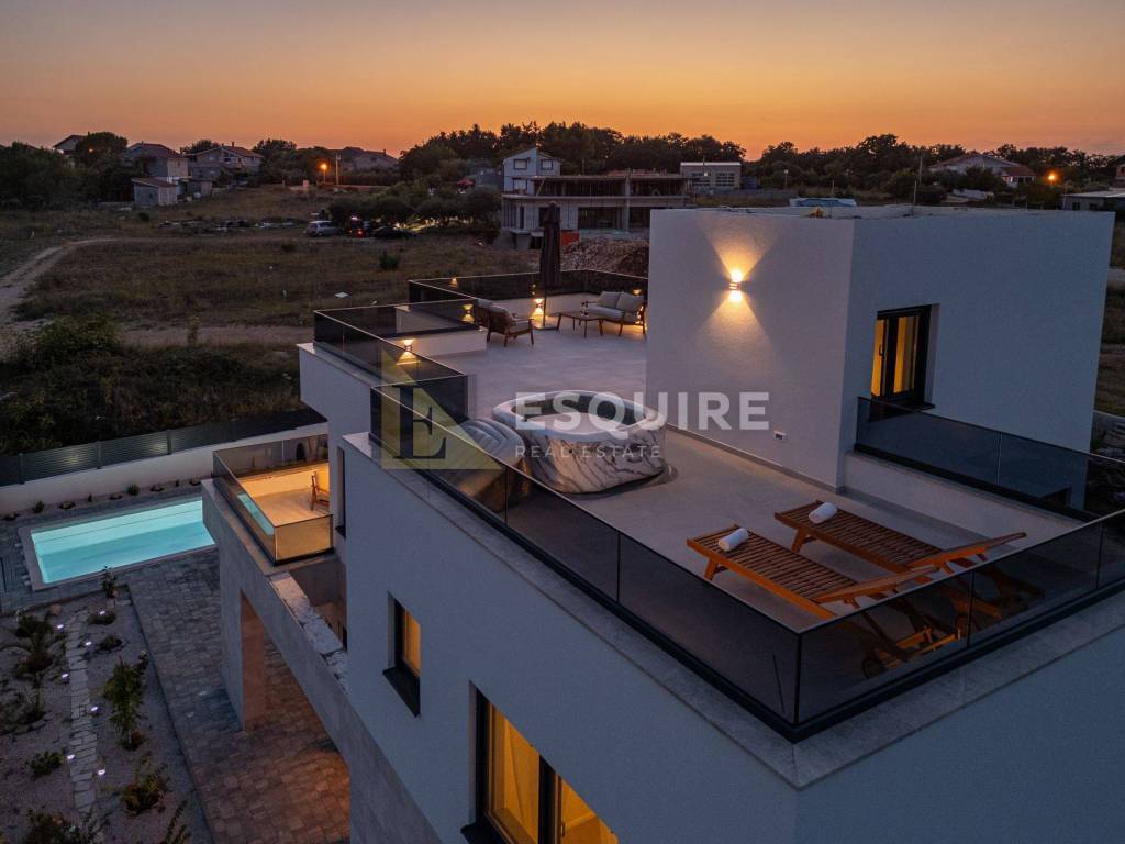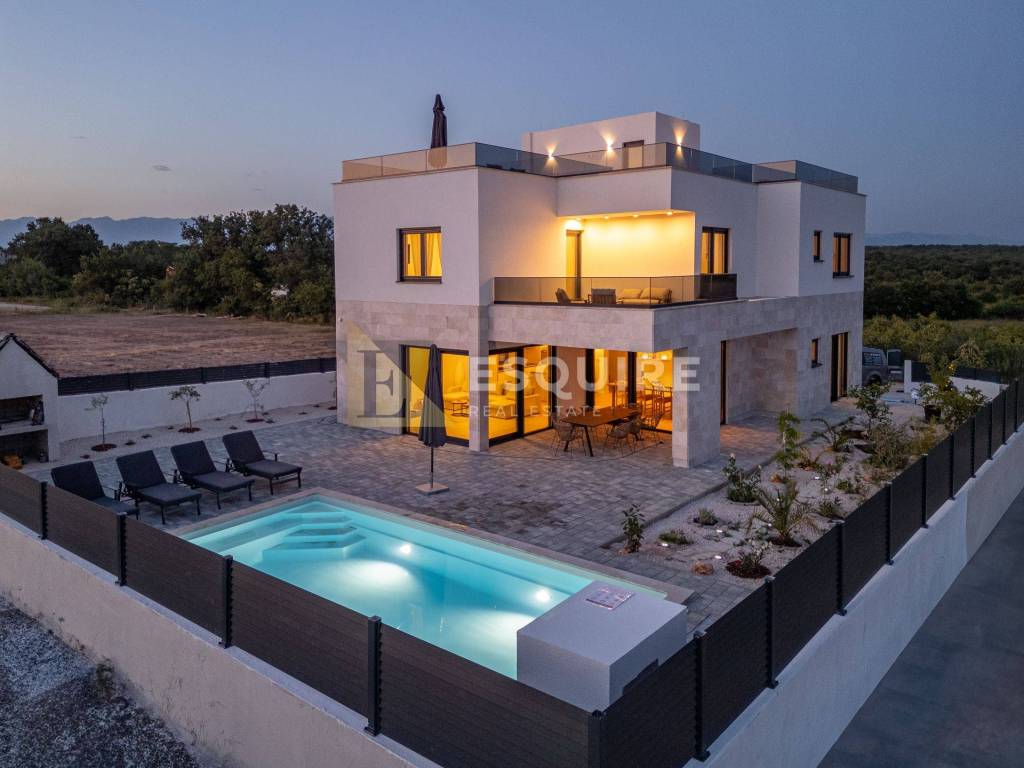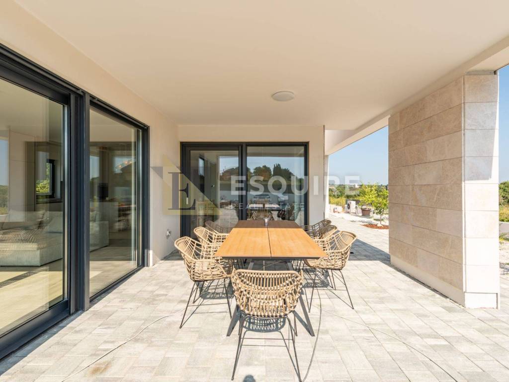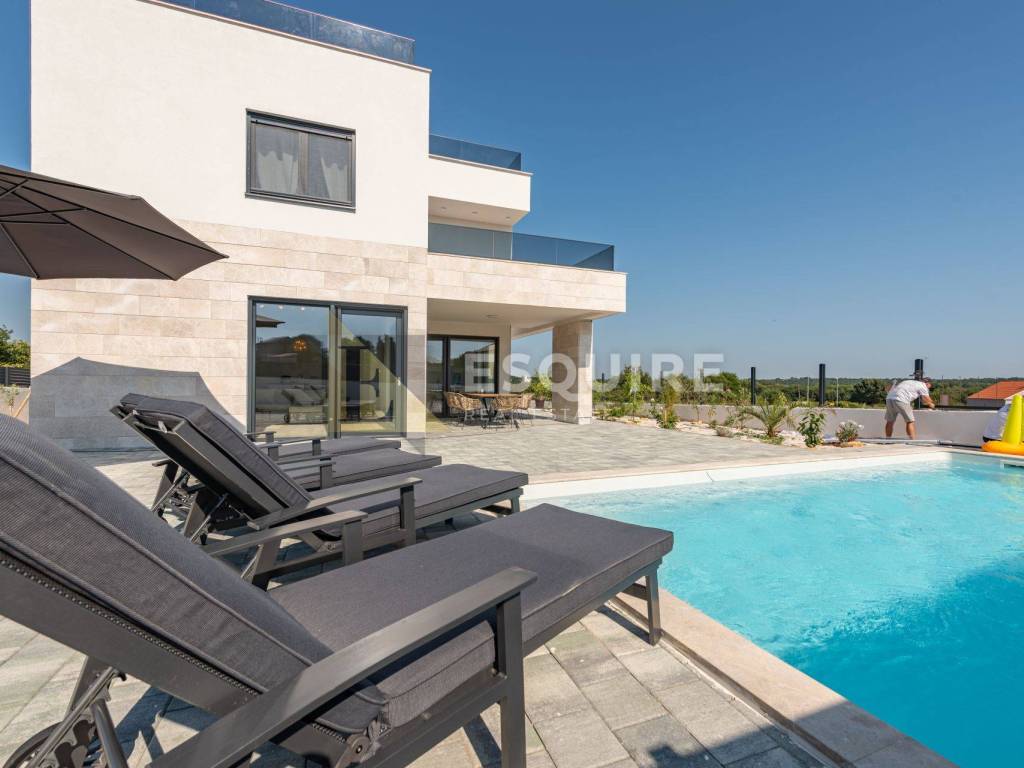 Vanjski prostor pažljivo je uređen – okućnica je obogaćena mediteranskim biljem i sustavom automatskog navodnjavanja, dok se u dvorištu nalazi natkrivena terasa s roštiljem, idealna za boravak na otvorenom. Tu je i prostrani bazen opremljen sustavom za protustrujno plivanje, automatskim doziranjem kemikalija te mogućnošću grijanja i hlađenja putem dizalice topline.