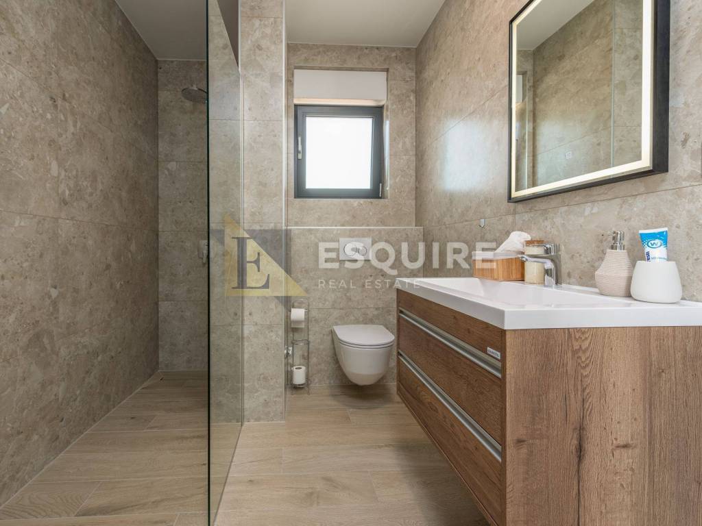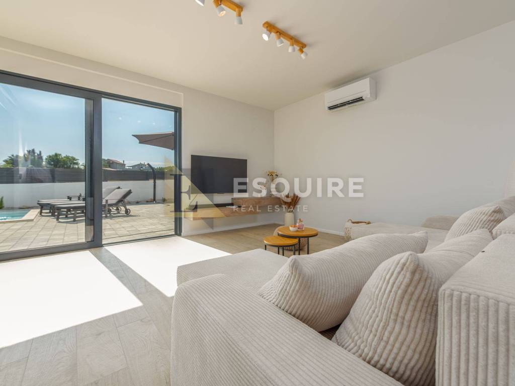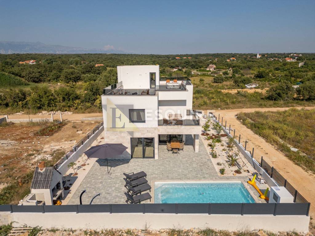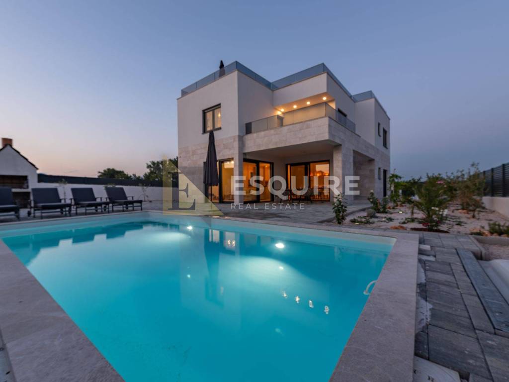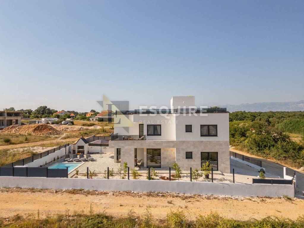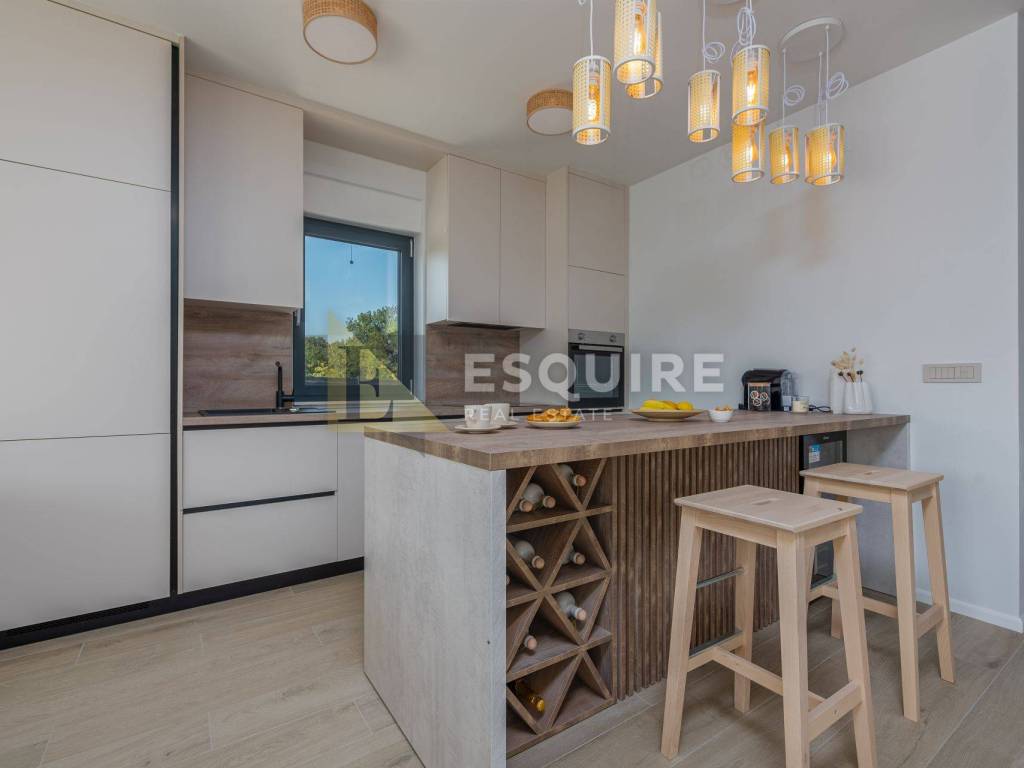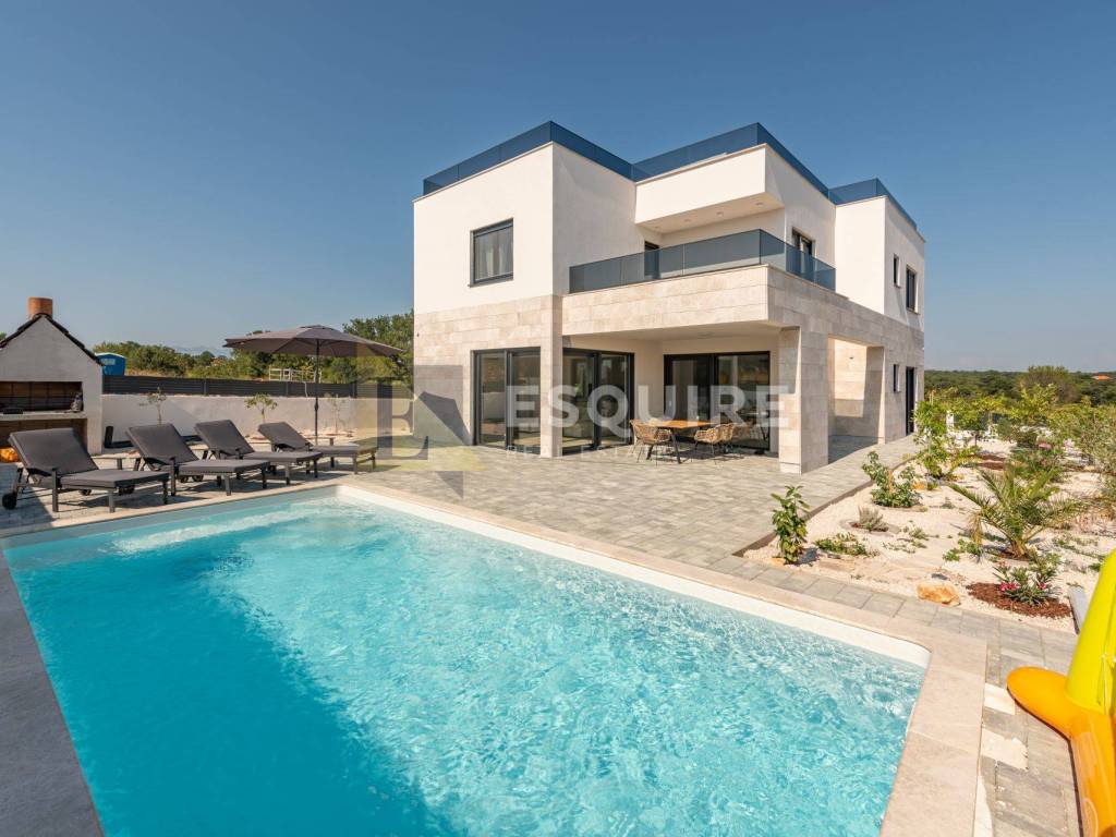 Vanjski prostor pažljivo je uređen – okućnica je obogaćena mediteranskim biljem i sustavom automatskog navodnjavanja, dok se u dvorištu nalazi natkrivena terasa s roštiljem, idealna za boravak na otvorenom. Tu je i prostrani bazen opremljen sustavom za protustrujno plivanje, automatskim doziranjem kemikalija te mogućnošću grijanja i hlađenja putem dizalice topline.