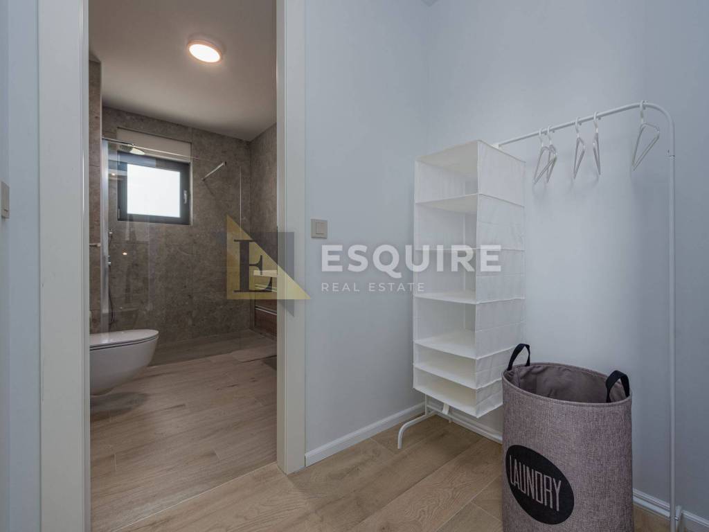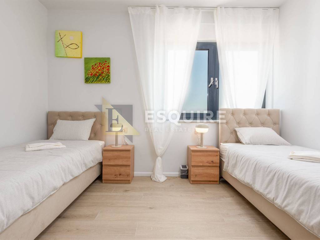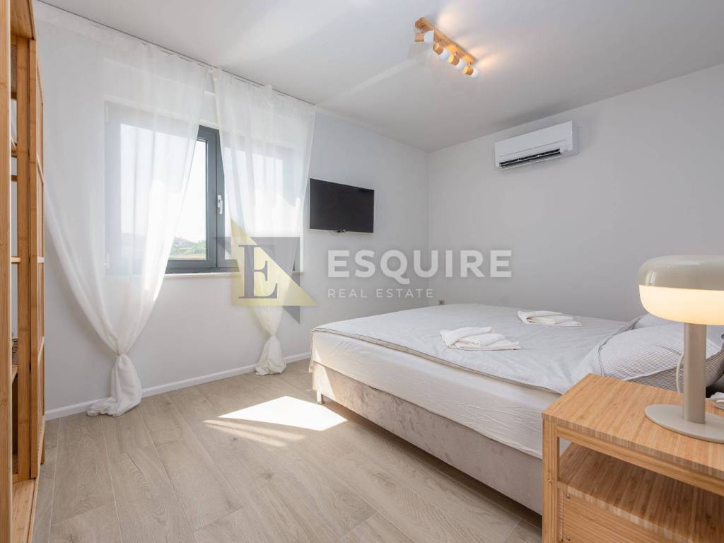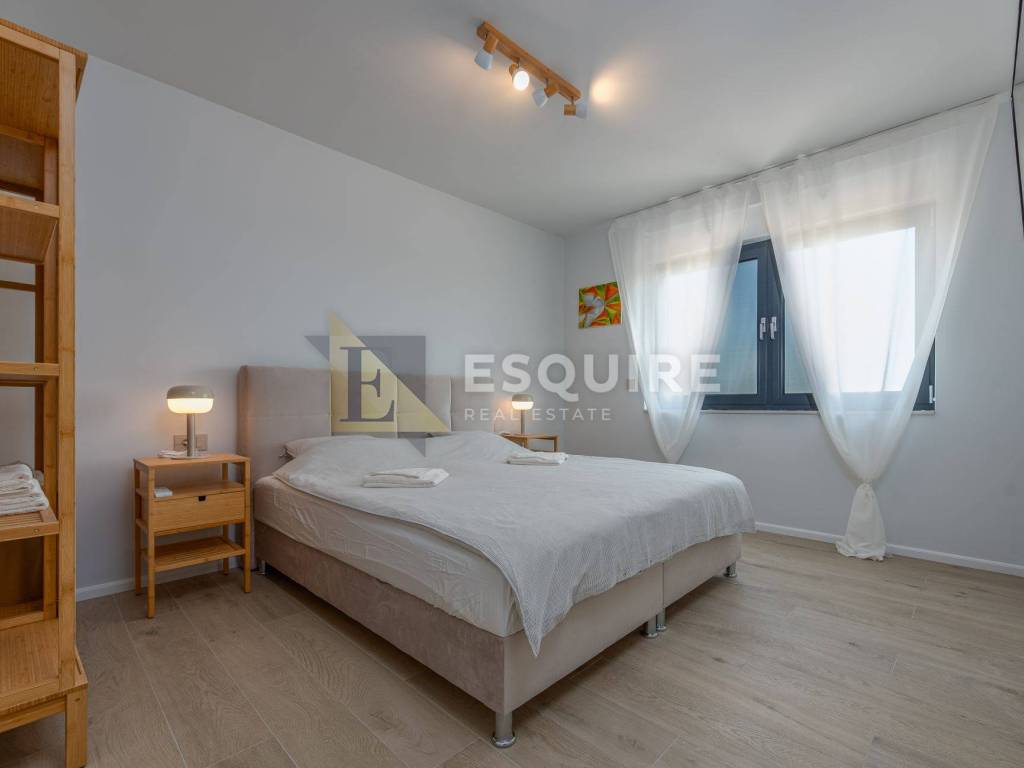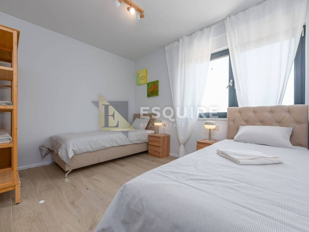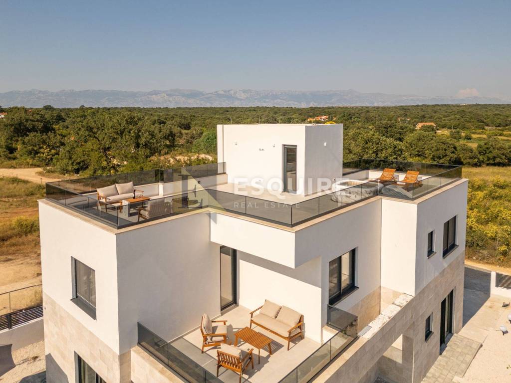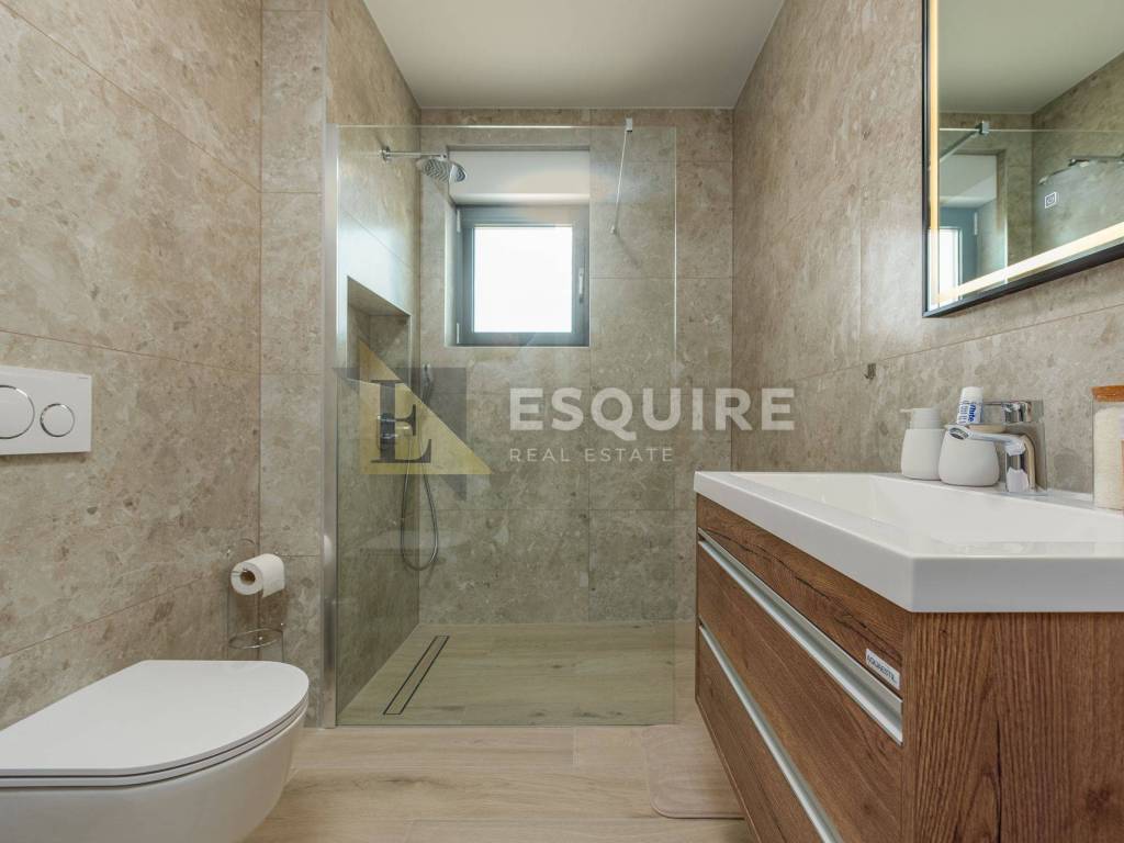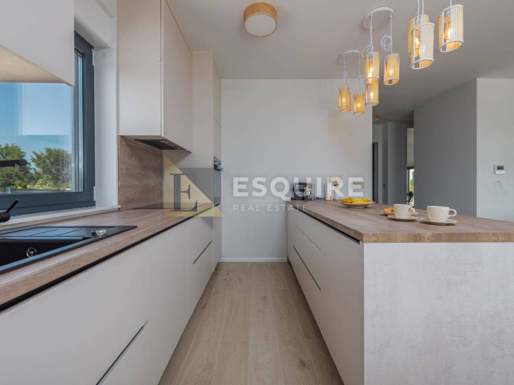 Vanjski prostor pažljivo je uređen – okućnica je obogaćena mediteranskim biljem i sustavom automatskog navodnjavanja, dok se u dvorištu nalazi natkrivena terasa s roštiljem, idealna za boravak na otvorenom. Tu je i prostrani bazen opremljen sustavom za protustrujno plivanje, automatskim doziranjem kemikalija te mogućnošću grijanja i hlađenja putem dizalice topline.