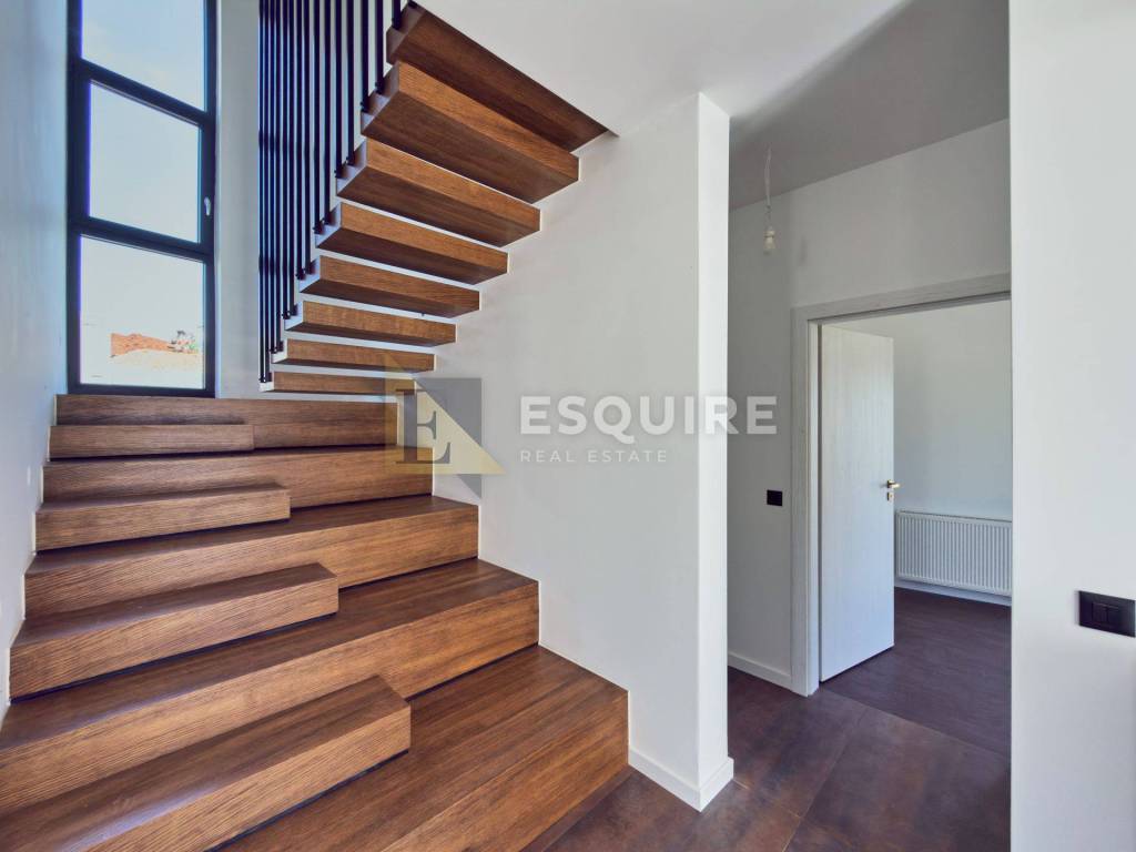 Unutarnje stubište vodi na kat gdje su smještene tri dodatne spavaće sobe. Glavna (master) soba raspolaže vlastitom kupaonicom, garderobom i privatnom terasom, dok preostale dvije sobe koriste zajedničku kupaonicu.