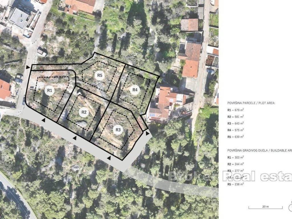 Na prodaju se nalaze četiri građevinska zemljišta na otoku Braču: R1 ima ukupnu površinu 679 m2 s time da je površina gradivog dijela 303 m2. – PRODANO! R2 ima ukupnu površinu 581 m2 s time da je površina gradivog dijela 244 m2. – PRODANO! R3 ima ukupnu površinu 640 m2 s time da je površina gradivog dijela 277 m2. – PRODANO! R4 ima ukupnu površinu 575 m2 s time da je površina gradivog dijela 231 m2.   Postoji prijedlog arhitektonskog rješenja za izgradnju vila na pojedinoj parceli maksimalne katnosti podrum, prizemlje i kat.   Zemljišta su smještena u neposrednoj blizini centra mjesta što ih čini izuzetno atraktivnim za investicije, idealno za razvoj projekata koji zahtijevaju blizinu ključnih prometnica i visok protok ljudi. Okružena mediteranskom šumom stvaraju jedinstvenu atmosferu idealnu za izgradnju objekata.   Infrastruktura na zemljištima je u potpunosti riješena, uključujući priključke za vodu, struju i kanalizaciju. Zemljišta imaju osiguran pristupni put što omogućava nesmetan dolazak do lokacije. Parcele pružaju savršen spoj mira i blizine svih potrebnih sadržaja kao što su restorani, dućani, bolnica, ljekarna itd a od mora su udaljena 500 metara zračne linije.   Izvrsna su prilika za ulaganje zbog svoje atraktivne lokacije kao i povećanja vrijednosti u budućnosti.