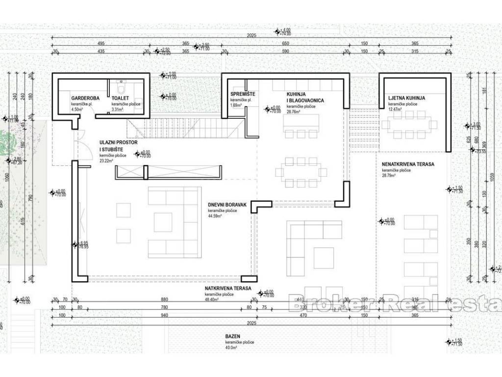 Prodaje se villa, smještena u mirnom naselju blizu Trogira, te predstavlja vrhunsku nekretninu modernog dizajna s ukupnom površinom od 456 m² na parceli od približno 640 m². Svaki detalj ove vile pažljivo je osmišljen kako bi pružio udobnost, funkcionalnost i luksuz.   Villu čine tri etaže. U podrumu se nalaze garaža, spremište i strojarnica, a dodatnu vrijednost prostoru daju teretana i wellness zona s kupaonicom i wc-om. Atrij omogućava protok prirodnog svjetla, čineći ovu razinu osvijetljenom i ugodnom.   Prizemlje je dizajnirano za druženje i opuštanje. Prostrani dnevni boravak povezan je s kuhinjom i blagovaonicom, dok dodatni sadržaji uključuju spremište, garderobu i wc. Vanjski prostor obogaćen je natkrivenom terasom od 48 m² i nenatkrivenom od 28 m², bazenom i ljetnom kuhinjom – savršeno za uživanje u toplim mediteranskim večerima.   Na prvom katu nalaze se tri spavaće sobe, svaka s vlastitom garderobom i kupaonicom, pružajući vrhunsku privatnost. Zeleni krov i natkrivena terasa dodatno ističu suvremeni i ekološki pristup dizajnu. Lokacija ville je idealna za one koji traže miran život uz prirodu i more, a istovremeno žele biti blizu sadržaja. Ovo malo mjesto nudi kristalno čisto more, prekrasne plaže i mogućnost uživanja u aktivnostima poput biciklizma, jedrenja i ronjenja. Blizina UNESCO-ovog Trogira i zračne luke Split čine ovu lokaciju izvrsnom za obiteljski odmor, stalan boravak ili investiciju u turistički najam.