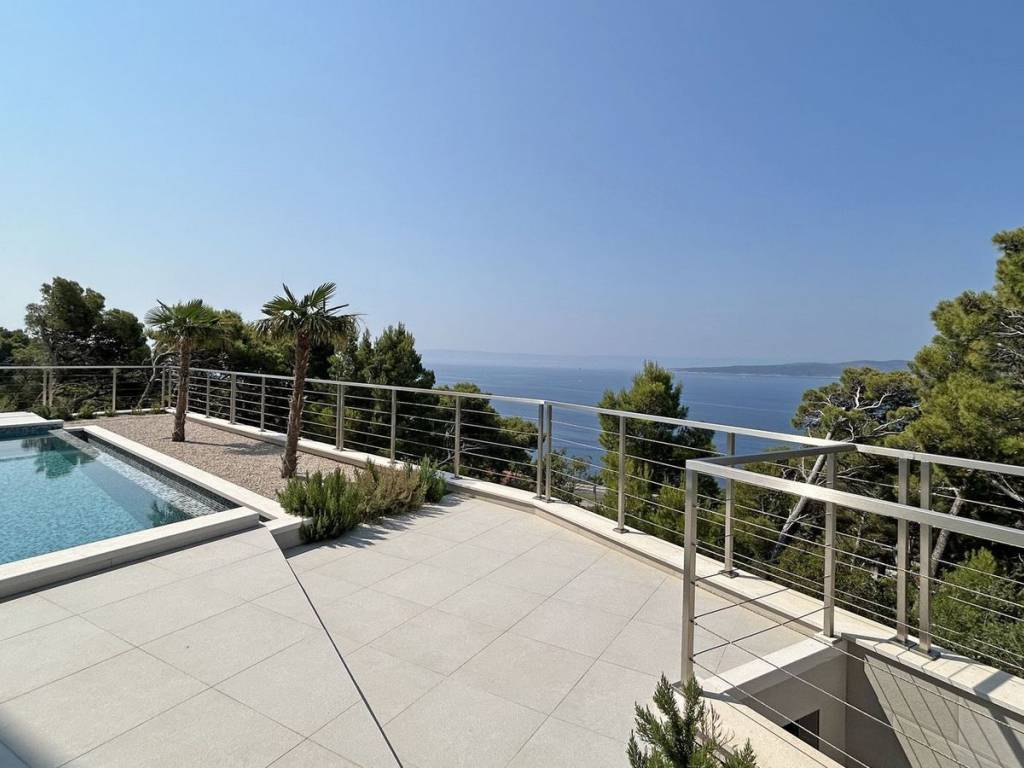 Luksuzna kuća s bazenom, smještena na predivnoj lokaciji podno Biokova s panoramskim pogledom na more. Proteže se na tri etaže ukupne stambene površine 400 m2, na parceli veličine 515 m2. Ova nekretnina nalazi se u mirnom djelu mjesta te budućim vlasnicima nudi oazu mira s veličanstvenim pogledom sa sve tri etaže. Podijeljena je u dvije stambene jedinice. Prva jedinca se sastoji od kuhinje s blagovaonicom i dnevnim prostorom iz kojeg se izlazi direktno na prostranu terasu s bazenom, sunčalištem, prostorom za roštilj i uživanje, te sobom predviđenom za saunu. Na prvom katu ove jedinice nalaze se tri spavaće sobe, svaka s pripadajućom kupaonicom i izlazom na balkon. Na trećoj etaži nalazi se druga zasebna jedinica s kuhinjom, blagovaonicom, dnevnom sobom i terasom ukupne površine 38 m2. Ova nekretnina je predivan spoj modernog uređenja i privatnosti. Nalazi se svega 400 metara od predivnih šljunčanih plaža, par minuta vožnje automobilom. Od centra Makarske udaljena je 13ak kilometra, što je čini savršeno pozicioniranom nekretninom za turističko iznajmljivanje, ali i svakodnevni život.