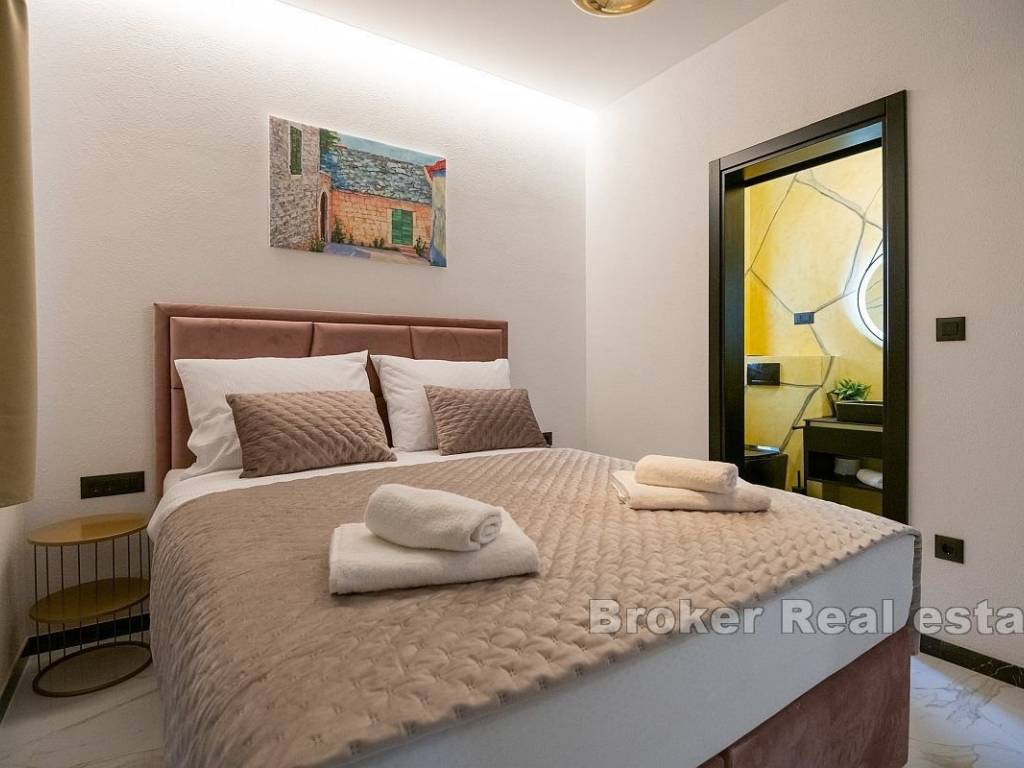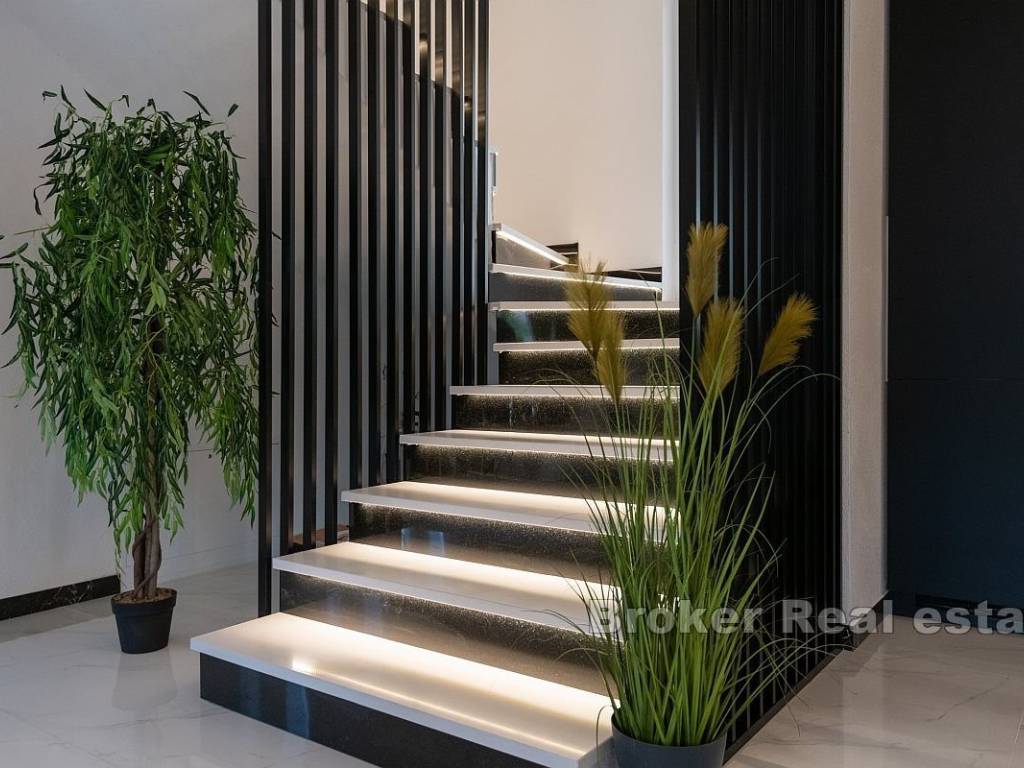 Ova novoizgrađena moderna luksuzna vila nudi savršen bijeg u prirodu, smještena samo 10 km od mora i Baške Vode. Uživajte u opuštanju u prostranom prizemlju koje uključuje dnevni boravak, kuhinju i blagovaonicu, te zabavite se u prostoru za bilijar. Za potpuni oporavak, tu je wellness soba sa saunom i jacuzzijem, kao i fitness soba za vježbanje. Na prvom katu vile smještene su četiri luksuzne spavaće sobe, svaka sa svojom kupaonicom i kadom, te očaravajućim pogledom na prirodu. Uz nju se nalazi i dodatni manji objekt sa svim potrebnim sadržajima za proslave, uključujući kuhinju, blagovaonicu s kaminom i WC. U sklopu ove luksuzne vile nalaze se dječje igralište i košarkaški teren, pružajući sjajne mogućnosti za igru i sport na otvorenom. Cijela vila odlikuje se vrhunskim modernim dizajnerskim namještajem koji osigurava iznimnu udobnost boravka. Cijela vila koristi podno grijanje za ugodan i topao boravak u svim prostorijama te posjeduje. Dodatno vila posjeduje I prostranu garažu sa izlazom na dvorište. Modro jezero, popularna turistička destinacija, nalazi se samo 17 km od objekta. Također, zahvaljujući brzoj povezanosti s autocestom, lako možete doći do mora, Baške Vode i Makarske. Centar grada s brojnim sadržajima udaljen je samo 1 km.