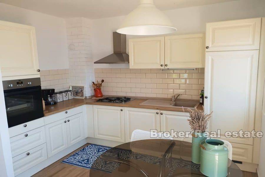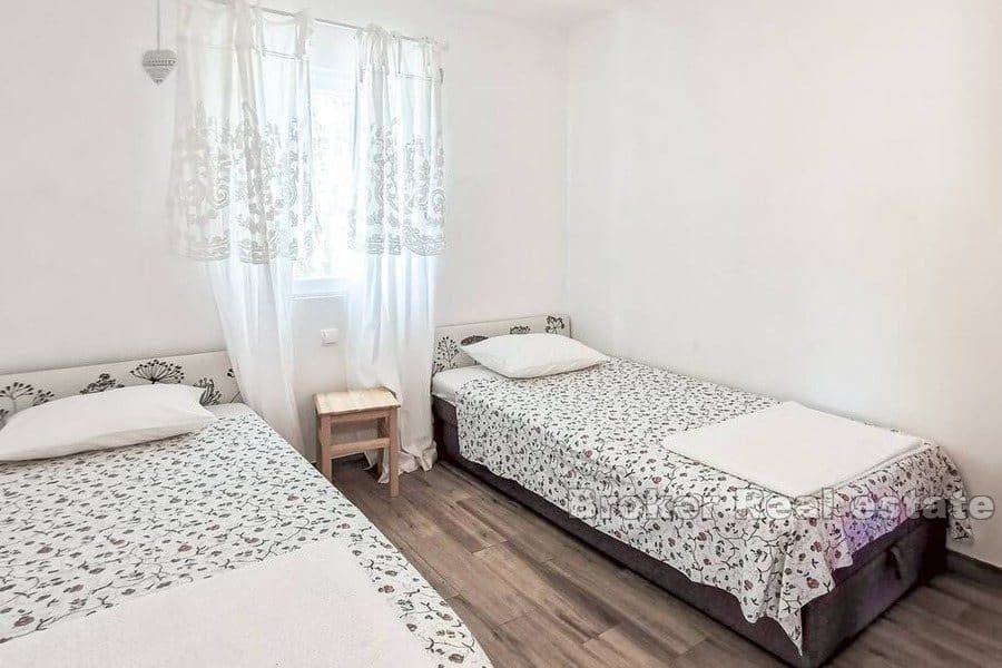 Kuća na osami, bez susjeda, prvi red do mora. U prodaju nudimo ovu nekretninu za sve ljubitelje mira i netaknute prirode. Kuća je smještena uz samo kristalno čisto more i stjenovitu obalu gdje se nalazi njeno sunčalište s pergolom. Smjestila se na zemljištu od 730m2 s dugom južnom frontom prema moru. Proteže se na dvije etaže: – U prizemlju je smještena kupaonica i ljetni dnevni boravak s izlazom na veliku natkrivenom terase s velikim stolom prostor predviđenim za ljetna obiteljska blagovanja na otvorenom s pogledom na more. – Na prvom katu koji ima zaseban ulaz nalaze se dvije sobe, kupaonica i dnevni boravak s kuhinjom i blagovaonicom opet s izlazom na južnu terasu te zapadnu terasu na kojoj se nalazi garnitura za sjedenje pod stablima rogača i badema koji tvore prirodan hlad u vrućim ljetnim mjesecima, idealan ljetni prostor za meditaciju i opuštanje. Kući pripada i visoko potkrovlje, trenutno neiskorišteno ali kao potencijalno dodatni stambeni prostor kao i dodatni pomoćni objekt od cc 20m2 smješten uz samu kuću, prostor koji trenutno služi kao rezervoar za vodu, trenutno, s obzirom na to da je vodovodna mreža došla nekoliko metara od same nekretnine te ju je ostalo samo sprovesti u kuću. Okućnica ove kuće pretvorene je u pravi malu mediteranski vrt s kamenom stazom, okružena starim dalmatinskim suhozidima, prepuna mediteranskog ljekovitog bilja, stabala maslina, rogača i badema s dosta kutaka na sebi za sjedenje i odmaranje kao i prostorom za roštilj. Parking za ovu kuću nalazi se pedesetak metara od nekretnine, na kraju mjesnog puta s čije točke se ide pješice do nekretnine što je garant toliko traženog mira i privatnosti. Trgovine i restorani udaljeni su na 15 minuta pješice od same nekretnine.