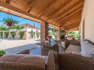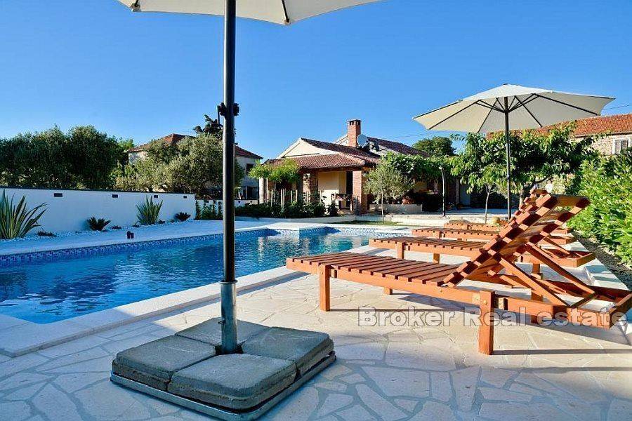 Prodaje se kuća s bazenom koja se nalazi u okolici Zadra. Izgrađeno 2019. s vrhunskim materijalima, ovo imanje prikazuje autentični kamen i ciglu, nadopunjeno opsežnom upotrebom drva unutar i izvan kuće. Smješten na parceli od 620 m2, stambeni prostor se proteže na 102 m2. Eksterijer ima privatni ulaz, prostrani parking, vrt i bazen. Prizemnica se sastoji od dva ulaza; jedan vodi u stambeni dio, a drugi u konobu. Kuća se sastoji od kuhinje i blagovaonice, dnevnog boravka, dvije prostrane spavaće sobe i dvije kupaonice. Poseban ulaz vodi u prostor za odmor, odnosno konobu sa vlastitim sanitarnim čvorom. Tijekom posljednje tri godine nekretnina se uspješno koristila u turističke svrhe, prikupivši izvrsne poslovne rezultate i recenzije – što je privlačan izgled za buduće vlasnike. Osim turističkog potencijala, ova rezidencija također može poslužiti u privatne svrhe, idealna za vikende ili praznike, zahvaljujući svom mirnom ambijentu i privatnosti.