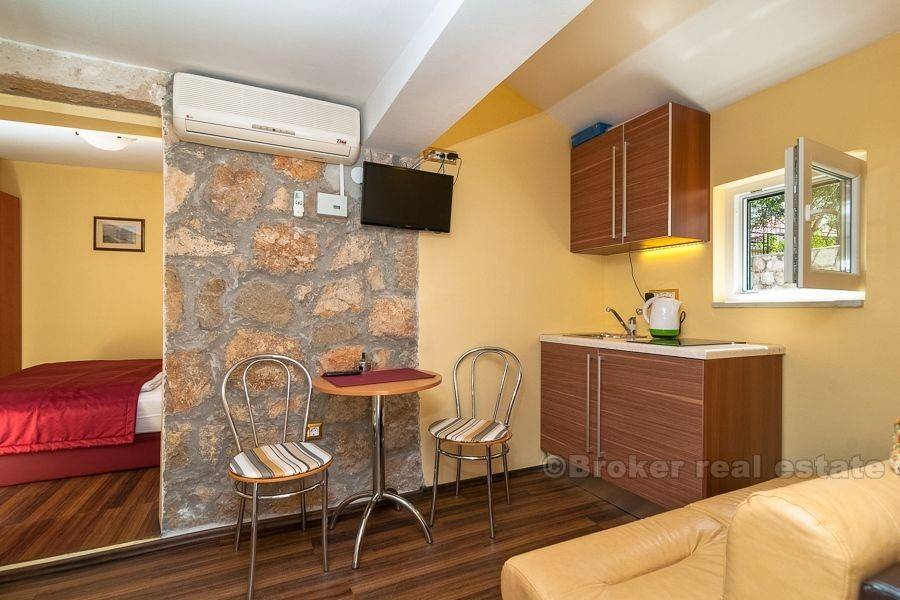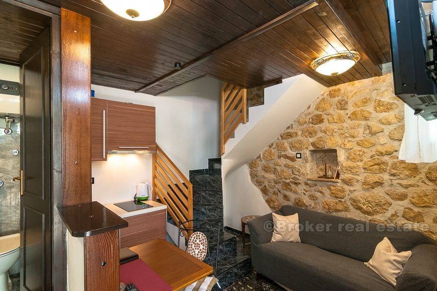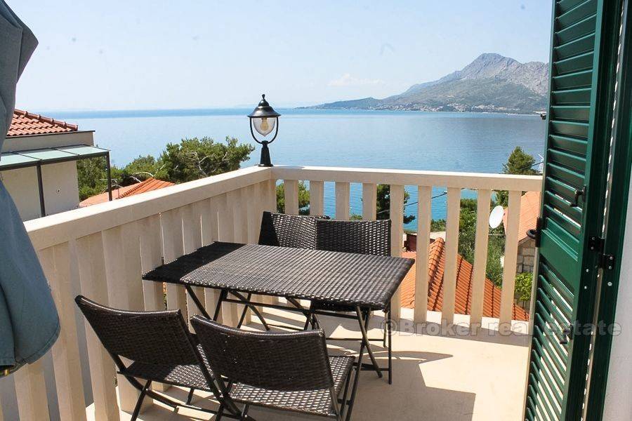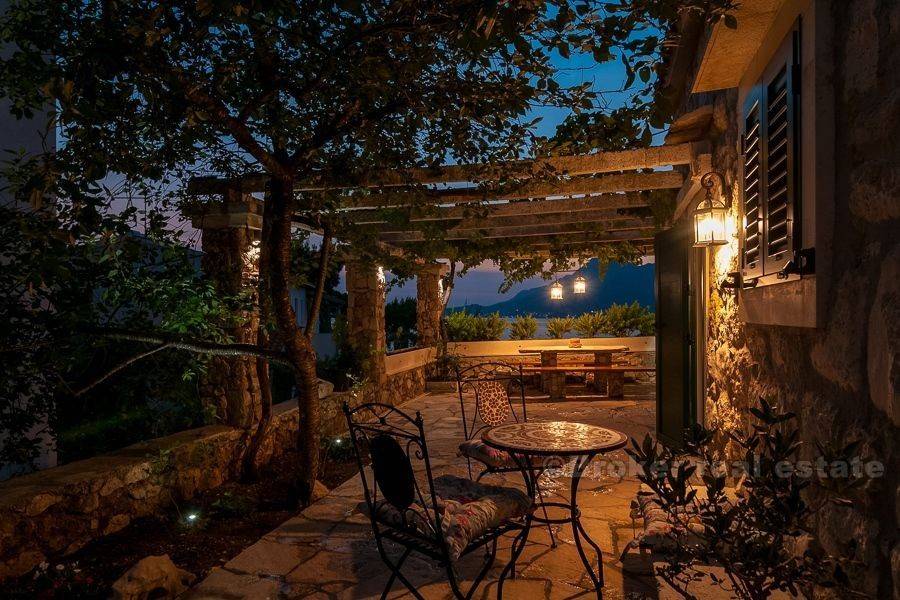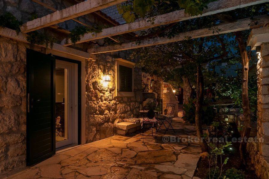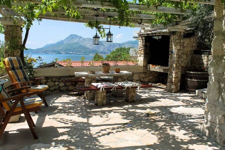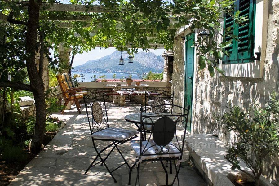 Tradicionalna, dalmatinska kamena kuća na Omiškoj rivijeri s očaravajućim pogledom na more, smještena samo 50 metara od prekrasne šljunčane plaže. Kuća je renovirana 2015. godine, potpuno namještena i opremljena (privatne stvari vlasnici nose sa sobom). Nekretninu čini jedna glavna jedinica/ kuća i pet odvojenih studio apartmana.  Tijekom renovacije korišteni su prvenstveno autohtoni materijali, poput kamena i drva, koji su naposljetku omogućili da kuća “vrvi” ugodnim i toplim ambijentom u kojem će se svi osjećati ugodno. Također su djelomično postavljene nove instalacije. Kuća ima uhodan posao u turizmu, te je kao takva izvrsna prilika za investiciju i povrat uloženog novca. Orijentacija kuće je istok-zapad. Do nekretnine ima vrlo dobar pristup asfaltiranom cestom. Posebnu čar  joj daje lijepo uređena konoba u podrumu kuće, gdje se nalazi i mala špilja, koju su vlasnici prilikom renovacije zadržali u izvornom obliku. Vanjski prostor čini lijepo uređen dvor, s otvorenim kaminom, pažljivo uređenom hortikulturom i vrtnom garniturom, odakle se pruža otvoreni pogled na more. Jedinstvena oaza mira, kao stvorena za uživanje s prijateljima i obiteljsko druženje. Kući pripada garaža i tri vanjska parkirna mjesta.   Ova šarmantna kuća odiše pravom dalmatinskom atmosferom u koju se lako zaljubiti na prvi pogled.