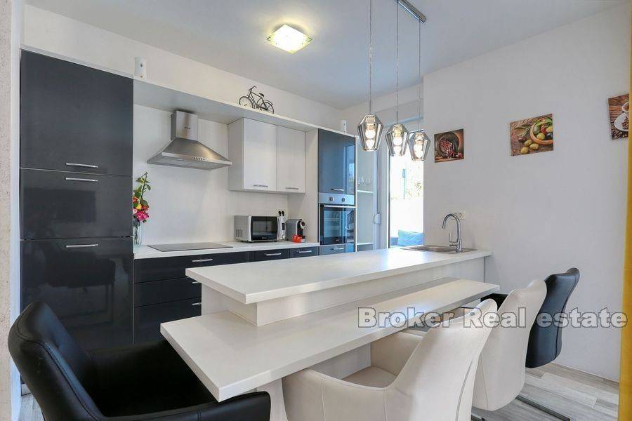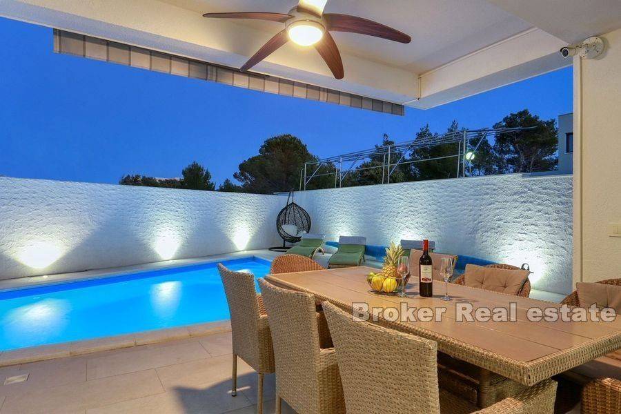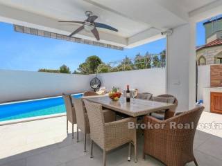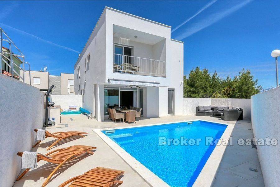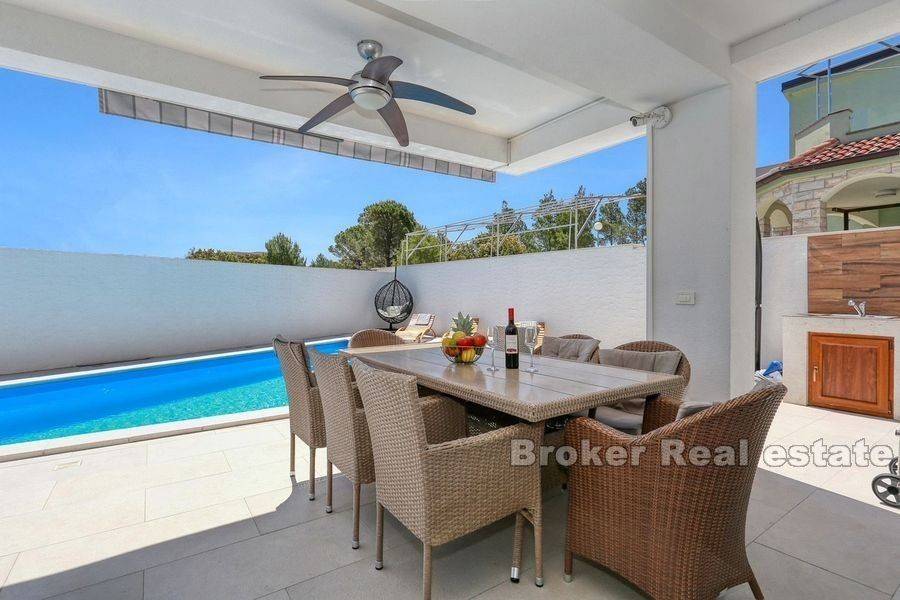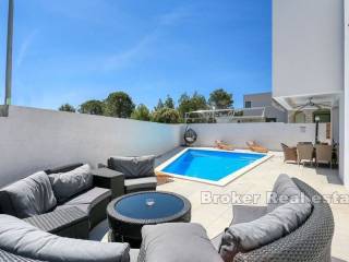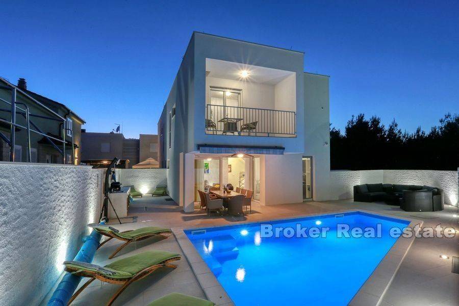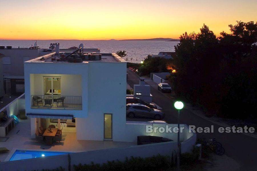 Na prodaju je moderno uređena dvojna vila smještena u blizini Zadra na zemljištu površine 127 m2. Vila je dvojni objekt a godina izgradnje je 2019. god. Prostire se na dvije vrhunski opremljene etaže čiji je ukupni stambeni prostor 136 m2. Radi se o moderno opremljenom interijeru s kvalitetnim namještajem. Na prvoj etaži se nalazi prostrana kuhinja s blagovaonicom te dnevni boravak s izlazom na vanjsku terasu na kojoj se nalazi bazen kojeg okružuje vanjski namještaj. Na drugoj etaži nalaze se tri spavaće sobe te četiri kupaonice. Nekretnini pripada dva parking mjesta. Nalazi se u blizini svih bitnih sadržaja: dućana, restorana, plaže a od centra Zadra udaljena je 12 km. Vila je udaljena od mora 150 metara a od zračne luke Zadar 20 km. Odličan projekt koji pruža mnogo mogućnosti: može se koristiti za svrhe turističkog najma, za ugodan obiteljski odmor ali i za stanovanje.
