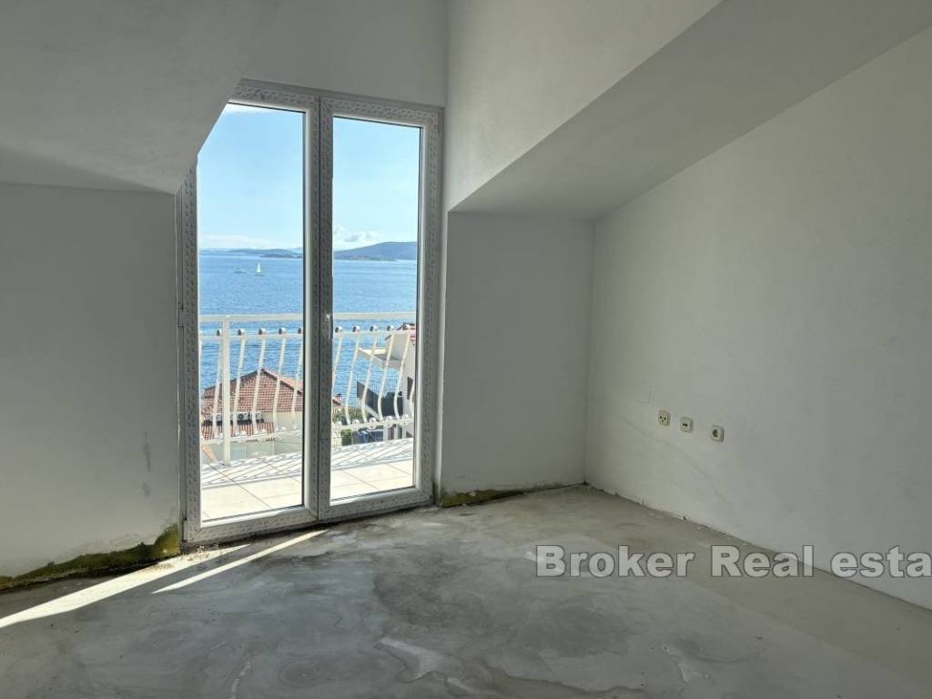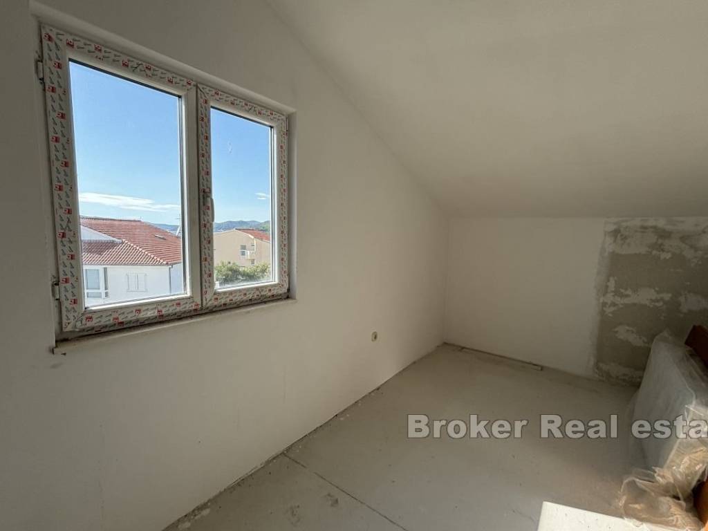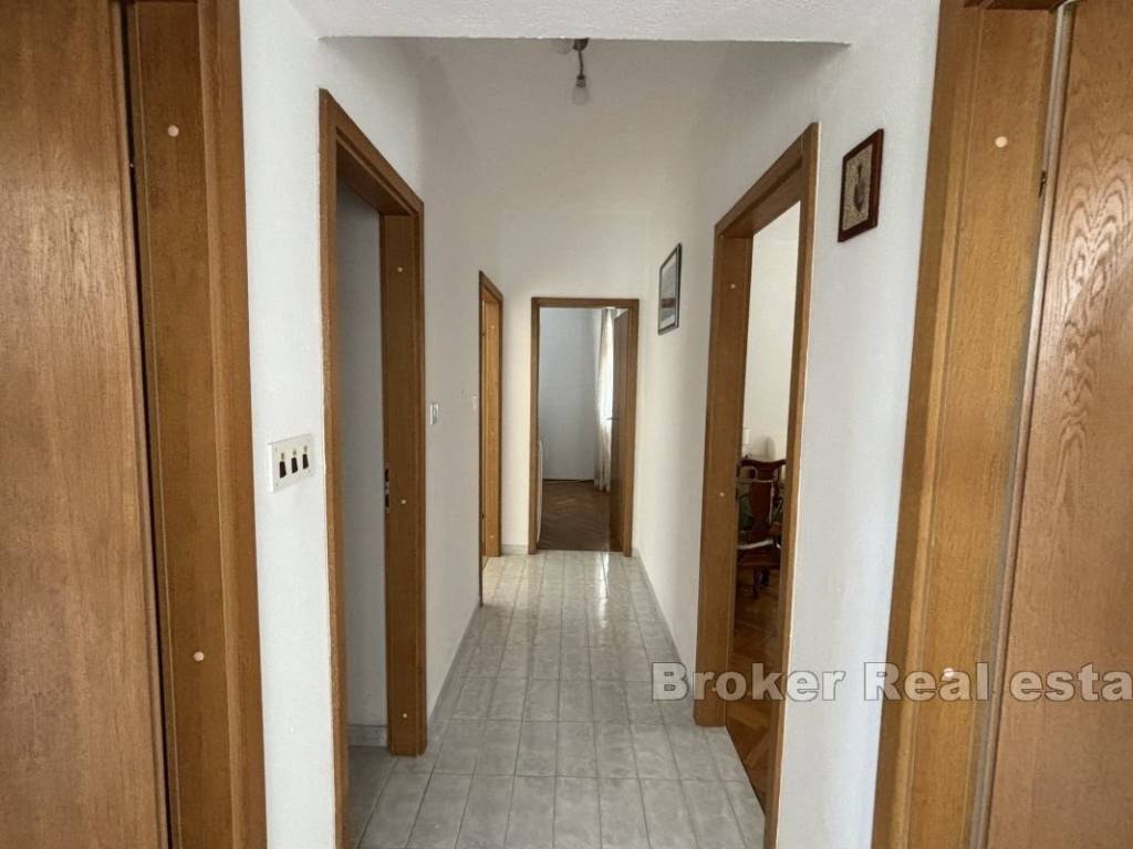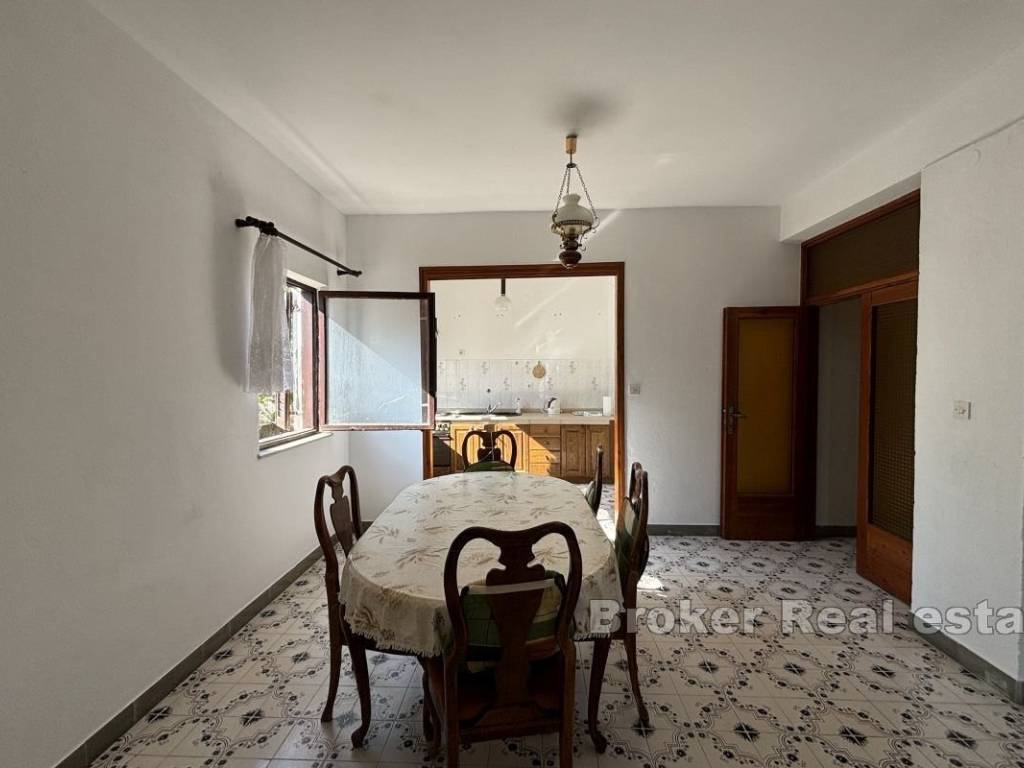 Na prodaju je kuća s pogledom na more smještena u mjestu pokraj grada Trogira. Riječ je o nekretnini koja se proteže na tri etaže i ima ukupnu stambenu površinu od 330 m2. Nekretnina se nalazi na zemljištu od 520 m2. Prva etaža sastoji se od velikog dnevnog boravka s kuhinjom i blagovaonicom, kupaonice, ostave i terase. Unutarnjim stubištem dolazi se na drugu etažu, prvi kat, na kojem su smještene dvije spavaće sobe, kuhinja, dnevni boravak, kupaonica i dvije ostave. Ova etaža također ima i dvije terase. Na trećoj, posljednjoj etaži smještena su dva jednosobna apartmana. Ova etaža je trenutačno u roh bau stanju. Također posjeduje i  terasu. Iz svih stanova pruža se pogled na more. Sve etaže povezane su unutarnjim stubištem. Nekretnina posjeduje i garažu za dva automobila i također dva vanjska parkirna mjesta. Od mora je udaljena svega 100 m. U neposrednoj blizini nalaze se trgovine i razna gradska kupališta. Od Zračne Luke Split udaljena je 9 kilometara.