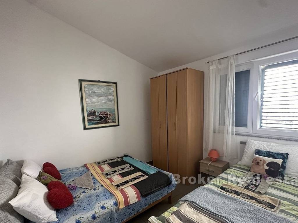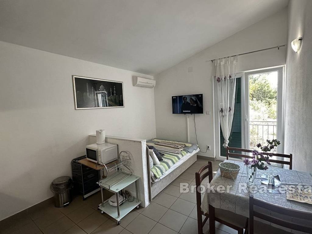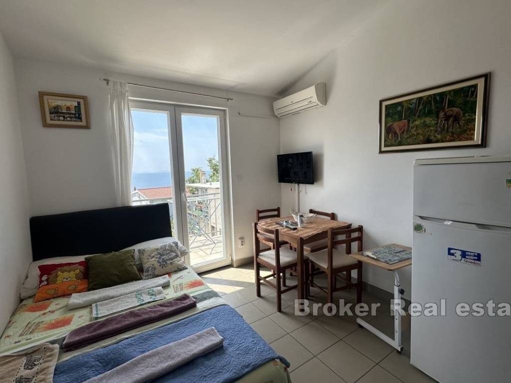 Prodaje se apartmanska kuća s 9 stambenih jedinica u blizini Omiša. Nekretnina je smještena na zemljištu površine 891 m2 na udaljenosti od samo 200 metara od mora, s otvorenim pogledom.   Na svakoj etaži nalaze se tri apartmana, po dva manja i jedan veci. Svaki apartman ima izlaz na privatni balkon s pogledom i jedno parkirno mjesto.   Prostrana okućnica nudi mogućnost gradnje još jednog manjeg objekta uz već postojeću kuću, spremište iza kuće i haciendu s pogledom na more i jacuzzijem.