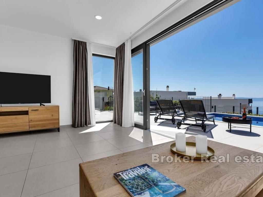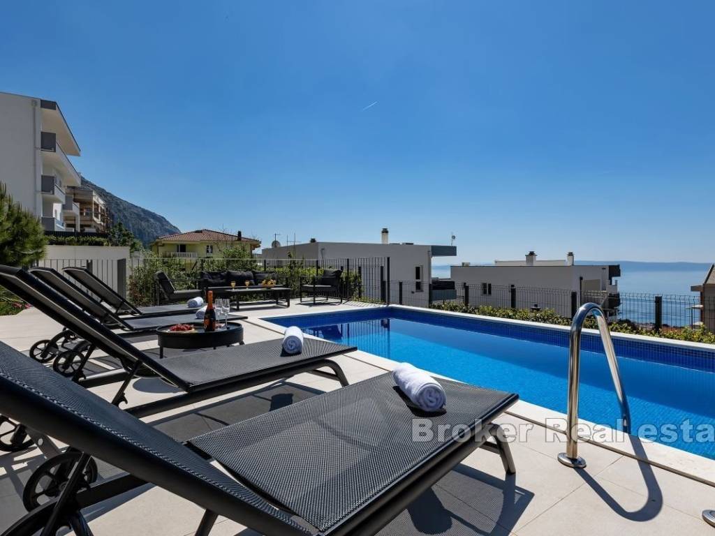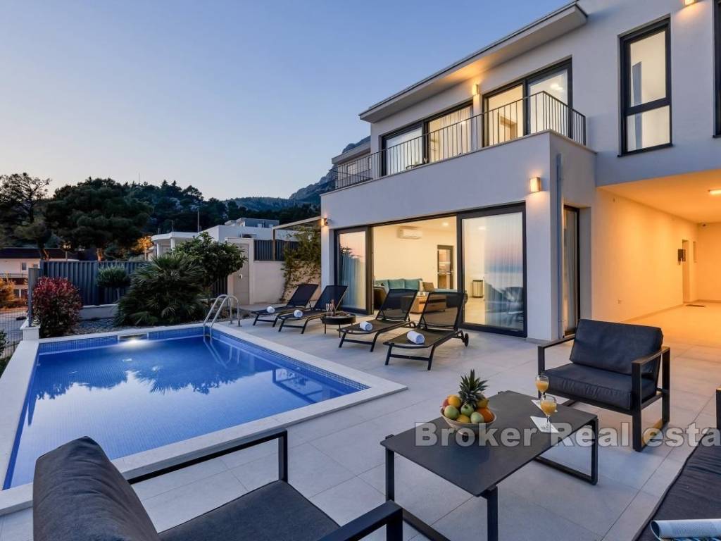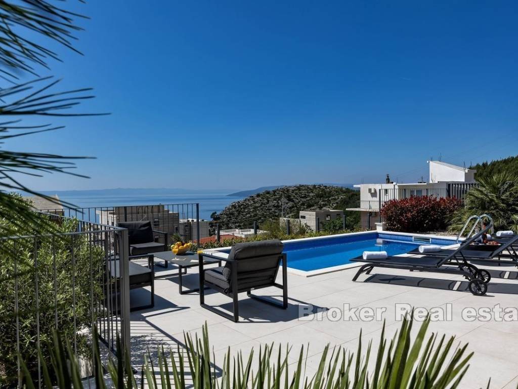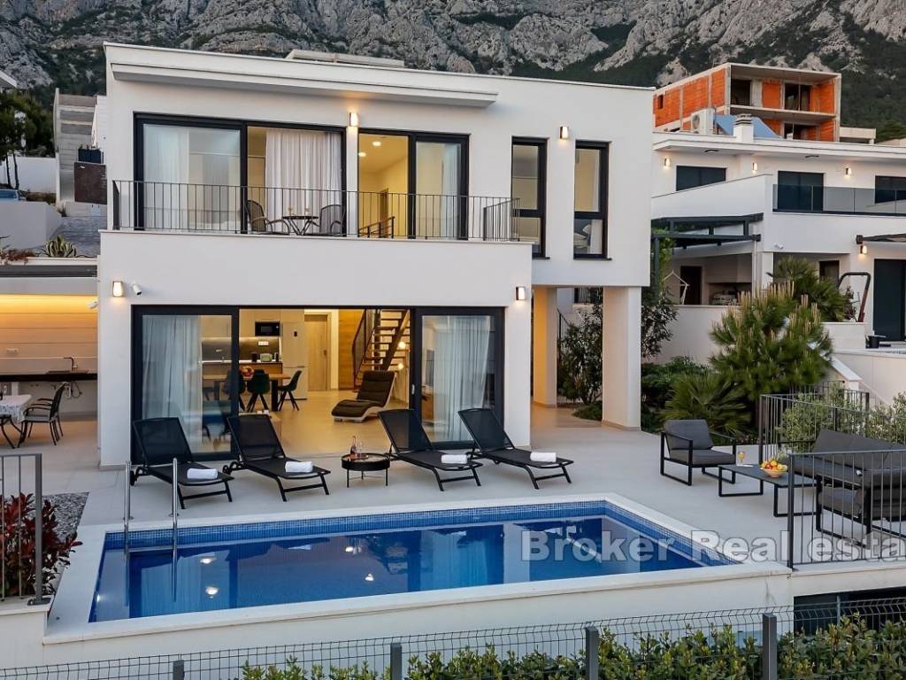 U prodaju se nudi ograđena vila za odmor, ekskluzivna vila koja ima panoramski pogled na kristalno more i nalazi se u blizini mjesta Makarska, pored Omiša i Splita. Pozicionirana je na južnoj strani te odiše najvišom udobnošću, modernim interijerom i elegantnim dizajnom. Nudi idealan moderan ambijent uz jedinstven pogled na mediteransku obalu. Uz puno pozornosti u detaljima interijera i eksterijera, moderne tehničke opreme, najnovijih građevinskih materijala s čarobnim dodirom glamura, ova vila pruža luksuzni odmor za svaku obitelj. Izgrađena je na dvije etaže. Sastoji se od 4 prostorne spavaće sobe, 3 kupaonice, bazena i kvalitetnog vrtnog namještaja, balkona te otvorene i djelomično natkrivene terase i 4 vanjska parkirna mjesta. U prizemlju se nalazi prostrani dnevni boravak za večernja druženja, blagovaonica i kuhinja iz koje možete izaći na djelomično otvorenu terasu za opuštanje s bazenom. Nalazi se i 1 kupaonica. Vila je potpunosti klimatizirana te se naziva pametna kuća jer sva tehnika funkcionira po digitalnom principu. Ima sustav automatskog navodnjavanja okoliša, postavljene video kamere i podno grijanje. Na prvom katu nalaze se 4 prostrane spavaće sobe s 2 kupatila. Objekt se prodaje sa svim opremljenim i namještenim visokokvalitetnim interijerom i eksterijerom (kućanskim aparatima, flat screen televizorima, led rasvjetom,sustavom za automatsko hlađenje itd). Vlasnik daje u vlasništvo sve svoje portale i stranice na kojima je iznajmljivao godinama vilu tijekom ljetne sezone. Nekretnina je jedinstven izbor zbog južne pozicije/mediteranske klime, panoramskog pogleda na čisto more, arhitekture objekta i brojnih pješčanih plaža u blizini. Mjesto je s udaljenošću do najbližeg većeg grada Splita od 50 km i zračne luke Split od 70 km.