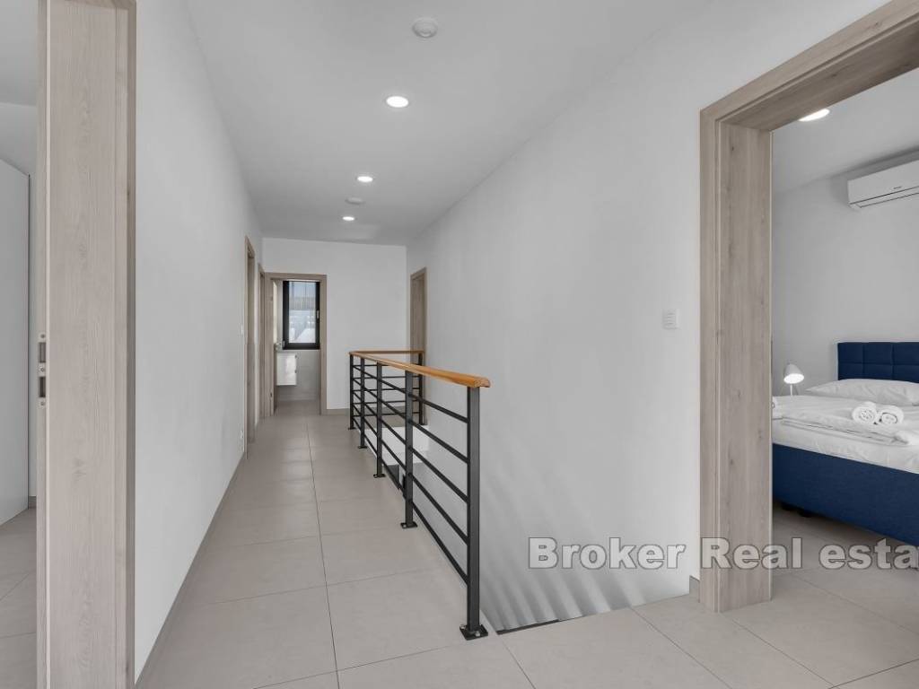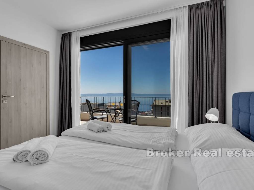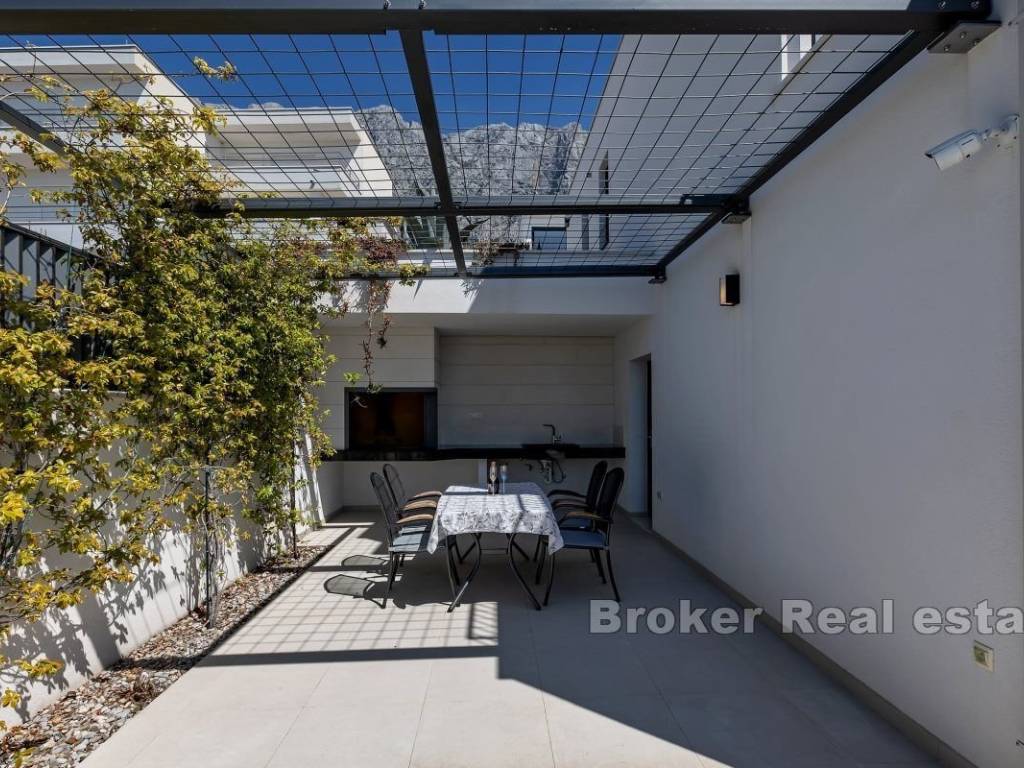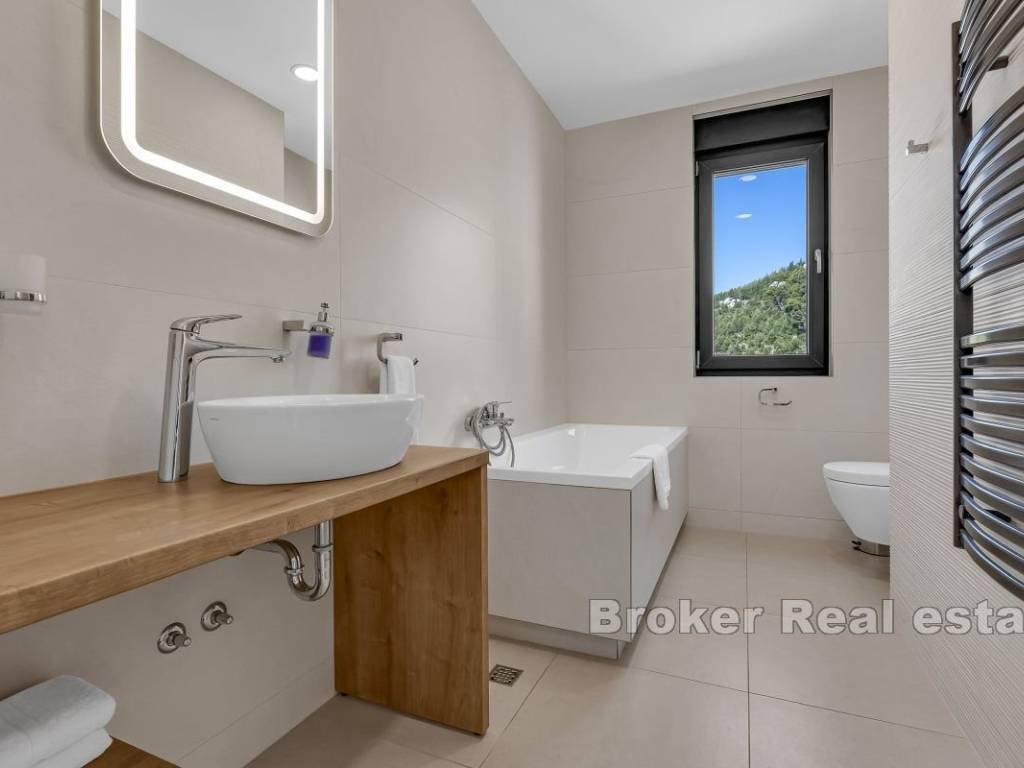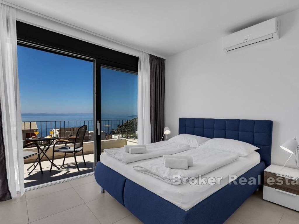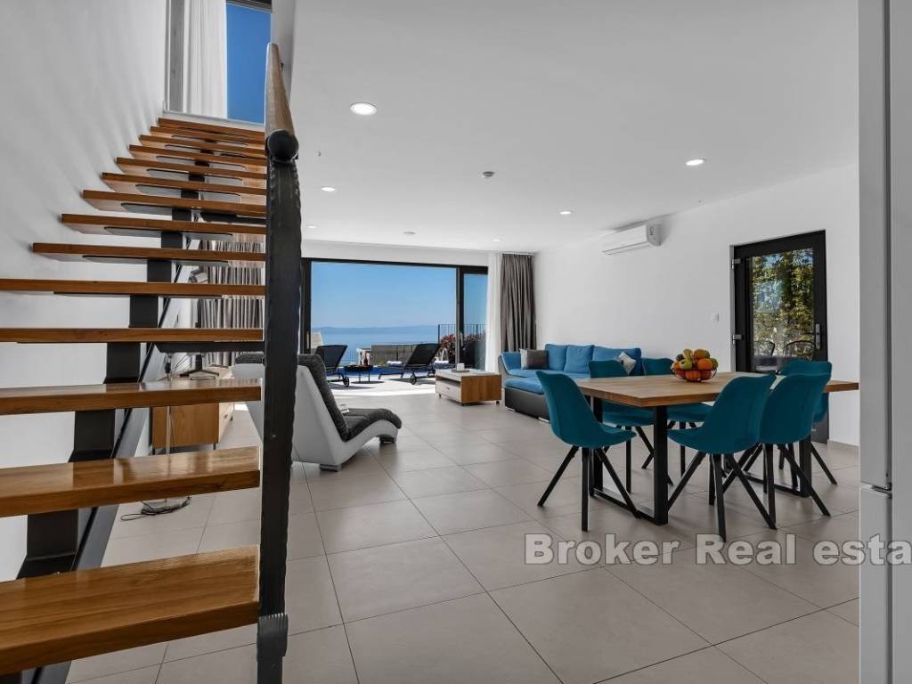 U prodaju se nudi ograđena vila za odmor, ekskluzivna vila koja ima panoramski pogled na kristalno more i nalazi se u blizini mjesta Makarska, pored Omiša i Splita. Pozicionirana je na južnoj strani te odiše najvišom udobnošću, modernim interijerom i elegantnim dizajnom. Nudi idealan moderan ambijent uz jedinstven pogled na mediteransku obalu. Uz puno pozornosti u detaljima interijera i eksterijera, moderne tehničke opreme, najnovijih građevinskih materijala s čarobnim dodirom glamura, ova vila pruža luksuzni odmor za svaku obitelj. Izgrađena je na dvije etaže. Sastoji se od 4 prostorne spavaće sobe, 3 kupaonice, bazena i kvalitetnog vrtnog namještaja, balkona te otvorene i djelomično natkrivene terase i 4 vanjska parkirna mjesta. U prizemlju se nalazi prostrani dnevni boravak za večernja druženja, blagovaonica i kuhinja iz koje možete izaći na djelomično otvorenu terasu za opuštanje s bazenom. Nalazi se i 1 kupaonica. Vila je potpunosti klimatizirana te se naziva pametna kuća jer sva tehnika funkcionira po digitalnom principu. Ima sustav automatskog navodnjavanja okoliša, postavljene video kamere i podno grijanje. Na prvom katu nalaze se 4 prostrane spavaće sobe s 2 kupatila. Objekt se prodaje sa svim opremljenim i namještenim visokokvalitetnim interijerom i eksterijerom (kućanskim aparatima, flat screen televizorima, led rasvjetom,sustavom za automatsko hlađenje itd). Vlasnik daje u vlasništvo sve svoje portale i stranice na kojima je iznajmljivao godinama vilu tijekom ljetne sezone. Nekretnina je jedinstven izbor zbog južne pozicije/mediteranske klime, panoramskog pogleda na čisto more, arhitekture objekta i brojnih pješčanih plaža u blizini. Mjesto je s udaljenošću do najbližeg većeg grada Splita od 50 km i zračne luke Split od 70 km.