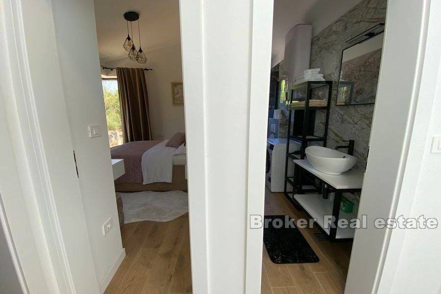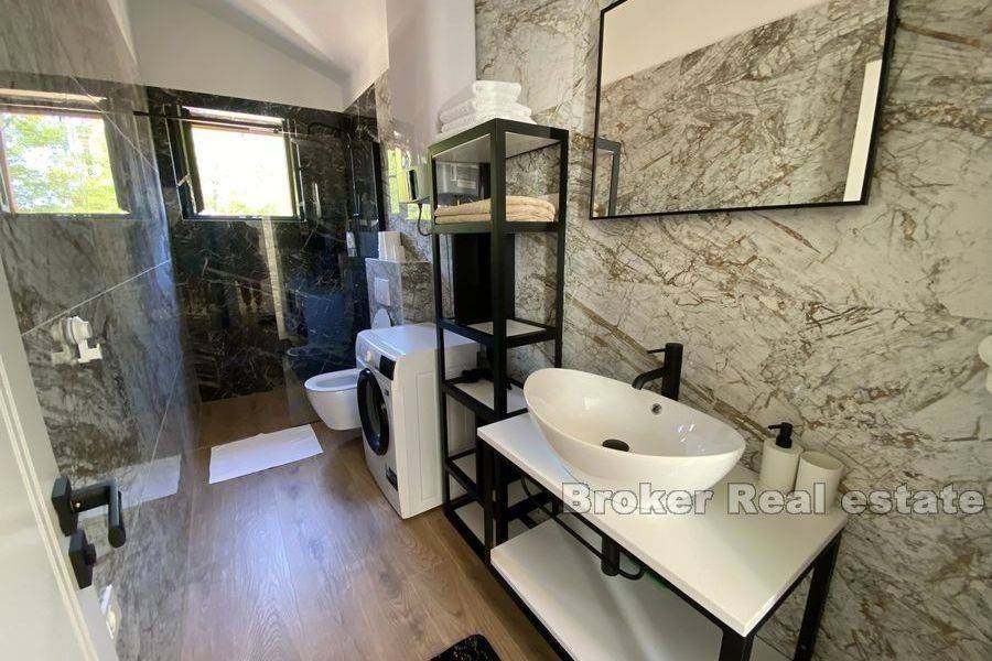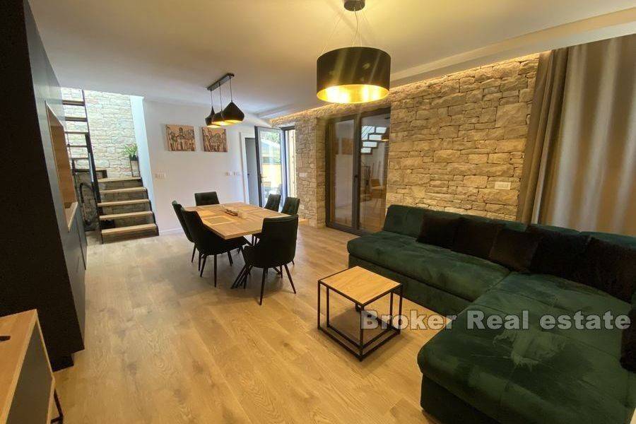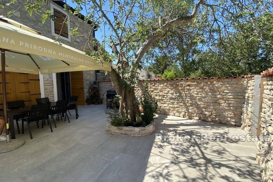 Predivna kamena kuća u novogradnji u blizini Zadra. Jedinstvena i uistinu zanimljiva kuća smještena na parceli od 158m2 sa bazenom i vlastitim parkingom. Smjestila se na području koje odiše mirnoćom i privatnošću dok su ujedno svi bitni sadržaji u neposrednoj blizini. Nekretnina je građena od renomiranih materijala poput kamena sa vojarne iz 1905. godine koje je kombinirano sa reflektirajućim staklom koje sakriva unutrašnjost. Pri uređenju interijera i eksterijera kuće korišteni su materijali iznimne kakvoće. Vrata i prozori napravljeni su od Sibirskog bora, za okvir vrata koristio se pravi bijeli kamen koji je pomogao pri izolaciji i debljini zida od 54cm, dok se puni hrast iskoristio za unutarnje stubište. Kuća ukupne stambene površine 102m2 sastoji se od kuhinje, blagovaonice, dvije spavaće sobe i dvije kupaonice. Nekretnina je opremljena strojnim podnim grijanjem uz dodatna 3 klima uređaja. Kući pripada bazen od 23m2 sa tamnom podlogom za dodatan efekt i dizalicom topline koja se može regulirati. S ovom uistinu zanimljivom nekretninom dobiti ćete potpuni osjećaj doma ne samo uz savršenu kombinaciju modernog i autohtonog, već i uz okolinu i prirodu koja je okružuje. Centar mjesta i more nalaze se na udaljenosti od 400 metara od kuće dok je Zadar udaljen manje od 20 kilometara i zračna luka 30 kilometara.