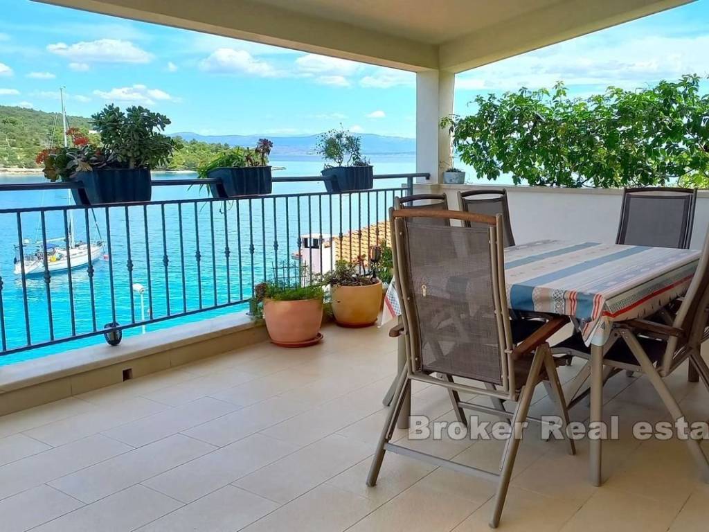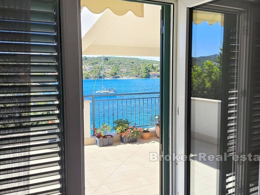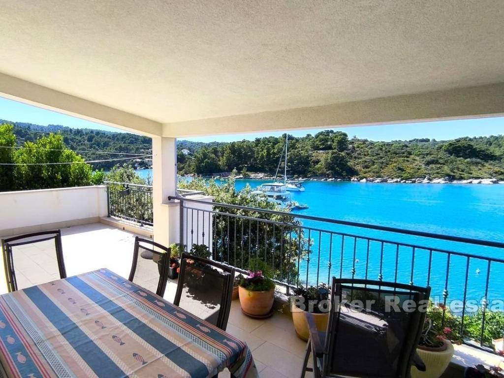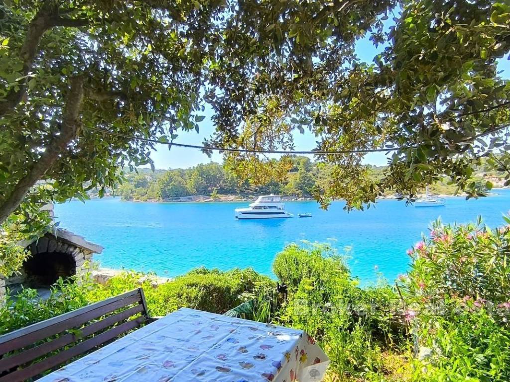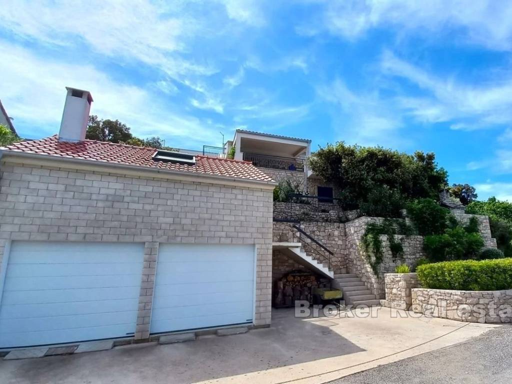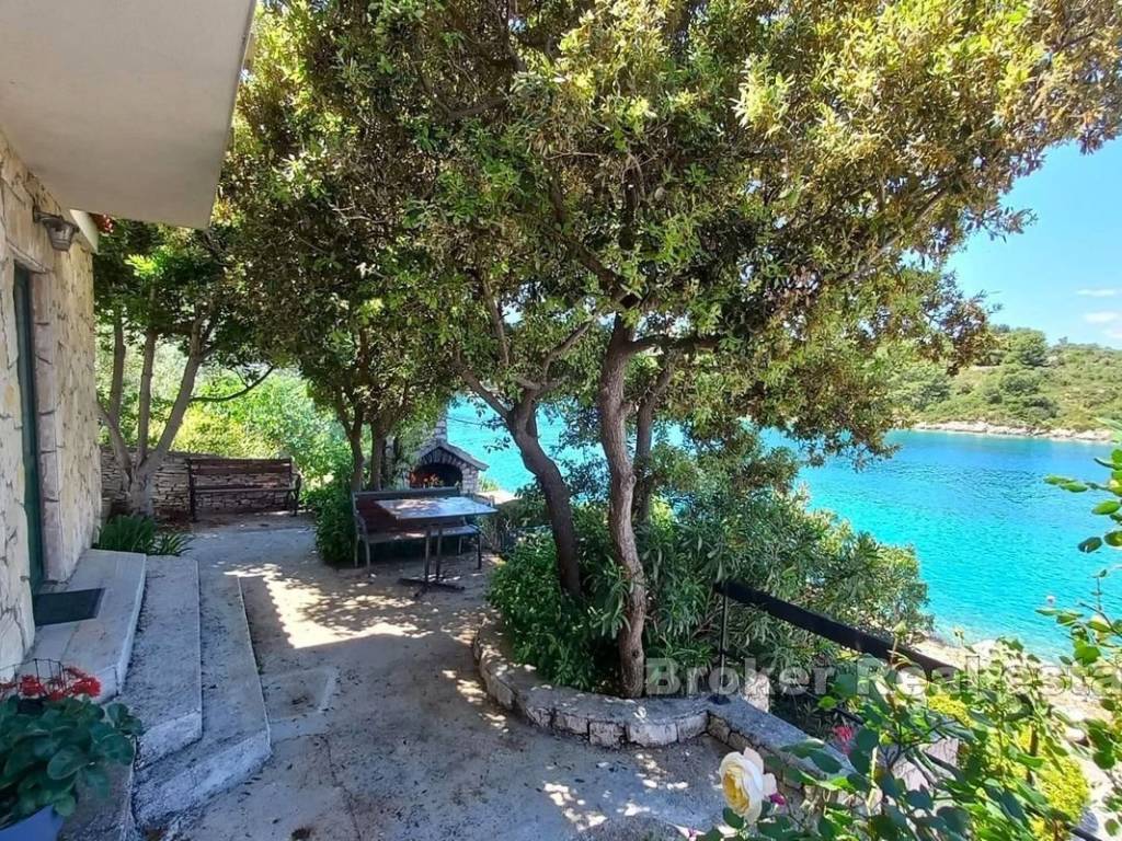 Kuća na otoku Šolti uz samo more i plažu.   Kuća se nalazi na odličnoj poziciji, u prekrasnoj uvali zaštićenoj od svih vjetrova. Uvala je mirna bez puno prometa, s pristupnim putem kojeg koriste samo vlasnici nekretnina u prvom redu do mora. Ispred kuće napravljeno je komforno sunčalište predviđeno za vlasnika i njegove goste.   Sama kuća nalazi se na zemljištu od 610m2 kompletno je renovirana  i opremljena.   Na zemljištu se nalazi više objekata i izgrađenih kamenih terasa: Odmah na ulazu u posjed nalazi se manja kuca tlocrtne površine 35m2 čije je prizemlje pretvoreno u garažni prostor predviđen za dva automobila. Na katu ove manje kuće nalazi se prostor za obiteljska druženja i blagovanja. velika blagovaonica s kuhinjom i velikim kaminom uz pripadajući wc..uz ovaj objekt nalazi se i dodatna vanjska parking mjesta.   Kamenim stepeništem dolazi se do prizemlja glavne kuće gdje se nalazi prostor pretvoren u zaseban studio apartman od 21m2 s velikom terasom ispred, gdje se nalazi i vanjski roštilj. Uz ovaj dio nalazi se i dodatna prostorije od 17m2 u funkciji velikog spremnika za vodu kojeg vlasnici trenutno koriste samo za zalijevanja vrta a u slučaju potrebe može se iskoristiti za proširenje ovog studio apartmana.   Prvi kat kuće pretvoren je u komforni trosobni stan od cca 140m2 s dva kupatila i prostranim dnevnim prostorom koji ima izlaz na veliku terasu s koje se pruža otvoren pogled na more i cijelu  uvalu. Prostor za strojarnicu nalazi se uz ovu etažu (centralno grijanje Buderus najviše kvalitete na drva, centralno grijanje na struju, akumulacija 800L vode, bojler grijan solarnim panelom).   Na drugom katu kuće nalazi se veliko potkrovlje zasebnog ulaza od 115m2 + balkon 8m2. Ovaj dio novi vlasnici mogu urediti i prenamijeniti u dodatni stambeni prostor s obzirom da su sve instalacije već dovedene dok su na samom krovu već predviđeni otvori za luminare.   Okućnica je dovoljno velika s većim brojem održavanih zelenih površina i vrtova ugodnih za odmor i zabavu.   Odlična pozicija, odvojena od centra mjesta a opet na samo 5 minuta od svih sadržaja,trgovine i restorana.