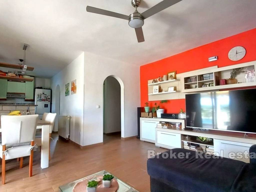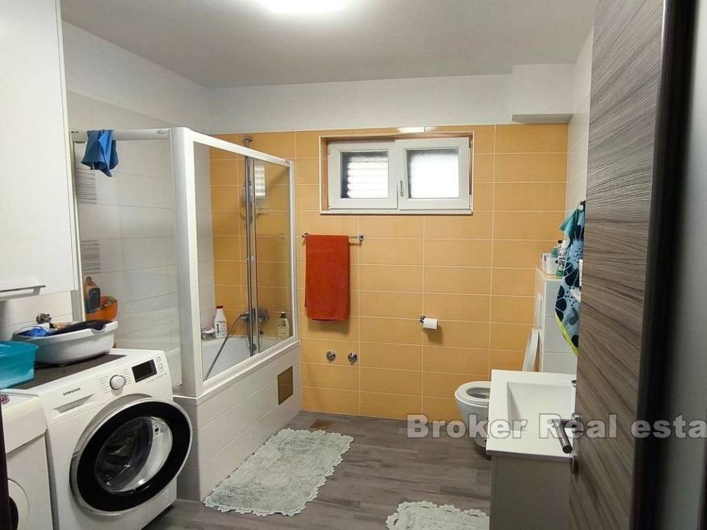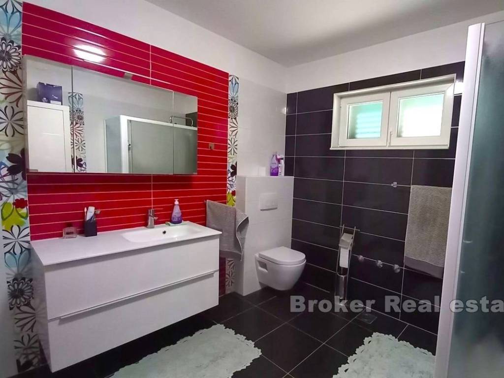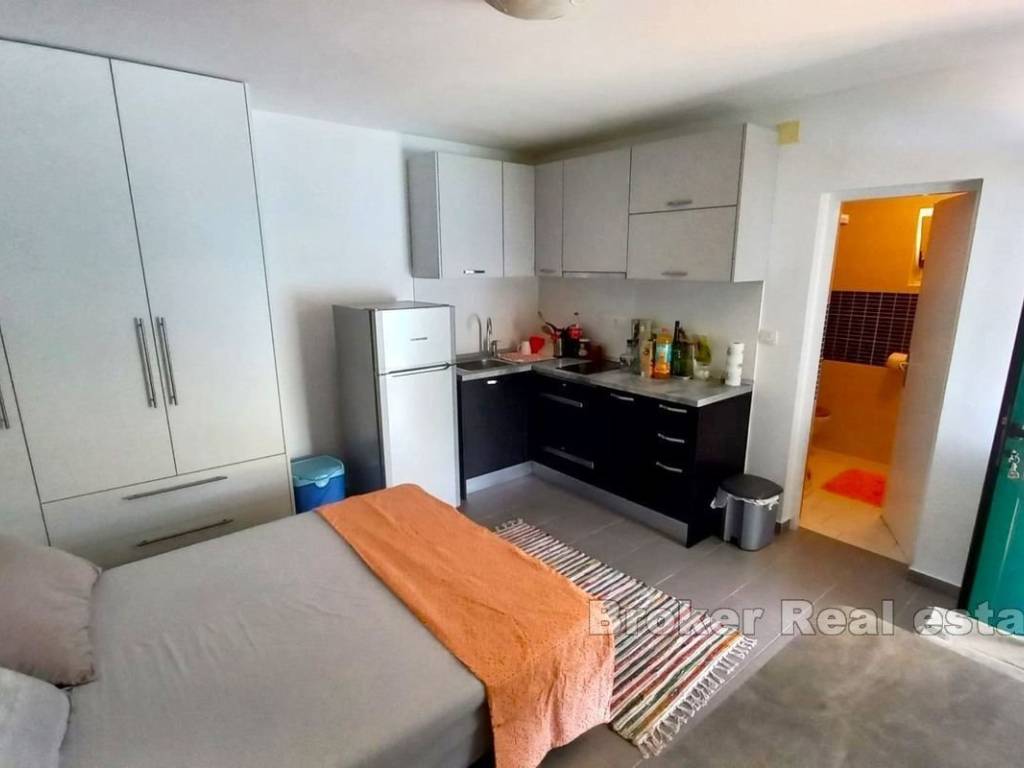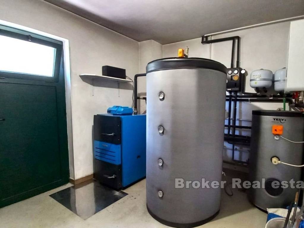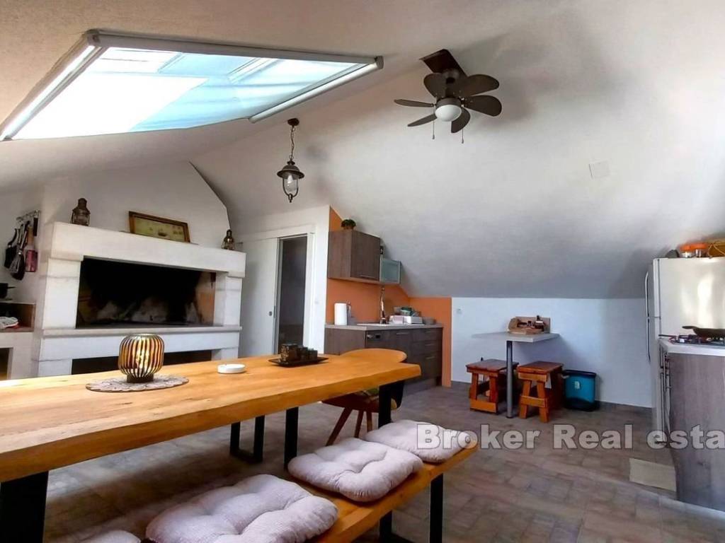 Kuća na otoku Šolti uz samo more i plažu.   Kuća se nalazi na odličnoj poziciji, u prekrasnoj uvali zaštićenoj od svih vjetrova. Uvala je mirna bez puno prometa, s pristupnim putem kojeg koriste samo vlasnici nekretnina u prvom redu do mora. Ispred kuće napravljeno je komforno sunčalište predviđeno za vlasnika i njegove goste.   Sama kuća nalazi se na zemljištu od 610m2 kompletno je renovirana  i opremljena.   Na zemljištu se nalazi više objekata i izgrađenih kamenih terasa: Odmah na ulazu u posjed nalazi se manja kuca tlocrtne površine 35m2 čije je prizemlje pretvoreno u garažni prostor predviđen za dva automobila. Na katu ove manje kuće nalazi se prostor za obiteljska druženja i blagovanja. velika blagovaonica s kuhinjom i velikim kaminom uz pripadajući wc..uz ovaj objekt nalazi se i dodatna vanjska parking mjesta.   Kamenim stepeništem dolazi se do prizemlja glavne kuće gdje se nalazi prostor pretvoren u zaseban studio apartman od 21m2 s velikom terasom ispred, gdje se nalazi i vanjski roštilj. Uz ovaj dio nalazi se i dodatna prostorije od 17m2 u funkciji velikog spremnika za vodu kojeg vlasnici trenutno koriste samo za zalijevanja vrta a u slučaju potrebe može se iskoristiti za proširenje ovog studio apartmana.   Prvi kat kuće pretvoren je u komforni trosobni stan od cca 140m2 s dva kupatila i prostranim dnevnim prostorom koji ima izlaz na veliku terasu s koje se pruža otvoren pogled na more i cijelu  uvalu. Prostor za strojarnicu nalazi se uz ovu etažu (centralno grijanje Buderus najviše kvalitete na drva, centralno grijanje na struju, akumulacija 800L vode, bojler grijan solarnim panelom).   Na drugom katu kuće nalazi se veliko potkrovlje zasebnog ulaza od 115m2 + balkon 8m2. Ovaj dio novi vlasnici mogu urediti i prenamijeniti u dodatni stambeni prostor s obzirom da su sve instalacije već dovedene dok su na samom krovu već predviđeni otvori za luminare.   Okućnica je dovoljno velika s većim brojem održavanih zelenih površina i vrtova ugodnih za odmor i zabavu.   Odlična pozicija, odvojena od centra mjesta a opet na samo 5 minuta od svih sadržaja,trgovine i restorana.