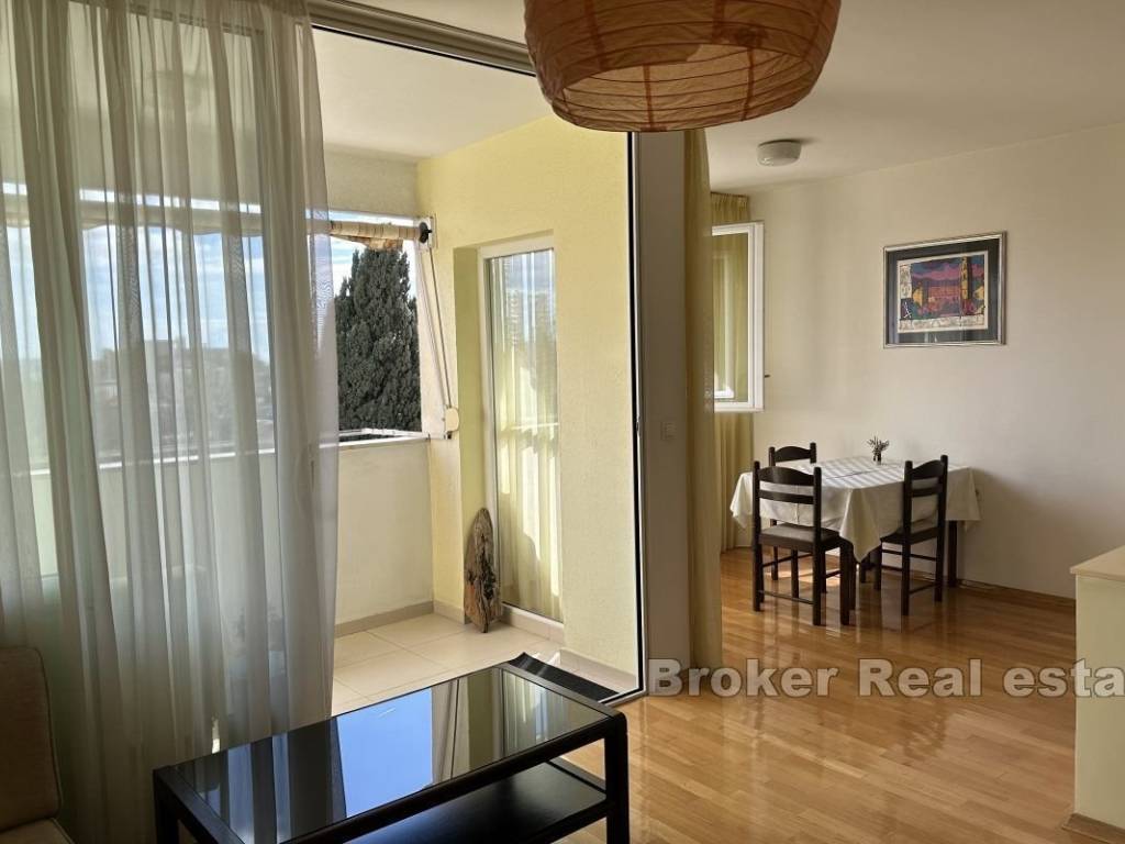 Osunčani dvosoban stan, 65m2 sa loggiom. Smješten na petom katu manje stambene zgrade. Ovaj elegantan dom nudi izuzetno funkcionalan raspored prostorija i udobnost. Sastoji se od ulaznog djela, kuhinje s blagovaonicom i dnevnim boravkom otvorenog koncepta. Dvije prostrane spavaće sobe pružaju privatnost, sjeverno orijentirane, te kupaonice. Orijentacija stana prema jugu i sjeveru omogućuje obilje prirodne svjetlosti tijekom cijelog dana, stvarajući ugodnu atmosferu i osjećaj prozračnosti. Nedavno renoviran, ovaj stan nudi osjećaj novosti i svježine. Sve instalacije i cijevi su promijenjene. Stanu pripada drvarnica u podrumu objekta, koja je odlična kao dodatni prostor. Nalazi se na izvrsnoj lokaciji, u blizini svih potrebnih životnih sadržaja kao što su trgovine, bolnica, ljekarna, pošta i autobusna stanica. Dioklecijanova palača udaljena je 10 minuta hoda od apartmana, najpoznatija plaža Firule je udaljena 5 minuta vožnje.