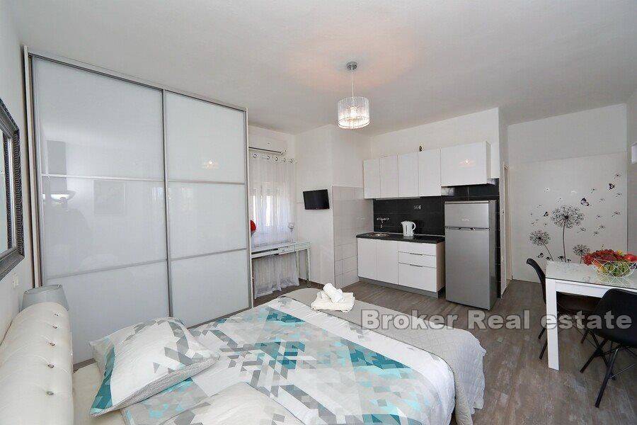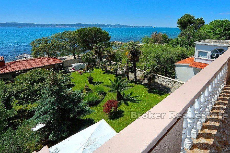 Zadar apartmanska vila prvi red do mora. Vila u svojoj stambene površine od 500m2, izgrađena na zemljištu od 700m2, prostire se na tri etaže: – U prizemlju se nalaze tri spremišta, garaža i komforan trosoban apartman s velikom natkrivenom terasom. – Na prvom katu je veliki gazdinski apartman sa tri spavaće sobe i velikom terasom s koje se pruža pogled na more. – Na drugom katu nalaze se 4 apartmana svaki sa izlazom na terasu, pogledom na more i obližnje otoke. Sve apartmanske jedinice su uređene i namještene. Cijelo dvorište ove vile ograđeno je i kultivirano, dobar dio dvorišta pretvoren u travnjak s palmama i raznolikim mediteranskim biljem. Na donjem djelu dvorišta uz samo more izgrađen je zidani kamin s pergolom, mjestom predviđenim za ljetna obiteljska druženja. Iz dvorišta se izlazi direktno na šljunčanu plažu gdje se nalazi i pripadajuće sunčalište i vez za brod. Odlična lokacija vile, blizina grada Zadra kao i blizina autoceste, zračne i prometne luke.