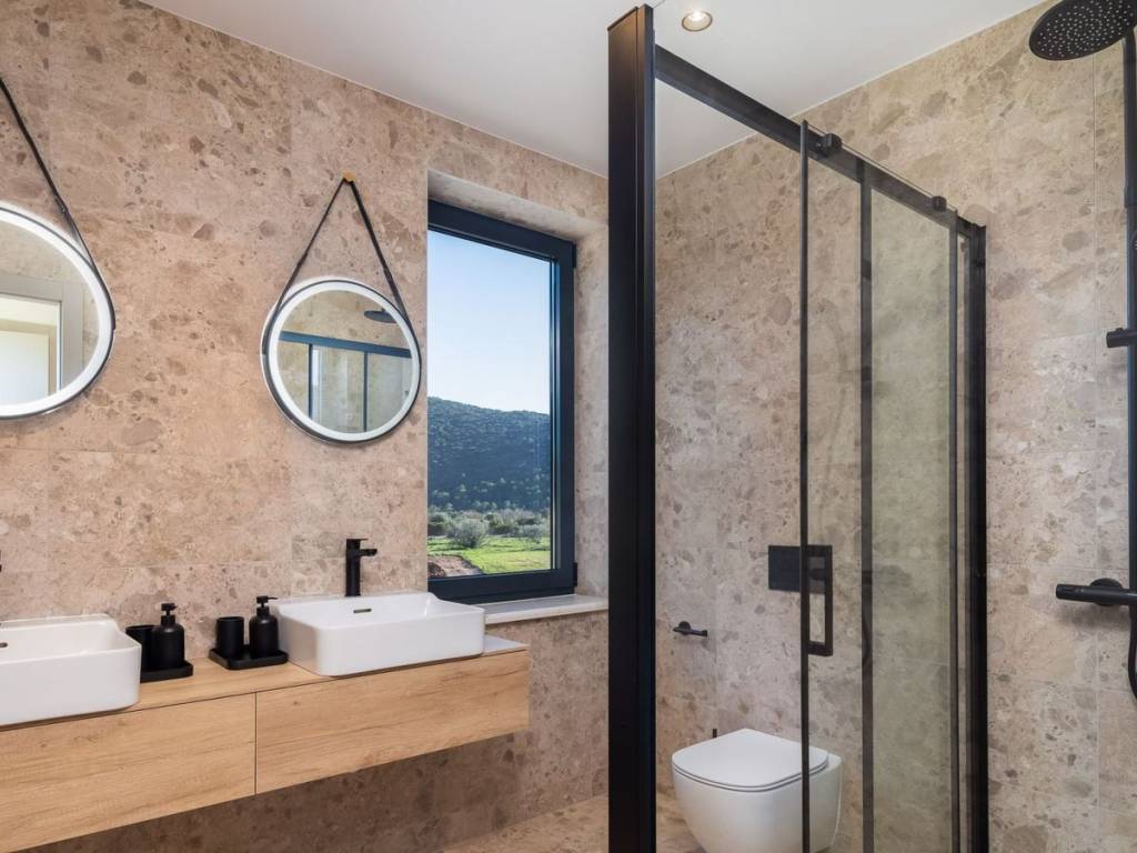 Na prodaju je luksuzna vila na odličnoj lokaciji u blizini Trogira. Radi se o iznimno modernom dizajnu s pomno uređenim interijerom kao i eksterijerom. Vila se sastoji od 2 etaže (prizemlje i 1 kat) opremljene vrhunskim materijalom. Objektu pripada i suteren. Ukupne je stambene površine 310 m2 te se nalazi na površini zemljišta od 7000 m2. Na prvoj etaži nalazi se kupaonica, kuhinja s blagovaonicom i prostranim dnevnim boravkom iz kojeg se pruža pogled na vanjski bazen. Vanjski bazen je površine 66 m2 i oko njega se nalazi vanjski namještaj kao i natkrivena vanjska blagovaonica predviđena za uživanja u ljetnom odmoru. Na drugoj etaži vile nalaze se 5 kupaonica te 5 spavaćih soba. Vilu karakterizira mirna lokacija, izuzetno moderni dizajn te okućnica uređena mediteranskim biljem. Ono po čemu se nekretnina također izdvaja je neometani pogled na prirodu. Vili pripada garaža od 35 m2 sa dva parkirna mjesta te dva vanjska parkirna mjesta. Udaljenost od mora je 1,5 km te 13 km zračne linije od centra Trogira. Od zračne luke Split udaljena je 17 km. Predstavlja izvrsnu ponudu bilo u vidu korištenja za turistički najam ili odmora u ljetnim mjesecima.