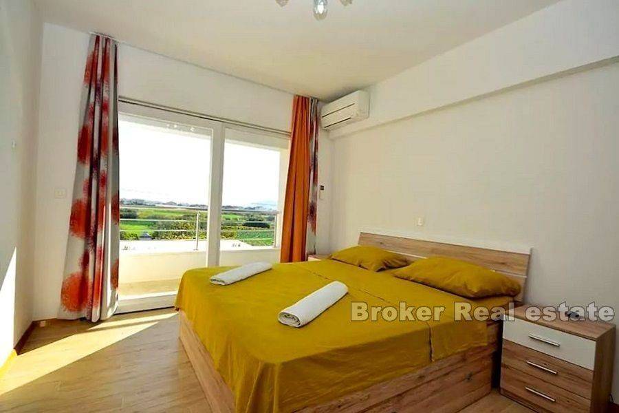 Moderna, novoizgrađena vila smještena na mirnom i pitomom području u blizini UNESCO grada Trogira, okružena vinogradima i maslinicima, južno orijentirana sa fascinantnim otvorenim pogledom na more. Vila se sastoji od tri etaže: – na prvoj etaži nalazi se veliki dnevni boravak koji ima direktni pristup južnoj terasi odnosno sunčalištu velikog bazena. – na drugoj etaži se nalaze tri sobe, svaka sa svojim kupatilom i lođom. – na trećoj etaži nalazi se velika terasa sa Jacuzziem, s koje se proteže prekrasan pogled prema trogirskom arhipelagu. Vila je u potpunosti završena, namještena, nikad korištena.