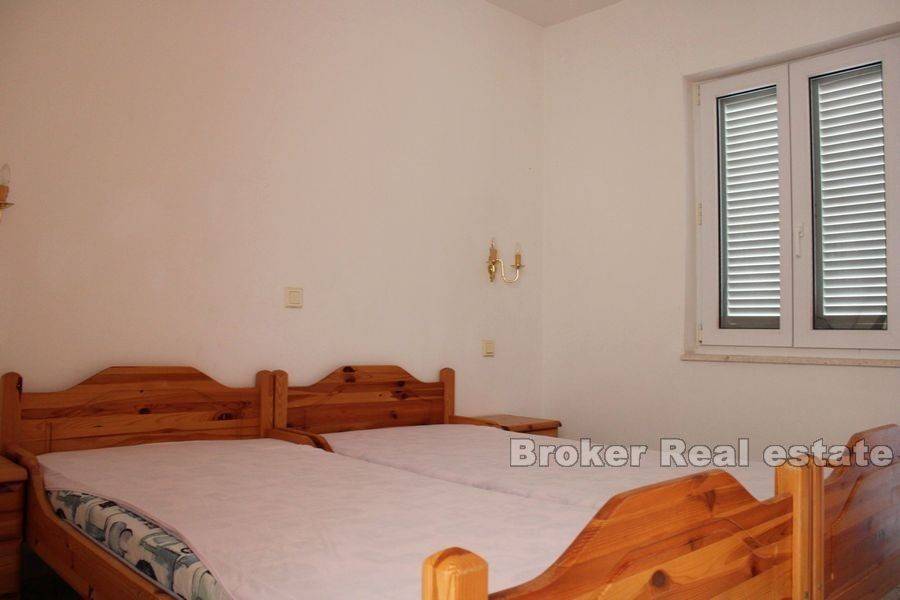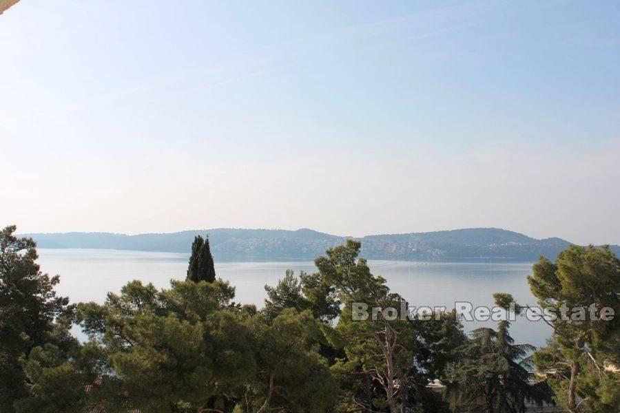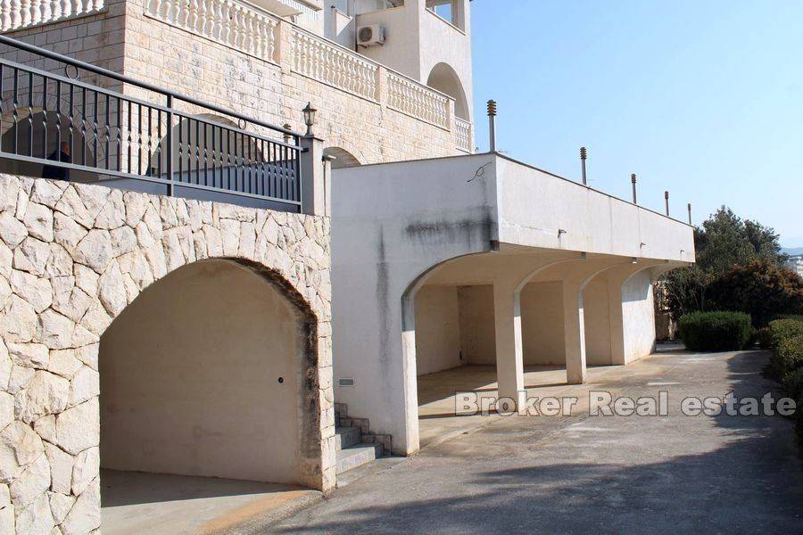 Prekrasna kuća udaljena svega 50 m od mora nadomak Trogira s prekrasnim pogledom na more. Nekretnina je okružena prekrasnom mediteranskom prirodom te je idealno mjesto za odmor i opuštanje. Kuća se sastoji od 3 etaže stambene površine 608 m2 i 810 m2 zemljišta. Na prvoj etaži se nalaze 2 apartmana koja se  sastoje od 2 sobe, kupatila, kuhinje,  velike terase, dnevnog boravka i blagavaonice. 2 etaža se sastoji od dva apartmana koji se sastoje svaki  od 1 sobe,  kupaonice, velike terase,  dnevnog boravka s kuhinjom i blagovaonicom. . 3 etaža se sastoji od dva apartmana koji se sastoje svaki  od 1 sobe,  kupaonice, balkona,  dnevnog boravka s kuhinjom i blagovaonicom.  S terasa se pruža prekrasan pogled na more i otoke. Nekretnina je opremljena centralnim grijanjem, garažom i klima uređajima. Kuća se nalazi u blizini svih potrebnih sadržaja poput restorana, cafe barova, prodavaonica s namirnicama, plaže. Nekretnina se nalazi na zemljištu od 608 m2 te ima 4 garažna mjesta i mogućnost postavljanja bazena . Na prvoj etaži se nalazi i veliki skladišni prostor. Nekretnina ima uhodan posao iznajmljivanja apartmana u turističke svrhe. Obzirom da se nekretnina nalazi u neposrednoj blizini Trogira može biti ugodno mjesto za obiteljski život.