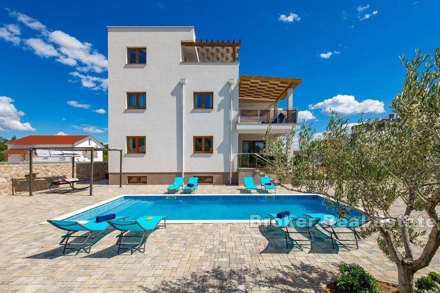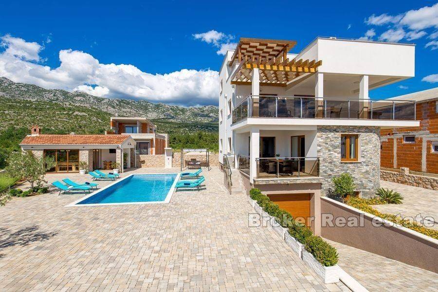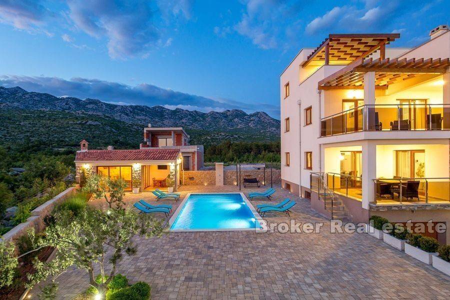 Predivna vila na prodaju površine 400 m2 smještena na parceli od 710 m2. Vila se proteže na ukupno 3 etaže i podrum. Uz vilu, na parceli se nalazi i pomoćni objekt sa kominom i ljetnom kuhinjom iz kojih se pruža direktni izlaz na dvorište i bazen u kojem je instaliran sustav grijanja. Uz dizalicu topline, kuća je opremljena podnim i solarnim grijanjem. Na minus etaži nalazi se podrum, kupaonica, kotlovnica, kupaonica i garaža sa dva parkirna mjesta te dodatne 2 prostorije koje se mogu prenamijeniti u spavaće sobe. Osim garaže, vanjski dio kuće je dovoljno prostran za još minimalno 2 parkirna mjesta. Na prizemlju kuće smješteni su kuhinja, blagovaonica, dnevni boravak i spavaća soba sa vlastitom kupaonicom. Iz dnevne sobe pruža se direktan izlaz na terasu sa ljetnom kuhinjom površine 45m2. Prvim katom dominiraju 3 spavaće sobe od kojih jedna ima vlastitu kupaonicu a druge dvije dijele zajedničku kupaonicu. Iz soba se pruža izlaz na veliku natkrivenu terasu kojoj imaju pristup dvije spavaće sobe. Na drugom katu kuće nalaze se sauna i dodatan predprostor koji se može prenamijeniti po želji. Na istom katu na djelomično natkrivenoj terasi je smješten jacuzzi, garnitura i sunčalište u kojem se uživa uz pogled na more koje se nalazi u neposrednoj blizini. Gotovo sa svih etaža se pruža pogled na more koje je udaljeno samo 200 metara od nekretnine. Kuća je zbog svih uključenih sadržaja idealna za odmor ili za turističke svrhe. Ugodan i miran krajolik u kojem je kuća smještena nikako ne utječe na udaljenost bitnih sadržaja za život. Lokacija nekretnine je uistinu zanimljiva jer se sa sjevera pruža pogled na Velebit a s juga na more.
