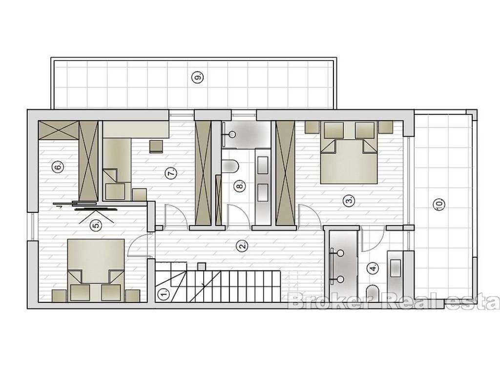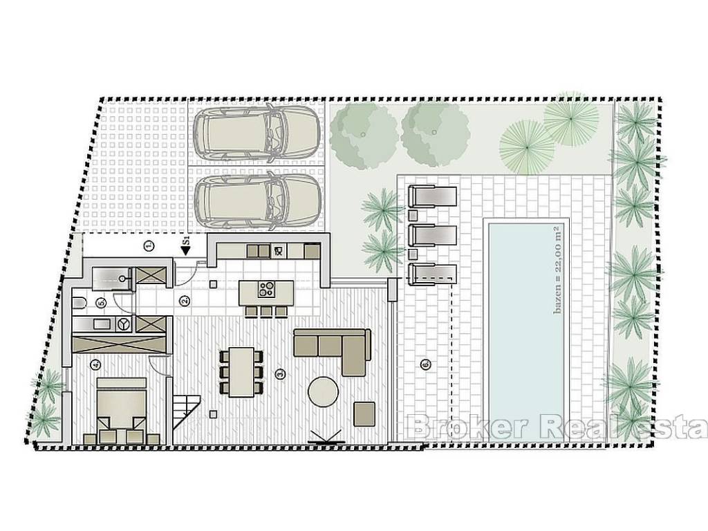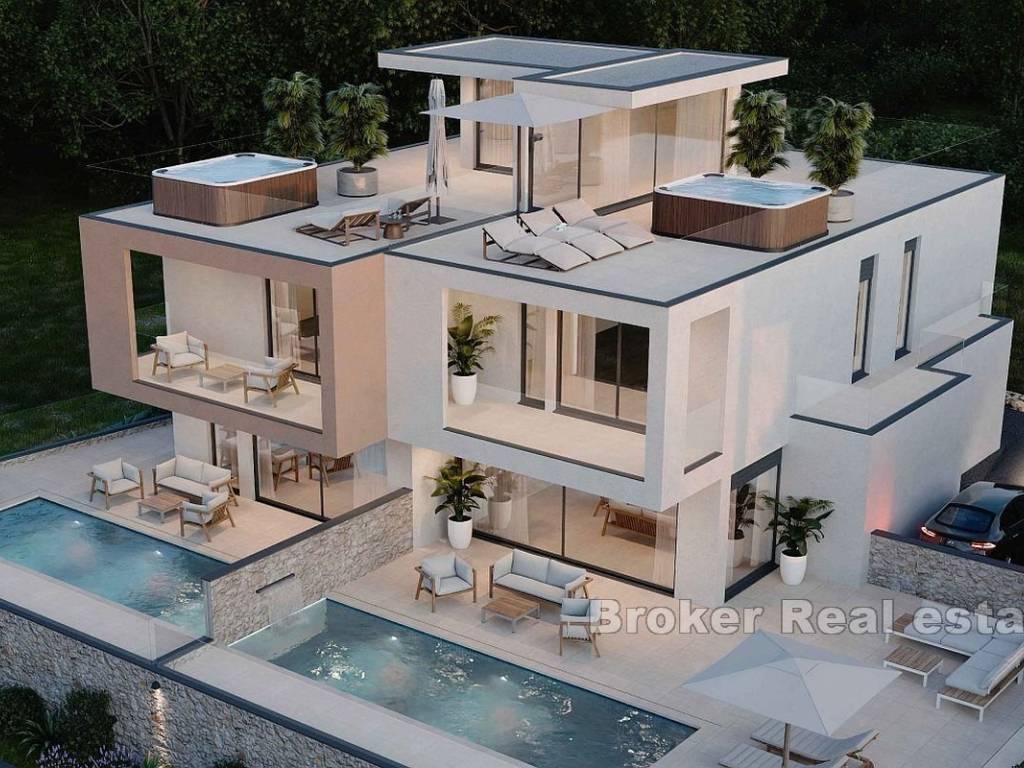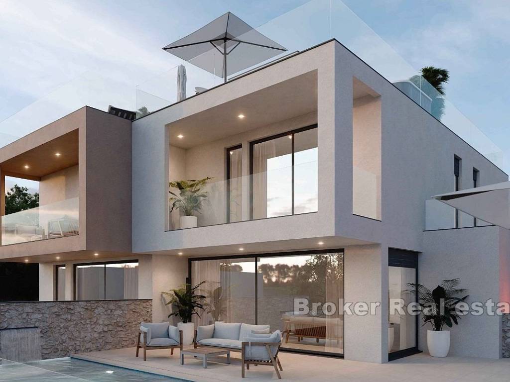Prodaje se nova dvojna kuća s bazenom smještena na parceli od 600 m2. U okućnicu spadaju bazen i sunčalište, parking, vrt i dvorište od brutto 160 m2. Glavnim ulazom s pristupa na prizemlje kuće koje se sastoji od jedne spavaće sobe, kupaonice, garderobe, kuhinje, blagovaonice i dnvne sobe. Iz zajedničkih prostorija na prizemlju pristupa se vanjskoj površini s bazenom, sunčalištem i vrtom. Unutarnje stepenište vodi do gornje etaže gdje se nalaze tri spavaće sobe i dvije kupaonice od kojih je jedna “en suite” na jugu s vlastitom kupaonicom i otvorenim pogledom na more. Obzirom na poželjnu lokaciju nekretnine ista je idealna za obiteljsko korištenje za svakodnevni život ili kuću za odmor.