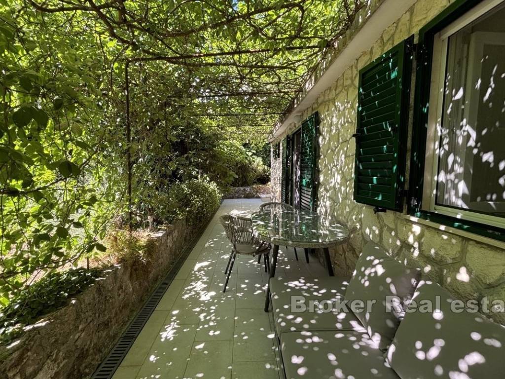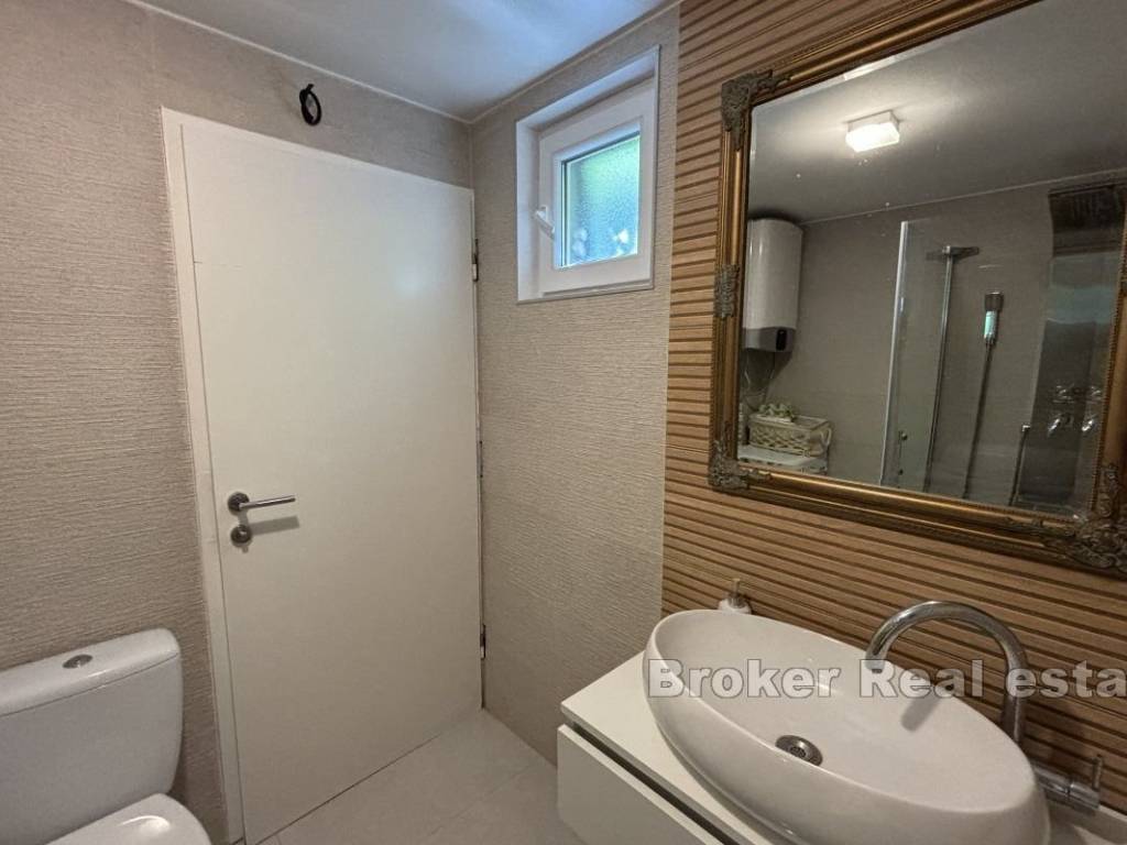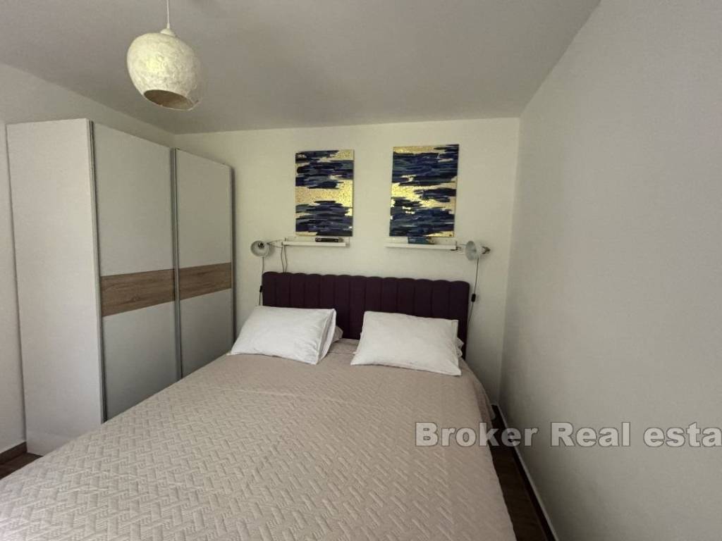 Na prodaju je manja obiteljska kuća vrlo blizu mora, na južnoj strani otoka Čiovo. Proteže se preko dvije etaže i južno je orijentirana s djelomičnim pogledom na more i s pomno obrađenim vrtom. Sastoji se od dva apartmana od kojih svaki ima pripadajuću terasu. Na prizemnoj etaži se nalazi jednosoban apartman od 25 m² koji se sastoji od spavaće sobe, kupaonice te dnevnog dijela, dok se na etaži prvog kata nalazi dvosoban apartman od 55 m² koji se sastoji od dvije spavaće sobe, hodnika, kupaonice, kuhinje te blagovaonice s dnevnim boravkom. Kuća je klimatizirana te se prodaje namještena i opremljena. Iza objekta se nalazi garaža koja služi kao sprema te ostava, a predviđen je i parking za dva automobila. Kuća je okružena zelenilom ima kamin, a postoji i mogućnost izgradnje bazena. Nekretnina je izvrstan izbor zbog blizine mora, kampa, dućana i ostalih sadržaja te grada Splita i zračne luke koja je udaljena svega 7,5 km.