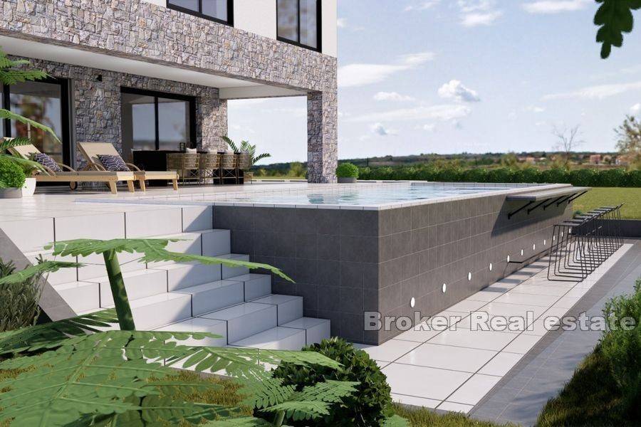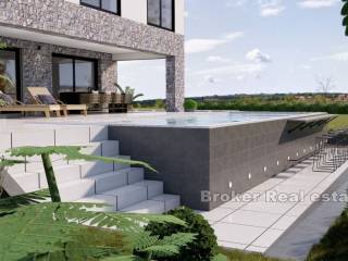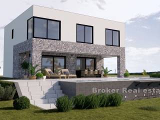 Moderna vila s bazenom smještena u mirmom mjestu s prirodnim plažama i uvalama daleko od urbanih središta. Vila bruto stambene površine 172m2 je položena na zemljištu od 495m2 te se prostire na dvije etaže – prizemlje i kat. U prizemlju se nalazi otvoreni koncept kuhinje, blagovaonice i dnevnog boravka, ostava i toalet. Iz dnevnog boravka omogućen izlaz na natkrivenu terasu površine 36,55 m2 koja vodi do sunčališta i bazena. Unutarnje stubište vodi do prvog kata koji se sastoji od tri spavaće sobe sa pripadajućim kupaonicama. Posjeduje dva parkirna mjesta. Blizina potrebnih sadržaja za življenje, na 770m udaljenosti od mora i 20km udaljenosti od Zadra. Jedna od glavnih karakteristika nekretnine je lokacija na osami, okružena poljoprivrednim zemljištima što osigurava apsolutnu privatnost i pogled na more.