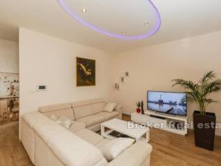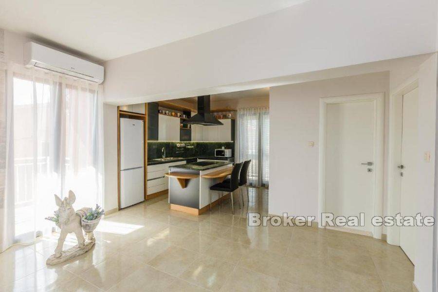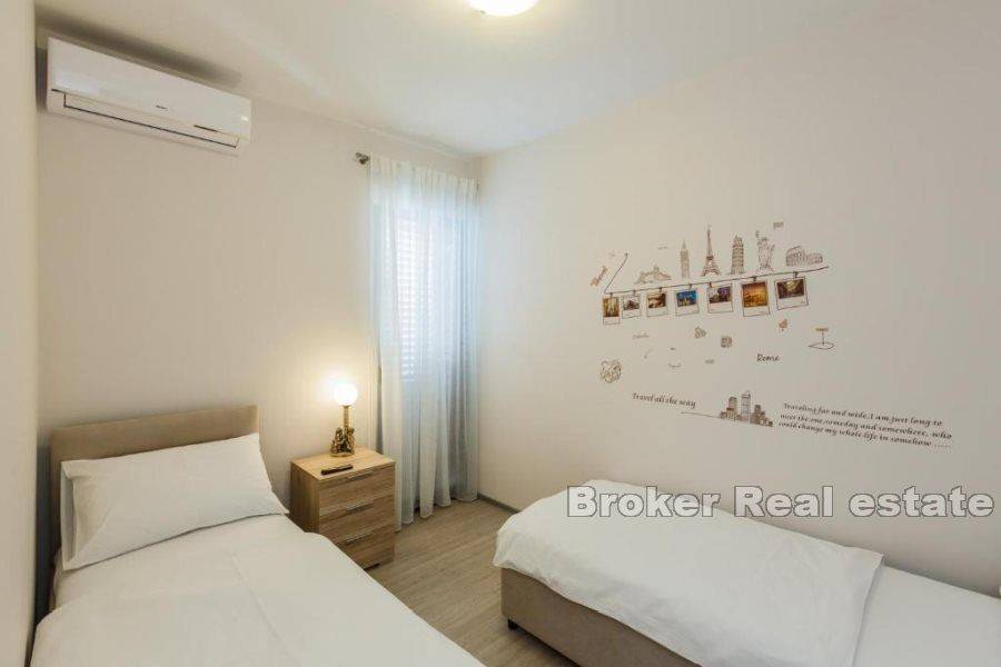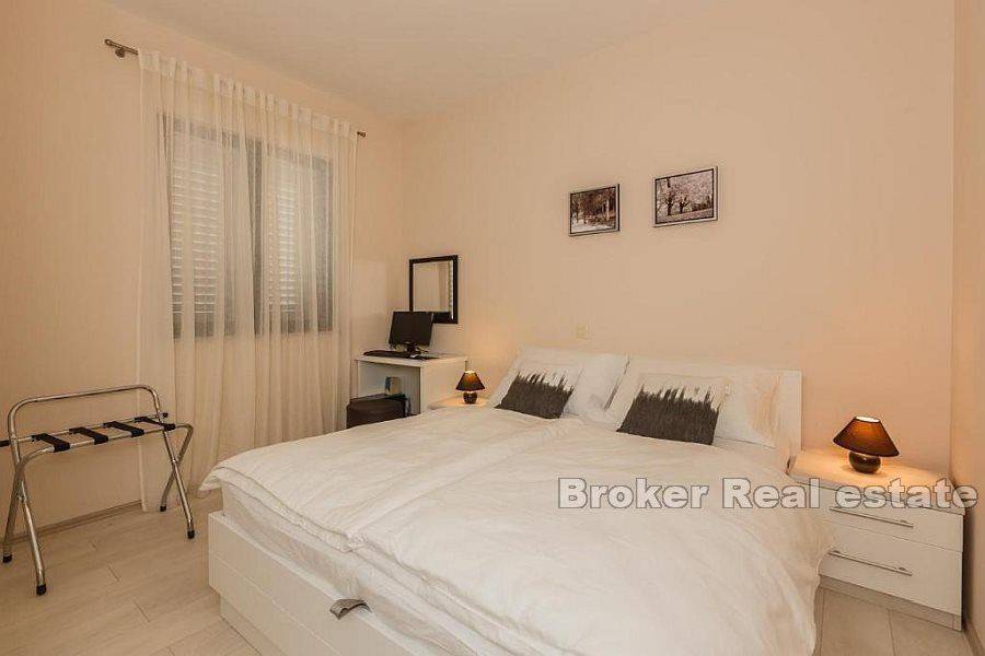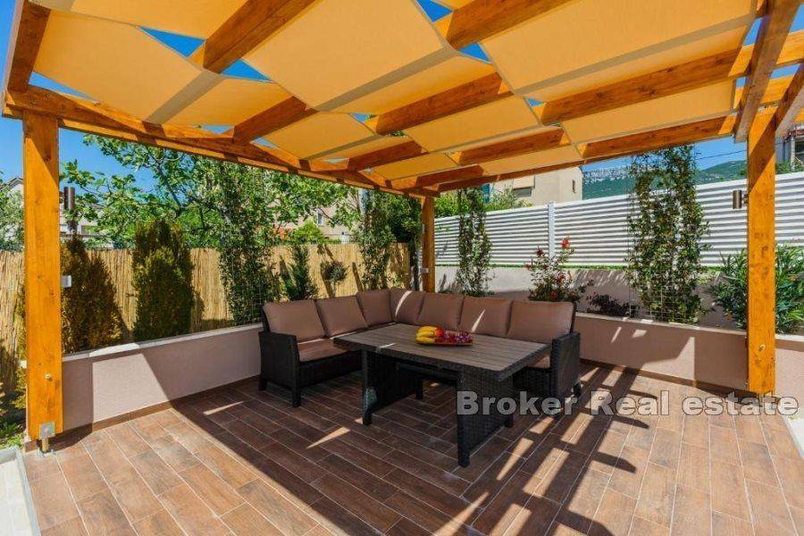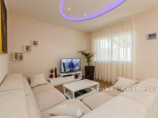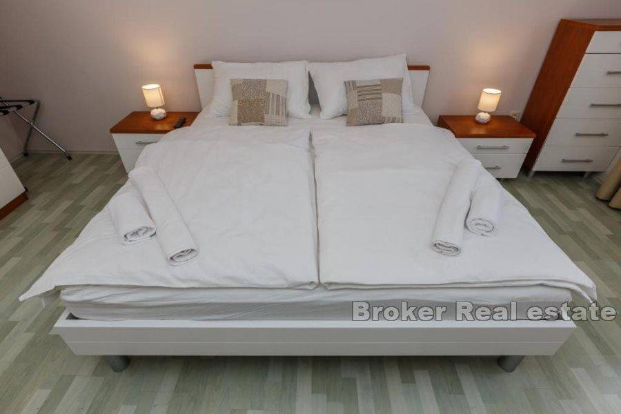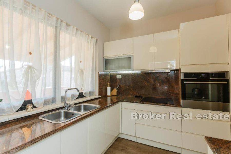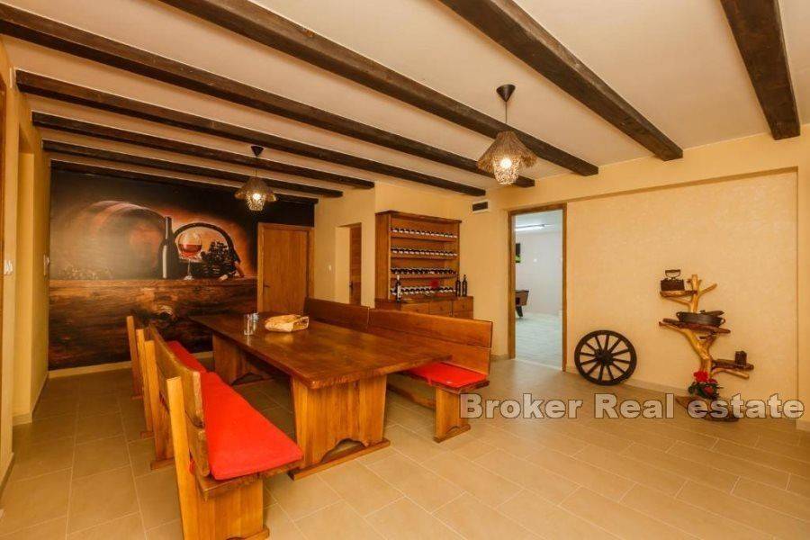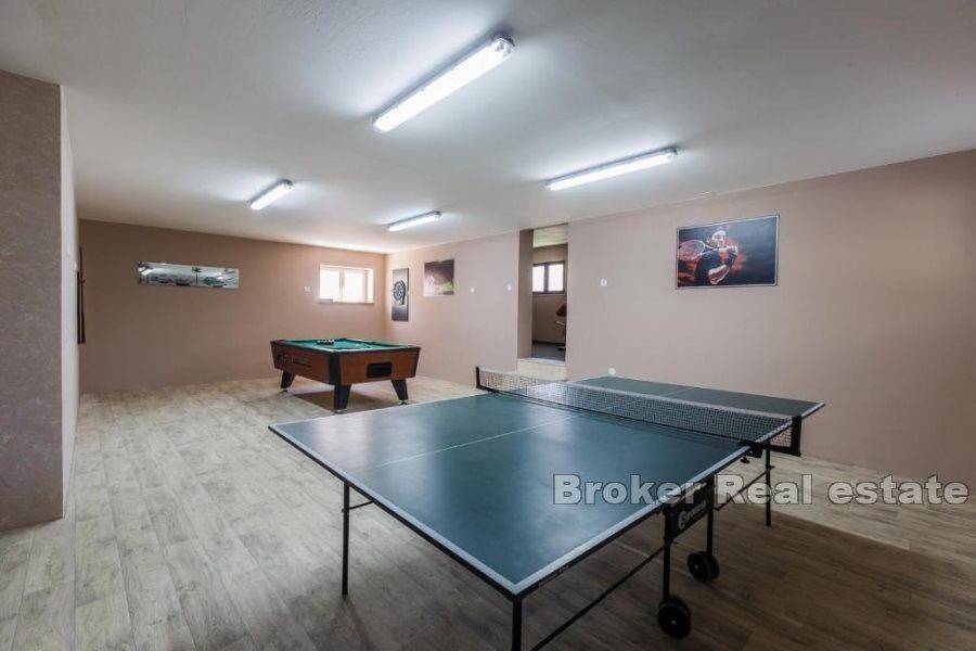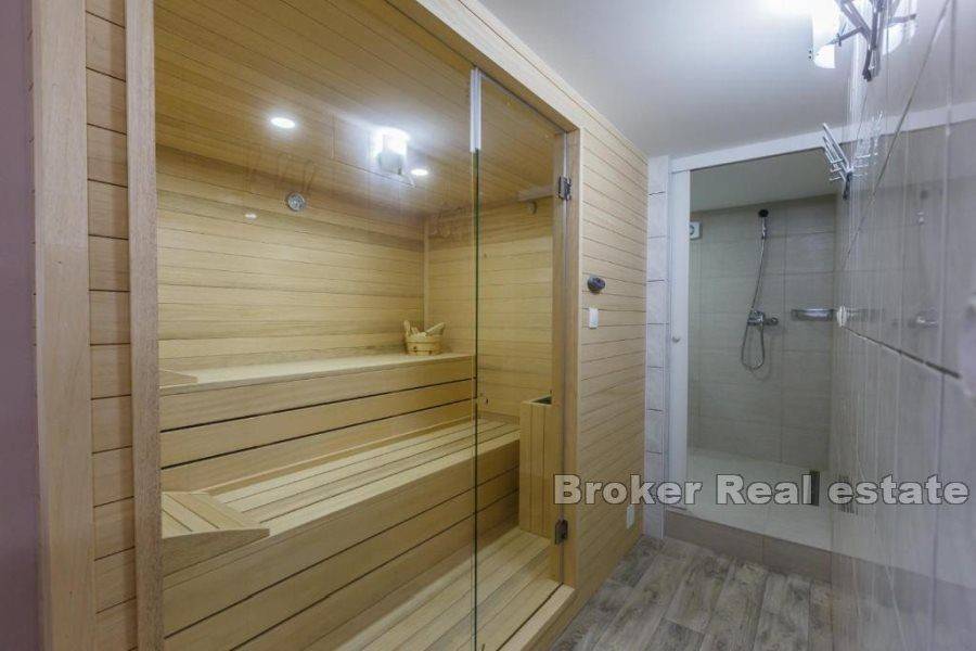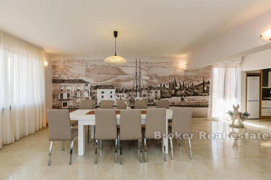Prodaje se kuća u Kaštelima stambene povšine 420 m2 položena na zemljištu 712 m2. Kuća se nalazi prekrasnoj lokaciji s pogledom na more udaljena svega 150 m od prekrasne plaže. Kuća je opremljena sa svim sadržajima za ugodan život i odmor kao što su bazen, sauna, teretana, igraonica za djecu. Kuća se sastoji od 3 etaže i podruma u kojem se nalazi sauna, kupatilo, igraonica za djecu, konoba i vinski podrum. Na prizemlju se nalazi kuhinja s blagavaonicom, dnevnim boravkom, 2 sobe, s kupatilima te ostavom. Prizemlje ima i zaseban izlaz na terasu od 45 m2. Etaža na prvom katu je zaseban apartman u kojem se nalazi kuhinja s blagavaonicom, dnevnim boravkom, terasom, 1 sobom te kupatilom i zasebnim toaletom. Druga etaža se sastoji od 4 sobe, 3 kupatila te velika igraonica iz koje se izlazi na terasu. Kuća se prodaje potpuno namještena. Blizina prekrasne plaže i svih bitnih sadržaja za život kao što su restorani, dućani, cafe barovi, čine ovu kuću idealnom za život kao i za najam u turističke svrhe.