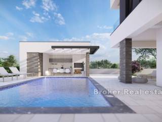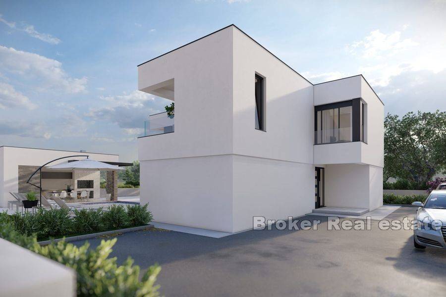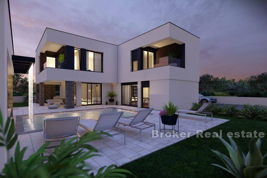 Moderna kuća u izgradnji smještena u malom, atraktivnom mjestu nedaleko od grada Zadra. Kuća se sastoji od prizemlja i kata. Na prizemlju je smještena kuhinja sa blagovaonicom, dnevni boravak sa izlazom na natkrivenu terasu od 27m2, wc te prostor predviđen za spremište i praonicu. Na prvom katu su smještene četiri komforne spavaće sobe sa privatnim kupaonicama od kojih dvije spavaće sobe imaju izlaz na terase od 6m2. Na okućnici se nalazi bazen od 29,11 m2, ljetna kuhinja od 41,39m2 i parking za tri automobila. Planirani završetak gradnje je lipanj 2023. Konstrukcija objekta će biti zidana Porotherm ciglom, ploče, grede i stupovi od armiranog betona, toplinska izolacija (fasada) debljine 10 i 20 cm, stolarija PVC u antracit boji vani i bijeloj boji unutar objekta, dizanje i spuštanje roleta na struju, grijanje objekta i sanitarne vode preko dizalice topline, hlađenje i dodatno grijanje preko klima uređaja, odvodnja fekalnih voda u biološki pročiščivač. Napon struje trofazni 13,80 kW. Bazen će biti armirano betonski te će ujedno biti ugrađena i toplinska pumpa za zagrijavanje vode bazena. Na objektu će biti ugrađen i videonadzor. Novi vlansnik može sudjelovati u odabiru keramičkih pločica, parketa i boja zidova. Kuća se prodaje nenamještena. S obzirom na mirnu lokaciju, osim za življenje ova nekretnina nudi mogućnost turističkog najma. Udaljenost od grada Zadra je 12km, od zračne luke Zadar 28 km.
