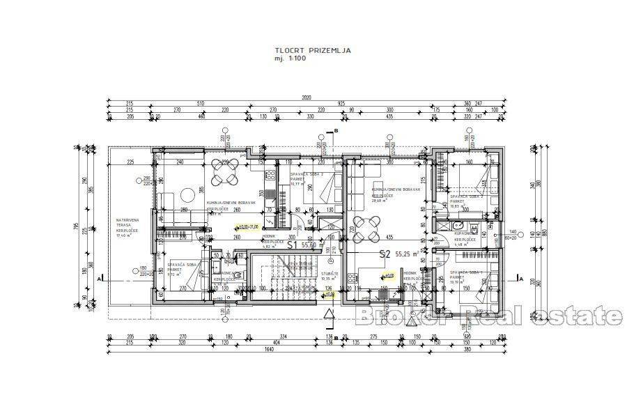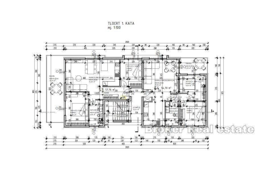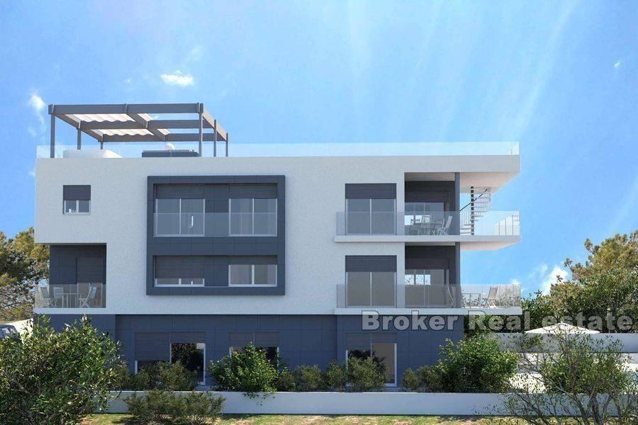 U izgradnji je moderna zgrada sa 5 apartmana na zapadnoj strani otoka Čiovo. Zgrada se nalazi na odličnoj lokaciji, vrlo blizu mora od kojeg je udaljena svega 150 metara. Objekt će biti zapadno orijentiran te okružen novoizgrađenim zgradama.  Zgrada će imati sveukupno 3 etaže.  U izgradnji i opremanju će se koristiti kvalitetni materijali (pločice i sanitarije visoke klase, zatvori na električno podizanje, klima uređaj u svakoj prostoriji i sl.). Svakom stanu pripada jedno parkirno mjesto. Stanovi su odličan izbor za sve one koji traže stan na mirnoj lokaciji s pogledom na more. PRIZEMLJE:  S1 – hodnik, kuhinja, dnevni boravak, 2 spavaće sobe, kupaonica, bazen, vrt, nenatkrivana terasa – 64,30 m2 – 340.000,00 eura – PRODANO!  S2 – hodnik, kuhinja, dnevni boravak, 2 spavaće sobe, kupaonica, vrt – 56,60 m2 – 200.000,00 eura – PRODANO! 1. KAT:  S3 – hodnik, kuhinja, dnevni boravak, 2 spavaće sobe, kupaonica – 57,76 m2 – 210.000,00 eura – PRODANO!  S4 – hodnik, kuhinja, dnevni boravak, 2 spavaće sobe, kupaonica – 54,70 m2 – 210.000,00 eura – PRODANO! 2. KAT:  S5 – hodnik, kuhinja, dnevni boravak, 3 spavaće sobe, 3 kupaonice, balkon/terasa – 122,93 m2 – 465.000,00 eura