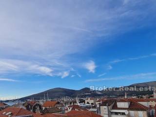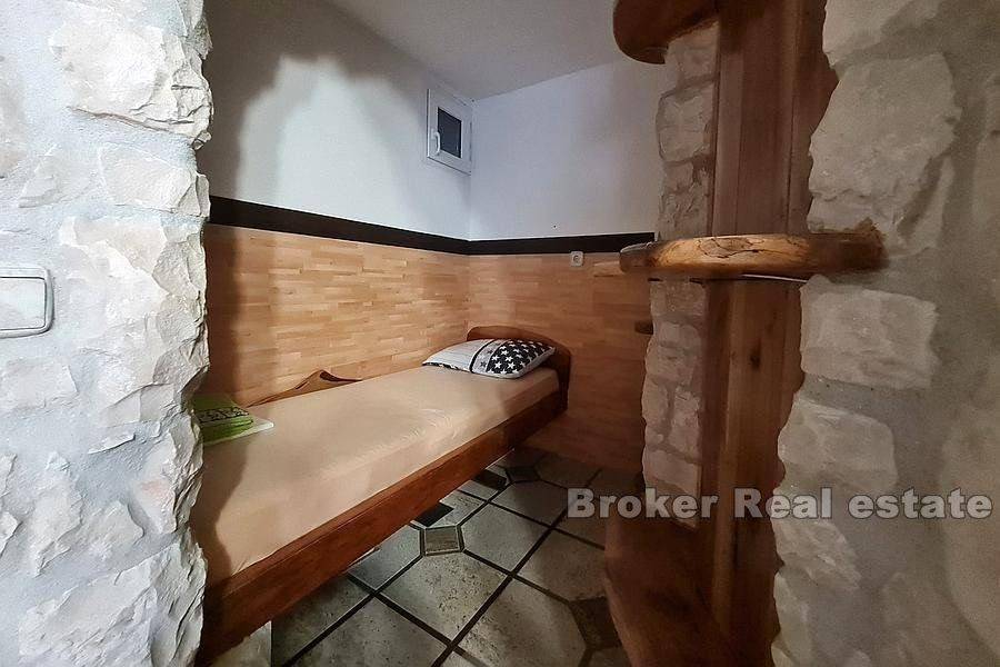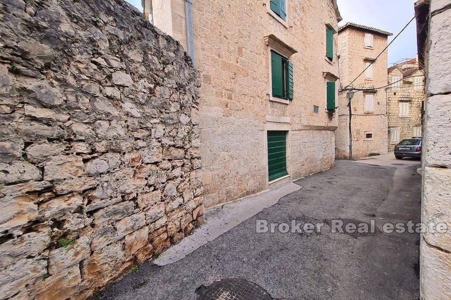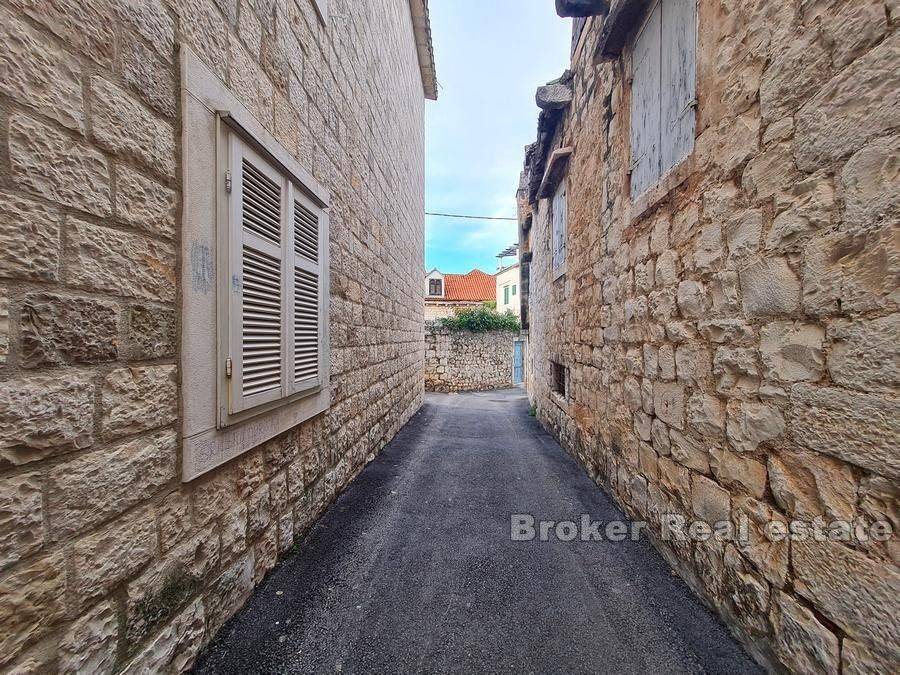 Kamena kuća u nizu s 500 godina povijesti, s dva ulaza, smještena nadomak trogirskog mosta na Čiovu, okružena uređenim kamenim kućama, u samoj staroj jezgri.  Ukupne je površine cca. 140m2 podijeljenih na četiri etaže: Prizemna etaža koja se trenutno koristi kao konoba, a opremljena je krevetom, kaminom i kupaonicom. Prvi kat koji je u naravi studio apartman sa spavaćim dijelom, kuhinjom, kupaonicom i još jednom odvojenom spavaonicom. Drugi kat koji je isto tako u naravi studio apartman sa spavaćim dijelom, kuhinjom, kupaonicom i još jednom odvojenom spavaonicom. Prve tri etaže površine su otprilike po 40m2. Treći kat na kojemu je zatvorena ljetna kuhinja (cca.20m2) opremljena svim aparatima i terasa s pogledom na more Četvrti kat, u biti krovna terasa od cca. 30m2, s otvorenim pogledom na grad i more.  Etaže su povezane unutarnjim spiralnim stepenicama.  Kuća je renovirana po etapama kroz zadnjih 19 godina, a vlasnici su naglasak stavili na očuvanje izvornosti koristeći isključivo puno hrastovo drvo, kamen i granit pri uređivanju. Promijenjene su vodovodne cijevi i električni kabeli, ugrađena je betonska ploča u povode, a umjesto drvenih greda te je postavljena je i izolacija u podovima. Sav namještaj je izrađen ručno, po mjeri.  Što se infrastrukture tiče, kuća je spojena na gradski vodovod i kanalizaciju, električnu mrežu, a posjeduje i solarne panele za zagrijavanje vode.  U blizini su prodavaonice, dućani, brjni restorani i caffe barovi, autobusna stanica, ACI marina, bankomati i sl.