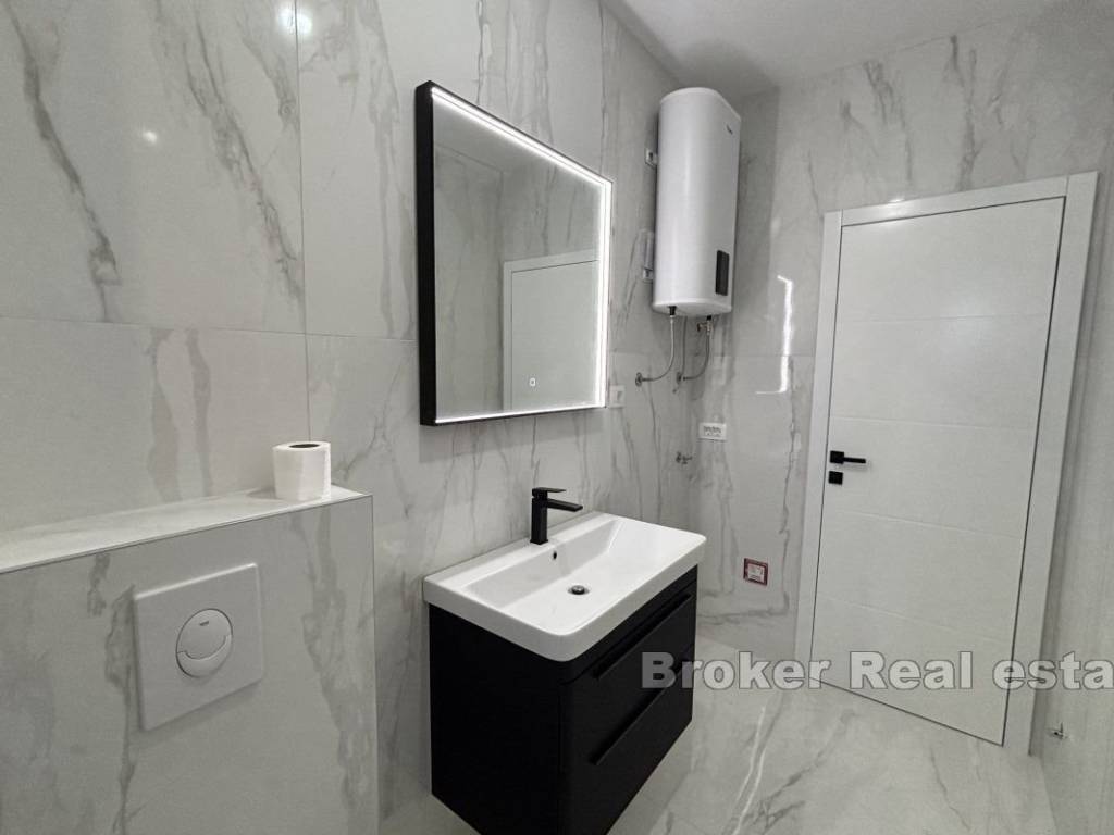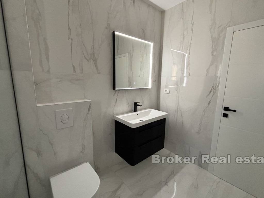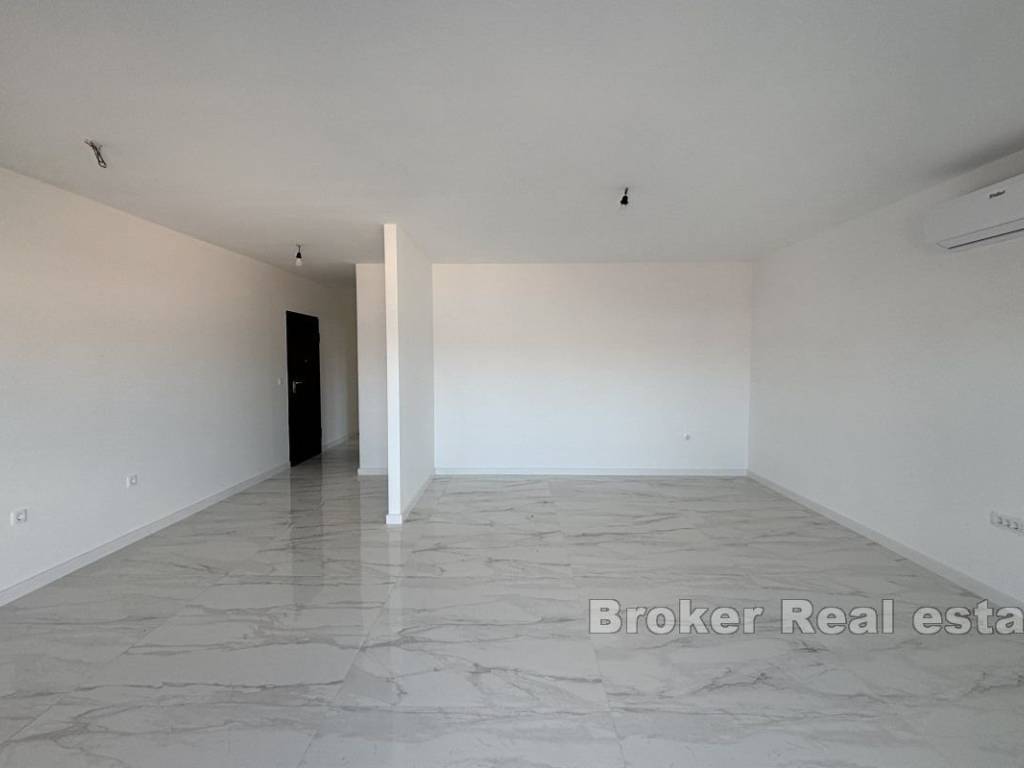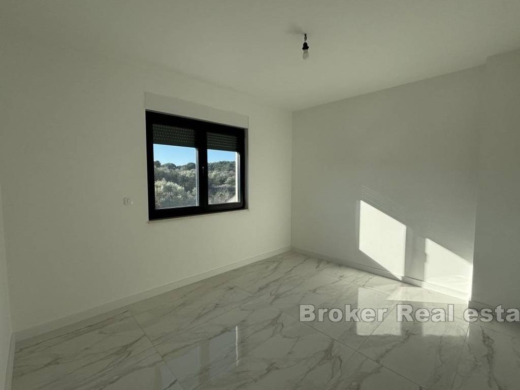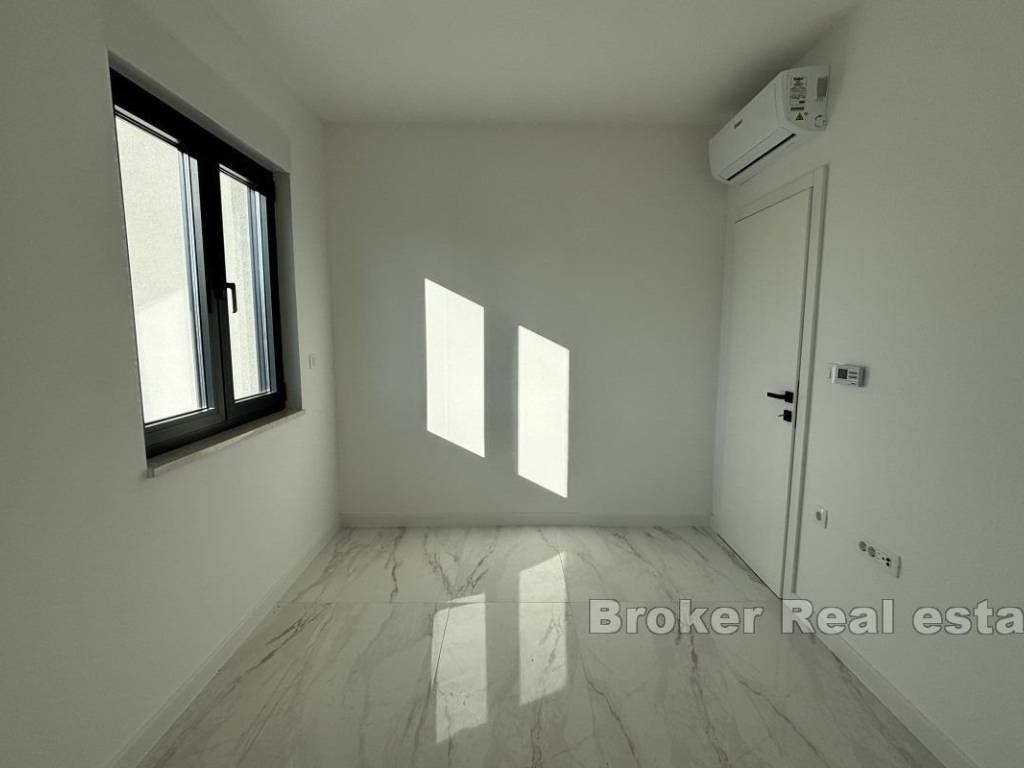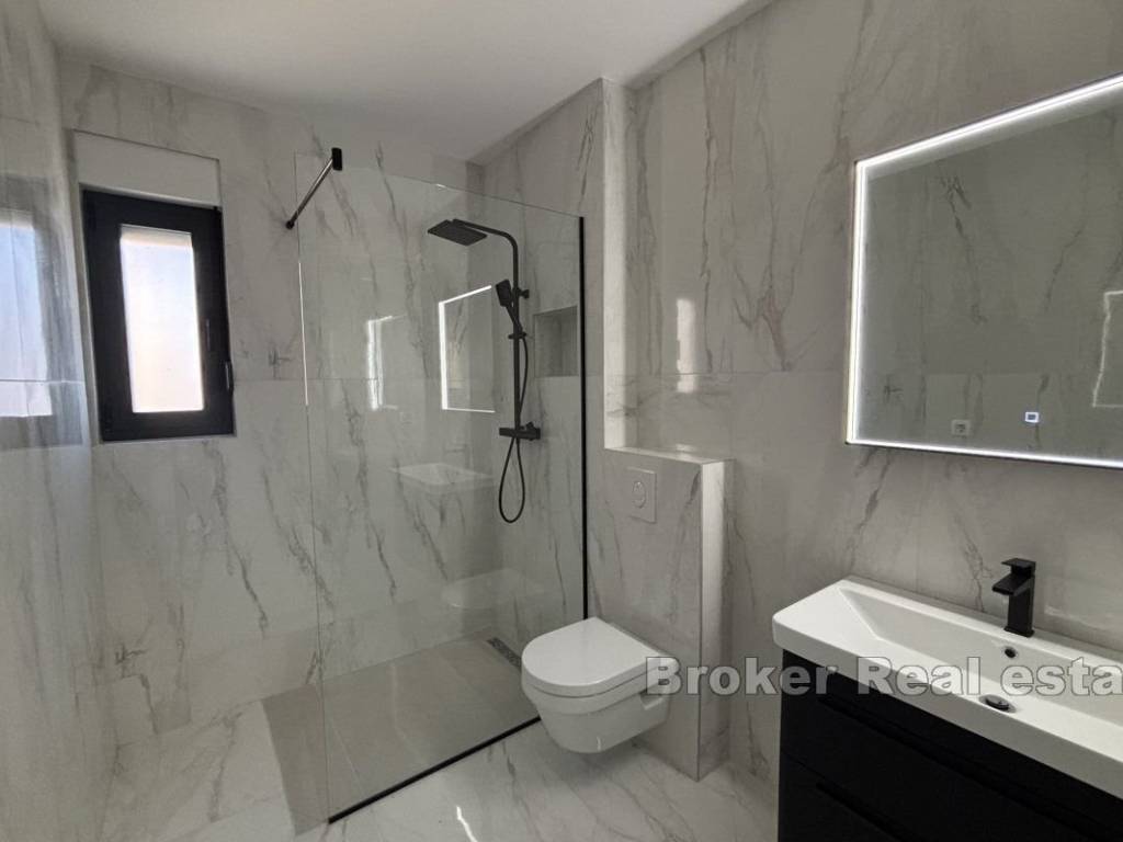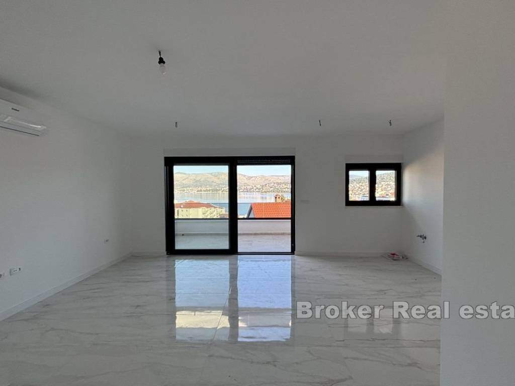 Luksuzan trosoban penthouse na sjevernoj strani otoka Čiovo, u Okrugu Gornjem. Ima otvoren pogled na more i smješten je na drugom katu stambene zgrade s dizalom.   Stan ima 93,20 m² stambenog prostora te se sastoji od tri spavaće sobe od kojih jedna ima izlaz na vlastitu lođu od 11,41 m², dvije kupaonice, predsoblja, kuhinje i blagovaonice s dnevnim boravkom iz kojega se izlazi na terasu od 23,93 m². Penthouseu pripada i pola nenatkrivene krovne terase površine 93,58 m² koja je idealna za ljetnu kuhinju, masažnu kadu te ostale sadržaje.   Cijeli stan je klimatiziran, a prodaje se opremljen kvalitetnim sanitarijama i pločicama u mramornom stilu. Dolazi s dva vanjska parkirna mjesta.   Stan je izvrsna prilika za turističko iznajmljivanje ili pak kao ljetni dom. Svi potrebni sadržaji nalaze se u krugu 500 m, a zračna luka je udaljena manje od 10 km.