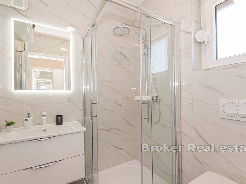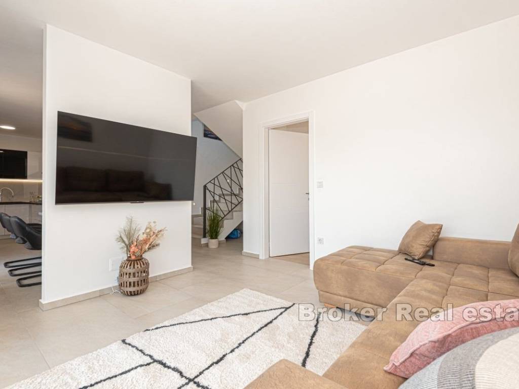 Prodaje se dvojna vila u mirnom naselju blizu Šibenika, idealna za obiteljski život ili kao investicija za turizam. Ova moderno dizajnirana kuća, neto stambene površine 113,5 m², raspoređena je na dvije etaže. Prizemlje uključuje jednu spavaću sobu, kupaonicu, prostranu dnevnu zonu s kuhinjom, blagovaonicom i dnevnim boravkom, te dodatno spremište i predprostor. Na katu se nalaze tri spavaće sobe i dvije kupaonice, povezane hodnikom i stubištem. Kat pruža djelomičan pogled na more. Vila ima bazen, dvorište i parkiralište za više vozila, idealno za uživanje u privatnosti. More i plaže nalaze se na samo 900 metara zračne udaljenosti. Lokacija je izvrsna za obiteljski odmor, miran život ili turistički najam.