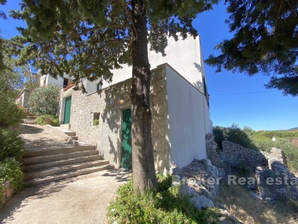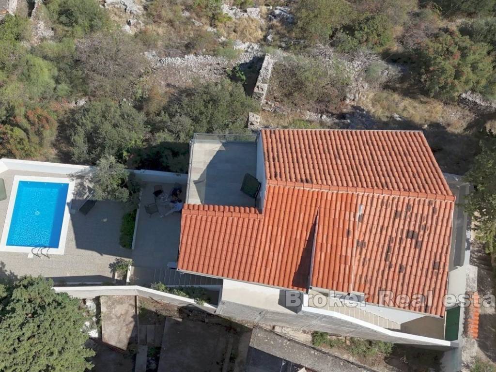 Kuća je smještena na vrlo poželjnoj lokaciji na brdu u srcu malog turističkog mjesta pored Šibenika. Na vrhu ovog brda, stotinjak metara od vile, nalazi se crkva svetog Nikole iz 15. stoljeća. Nekretnina se nalazi na osami s tek jednom kućom u blizini. Sastoji se od 3 neovisne, odvojene etaže. U prizemlju se nalazi open space koncept stana s potpuno opremljenom kuhinjom i 2 sanitarna čvora. S etaže prizemlja se pristupa vrtu s bazenom koji čini ovu nekretninu još privlačnijom. Vanjskim stepenicama iz vrta se dolazi do etaže prvog kata, sastoji se od 2 spavaće sobe, kuhinje i sanitarnog čvora. Najgornja etaža se sastoji od hodnika, kupaonice i toaleta, velikog otvorenog dnevnog boravka sa spavaćom sobom, jedne jednokrevetne sobe/radnog prostora i velike terase. Ukupno stambenog prostora: 168m2. Ukupna površina terasa 68m2. Nekretnina je povučena na ovom malom brdu, ali unutar nekoliko minuta hoda od marine i živopisnog starog grada, sa svojim kafićima i restoranima. Do plaže je potrebno samo pet minuta hoda. Dva nacionalna parka su na dohvat ruke; Kornati (jedan sat vožnje brodom) i slapovi Krke (30 minuta vožnje automobilom). Šibenik je udaljen 15 minuta vožnje, a međunarodne zračne luke u Splitu ili Zadru su udaljene samo jedan sat.
