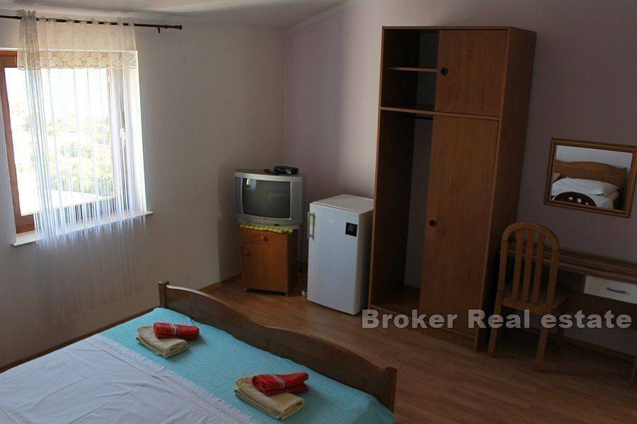 Apartmanska kuća blizu mora nalazi se u malom i tihom turističkom mjestu u Biogradu. Nekretnina stambene površine 800m2 je položena na zemljištu od 579m2 te se prostire na četiri etaže povezanih unutarnjim stubištem. U podrumskoj etaži se nalazi garaža za dva vozila, četiri prostorije namjenjene za osoblje ili vešeraj, toalet, veća prostorija je namjenjena za fitness, dvije tuš kabine i jedan toalet. Na prvom katu se nalazi prostrana prostorija koja je u funkciji restorana sa recepcijom, šankom, kuhinjom, sobom za osoblje i tri toaleta. Omogućen izlaz na prostranu terasu sa koje se pruža zadivljujući pogled na more. Drugi kat se sastoji od tri spavaće sobe i apartmana sa kuhinjom i dvije spavaće sobe. Sve sobe imaju pripadajuću kupaonicu i izlaz na balkon. Na trećem katu se nalaze četiri spavaće sobe sa pripadajućim kupaonicama i omogućenim izlazom na balkon sa kojeg se pruža pogled na more. Nekretnina je u poslovanju kao pansion već dugi niz godina. Posjeduje više parkirnih mjesta. Na 86m udaljenosti od mora i u blizini potrebnih sadržaja za življenje. Biograd je turističko i nautičko odredište idealno za obiteljski život. Grad ima prekrasne plaže, slikovite uvale i mnoge lijepe restorane.