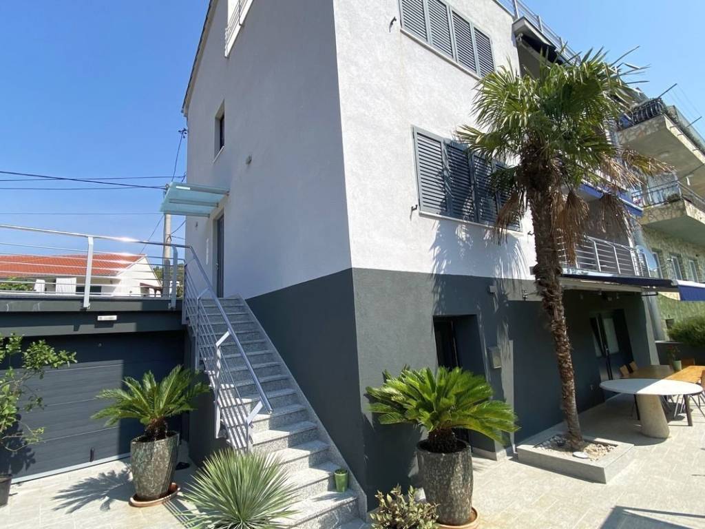 Ekskluzivna prodaja samostojeće kuće u malom ali popularnom turističkom mjestu Marina. Kuća je smještena uz glavnu prometnicu, udaljena 40 m od mora. Kuća se prostire na četiri etaže, povezane unutarnjim stepenicama koje olakšavaju kretanje između katova. U podrumu se nalazi prostrana dnevna soba opremljena kuhinjom i kupaonicom, savršena za druženja i zajedničke aktivnosti. Prvi i drugi kat nude dva identična dvosobna stana, svaki sa svojom kupaonicom i balkonom, što omogućava udoban i privatni život za svakog stanara. Na najvišem, trećem katu, nalazi se moderno uređen studio apartman koji uključuje kuhinju, kupaonicu i dnevni boravak s izlazom na prostranu terasu, idealnu za opuštanje ili zabavu na otvorenom. Nekretnina je kroz godine temeljito renovirana, uključujući instalacije za električnu energiju i vodovod, centralno grijanje, obnovljenu fasadu te potpuno novi krov, čime se osigurava visoki standard kvalitete i dugotrajnost. Pored glavne kuće, nalazi se i garaža koja nudi fleksibilnost korištenja – može se pretvoriti u fitness prostor ili ostati kao parkirno mjesto za automobile. Okućnica je pažljivo uređena s mediteranskim biljkama i pruža parking mjesta za 3-4 vozila, čineći prostor urednim i funkcionalnim. Lokacija ove kuće je izvanredna, smještena u blizini svih potrebnih sadržaja. Samo 40 metara od mora i trgovina, 20 kilometara od najbliže zračne luke te 14 kilometara od povijesnog starog grada Trogira, čine ovu nekretninu savršenim izborom za obiteljski život ili poslovne svrhe u turizmu.