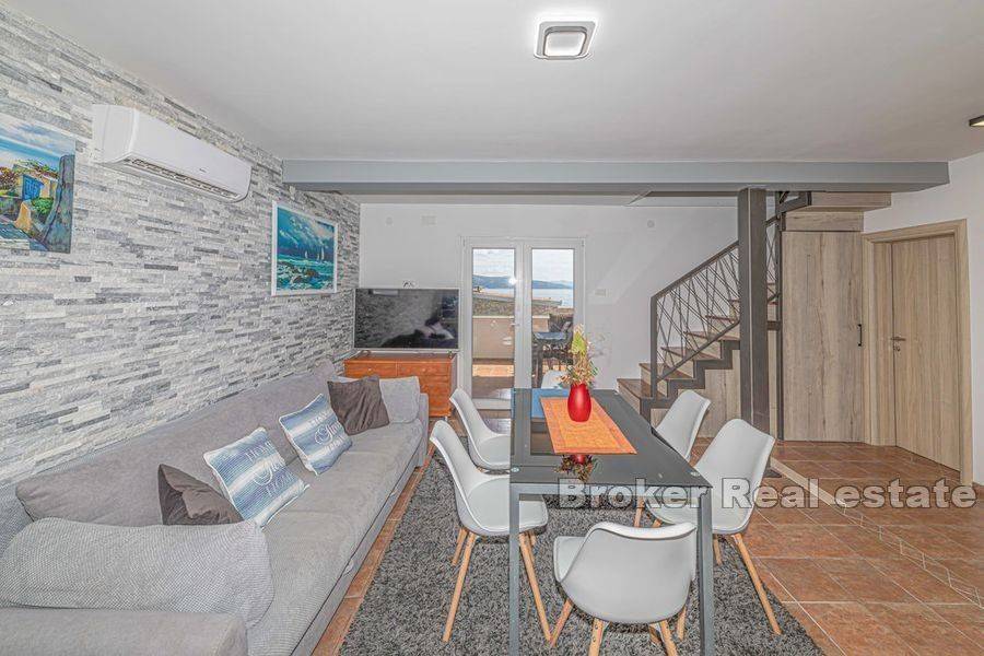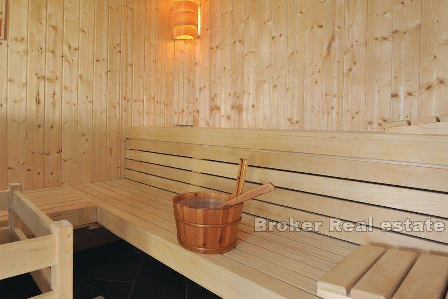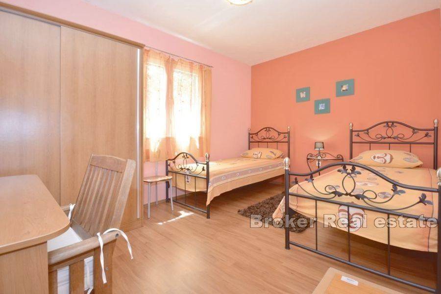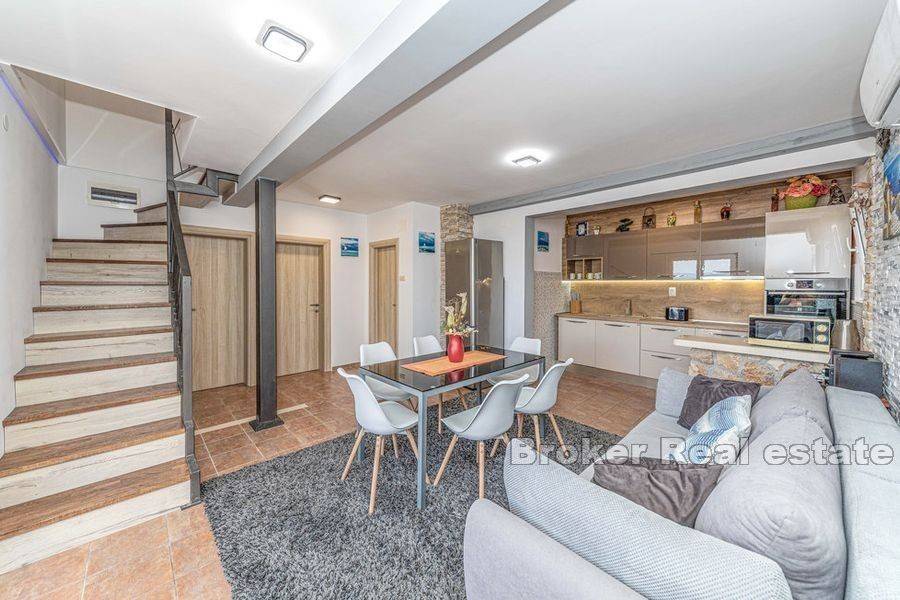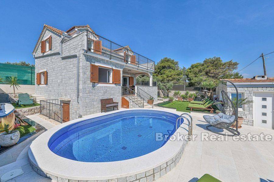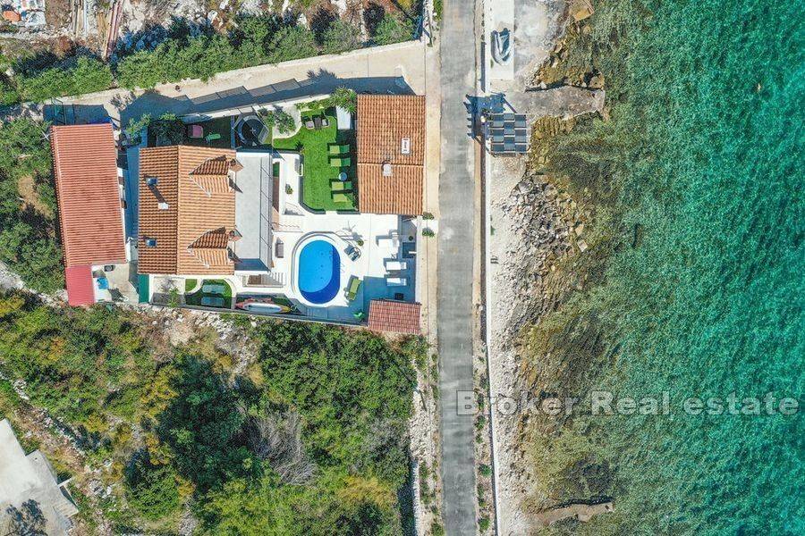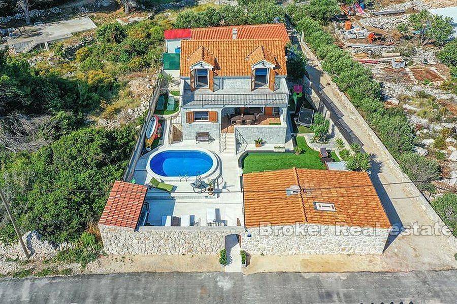 Kamena kuća s bazenom u prvom redu do mora na otoku Drveniku. Na zemljištu od 483m2 je izgrađen kompleks od tri kamena objekta koji je ograđen kamenim zidom koji pruža apsolutnu privatnost. Glavni objekt je kamena kuća od 176m2 koja se prostire na tri etaže. Na prvoj etaži se nalazi otvoreni koncept kuhinje s blagovaonicom i dnevnim boravkom, dvije spavaće sobe te jedna kupaonica. Unutarnje stubište vodi do druge etaže na kojoj se nalaze dvije spavaće sobe sa pripadajućim kupaonicama i terasama sa kojih se pruža zadivljujući otvoreni pogled na more. Iz dnevnog boravka omogućen izlaz na natkrivenu terasu s vanjskom blagovaonicom. Etaža podruma se sastoji od ostave, saune i vinskog kutka što nudi savršeno mjesto za opuštanje i odmor. Iza glavnog objekta se nalazi zasebni kameni objekt od 45m2 koji se sastoji od kuhinje s blagovaonicom, jedne spavaće sobe, kupaonice, vodospreme i nadstrešnice. Uz more je smješten kameni pomoćni objekt od 49m2 koji se sastoji od kuhinje s prostorom za druženje, velikog kamina, dvije spavaće sobe i jedne kupaonice. Uz objekt se nalazi nadstrešnica s jacuzzijem, dok je uređena okućnica obogaćena i vanjskim bazenom od 16m2 sa sunčalištem te dječjim sadržajem na umjetnoj travi. Nekretnina je izgrađena 2007. godine, a renovirana i proširena 2021. godine. Posjeduje tri parkirna mjesta. Kuća se nalazi u mirnom mjestu na Drveniku, na 10m udaljenosti od mora. Izgrađena je u tradicionalnom Dalmatinskom štihu u kombinaciji sa uređenom okućnicom mediteranskim biljem čime se stvara idealan spoj nekretnine s prirodom koja budućem vlasniku pruža život u miru i privatnosti. Osim stambenog rješenja nekretnina se može koristiti i za turističko poslovanje.