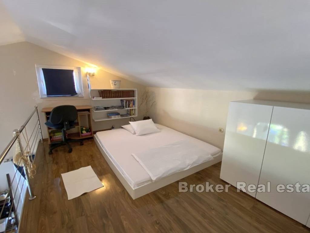 Dvojna kuća u prvom redu do mora, sa dvorištem iz kojeg se izlazi direktno na plažu. Nekretnina stambene površine od 120 m2 položena je na zemljištu od 200 m2. Dvojna kuća na dvije etaže raspoređena je u dvije stambene jedinice. U prizemlju se nalazi dvosobni apartman sa kuhinjom, blagovaonicom, dnevnim boravkom i kupaonicom te odvojenim WC-om. Iz apartmana se izlazi terasu koja nudi dovoljno prostora za druženje i relaksaciju uz pogled na more. Vanjskim stepeništem se pristupa apartmanu na katu. Apartman se sastoji od dvije sobe, kuhinje, blagovaonice, dnevnog boravka i kupaonice te dodatne galerije sa pogledom na more. Terasa u apartmanu pruža otvoreni pogled na plažu i more. Apartmani su potpuno opremljeni i uređeni te se takvi i prodaju. Parking se nalazi iza kuće. U dvorištu uređenom zelenilom nalazi se vanjski tuš te roštilj koji je naslonjen uz samu plažu. Trgovina, restorani i kafići su unutar 800 m od nekretnine. Luka u centru naselja zaštićena od svih vjetrova i osigurava dobro sklonište manjim jahtama. Otok Pašman poznat je po brojnim plažama te mnoštvom puteva pogodnih za biciklizam te stazama za šetnju i planinarenje na najviši vrh Bokolj s kojega se pruža panoramski pogled na zadarsku okolicu i okolna otočja.