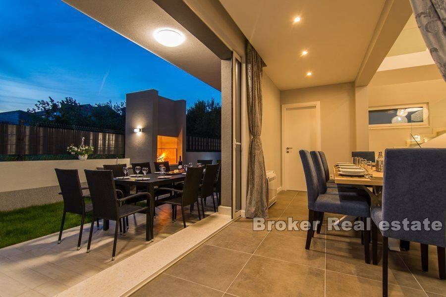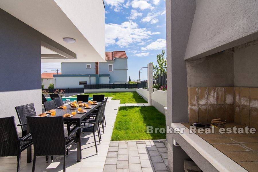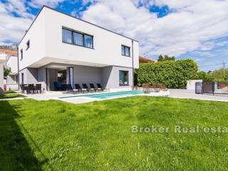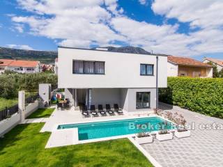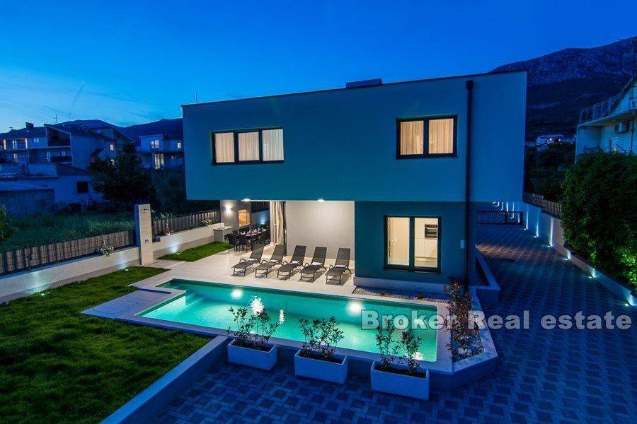 Kompleks od dvije vile smještene u Kaštelima, na udaljenosti 350 m od mora. Vile su izgrađene prema projektu u modernom i funkcionalnom arhitektonskom rješenju. Svaka vila se sastoji od 202 m2 stambenog prostora s okućnicom od 433 m2. Proteže se na dvije etaže. Sastoji se od 5 prostranih spavaćih soba, 5 kupaonica, kuhinje, hodnika, galerije i prostranog dnevnog boravka s blagovaonicom ukupne površine 43m2 (visine 6m). Etaže su povezane unutarnjim stubištem. S obzirom na visinu unutarnjeg prostora i korištenjem velikih staklenih kliznih stijenki prostor je ispunjen prirodnom svjetlošću. Okućnica svake vile sadrži bazen površine 25 m2, vanjski roštilj te natkriveni vanjski prostor organiziran za druženja. Vile su pod video nadzorom. Mogućnost parkinga za 8 automobila (po 4 za svaku vilu). U blizini se nalaze svi sadržaji potrebni za ugodan boravak.