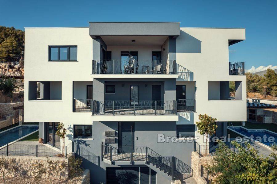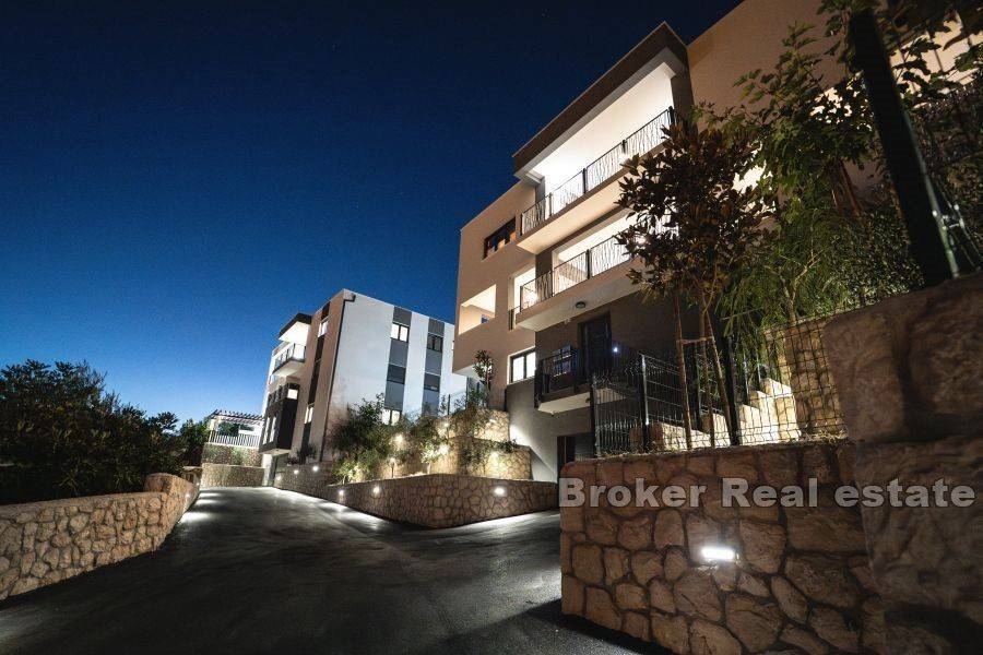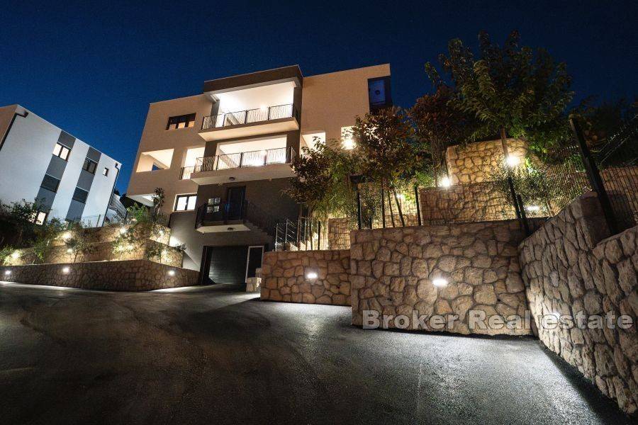 Na prodaju, luksuzan apartman s izuzetnom okućnicom, smješten na prvoj etaži urbane vile, u mirnom okruženju atraktivnog priobalnog mjesta. Apartman se sastoji od ulaznog djela, dvije kupaonice, toaleta, četiri spavaće sobe, kuhinje s blagovaonicom i dnevnog boravka s izlazom na prostranu, natkrivenu terasu s koje se pruža impresivan pogled na more i grad. Nekretnina ima dva ulaza s prednje i stražnje strane vile. Idiličan ambijent za druženje nudi vanjski prostor od 488 m2 okružen autohtonim suhozidom na kojemu je smješten bazen i lounge kutak oplemenjen mediteranskim biljem. Dodatnu udobnost življena pružaju i dva parkirna mjesta u garaži povezana direktnim liftom do etaže stana, kao i dva vanjska parkirna mjesta povezana sa stražnjim ulazom u stan. S obzirom na privlačnu borovu šumu pored ova nekretnina moderne arhitekture nudi intimnu i privatnu atmosferu, osjećaj življenja u kući te uživanje u blagoj klimi. Osim što je idealna za mirni boravak nedaleko od mora, plaže i centra grada a ujedno u mirnom okruženju, nekretnina nudi odličnu priliku za turističko iznajmljivanje.