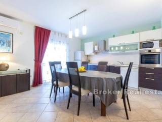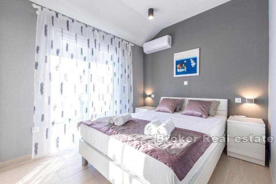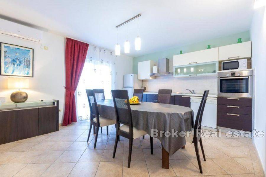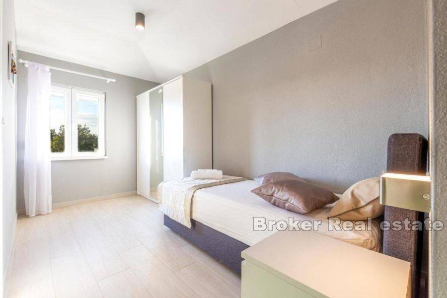 Prostrana kuća smještena u mirnom dijelu prekrasnog dalmatinskog mjesta u blizini grada Splita. Svojom lokacijom osigurava privatnost, pružajući pogled na more, otoke, Kaštelanski zaljev i grad Split. Kuća se prostire na tri etaže ukupne stambene površine od 349 m2, te je smještena na zemljištu ukupne površine od 574 m2. Prizemna etaža sastoji se od kuhinje, blagovaonice i dnevnog boravka, jedne spavaće sobe, kupaonice i vanjske terase. Na prvom katu nalazi kuhinja s dnevnim boravkom, jednom sobom , kupatilom i terasom s pogledom na more. Druga etaža se sastoji od 3 prostrane sobe svaka s svojim kupatilom i terasama s kojih se pruža prekrasan pogled na more. Kuća je opremljena masažnim bazenom, saunom, outdoor teretanom okruženom mediteranskom biljem te dvijema garažama ukupne površine 50 m2 i dva parkirna mjesta u dvorištu kuće. U blizini kuće nalazi se marina, lanci velikih prehrambenih trgovina, restorani, kafići i izvrsne plaže. Sa svojim karakteristikama idealna je za obiteljski odmor ili kao investicija za turističko poslovanje.