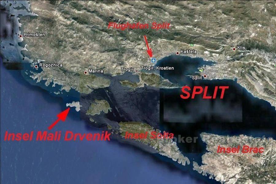 Prodaje se građevinsko zemljište sa ostatcima stare kamene kuće na otoku Drvenik Mali u blizini Trogira. Parcela je veličine 556m2, sa pristupnim putem, priključkom za struju i vodu. More je udaljeno svega 200m od parcele, kao i predivna pješčana plaža. Otok je dobro povezan trajektnim linijama iz Trogira kao i brzom brodskom linijom. Zračna luka Split i autoput na udaljenosti 10km od trajektne luke u Trogiru.