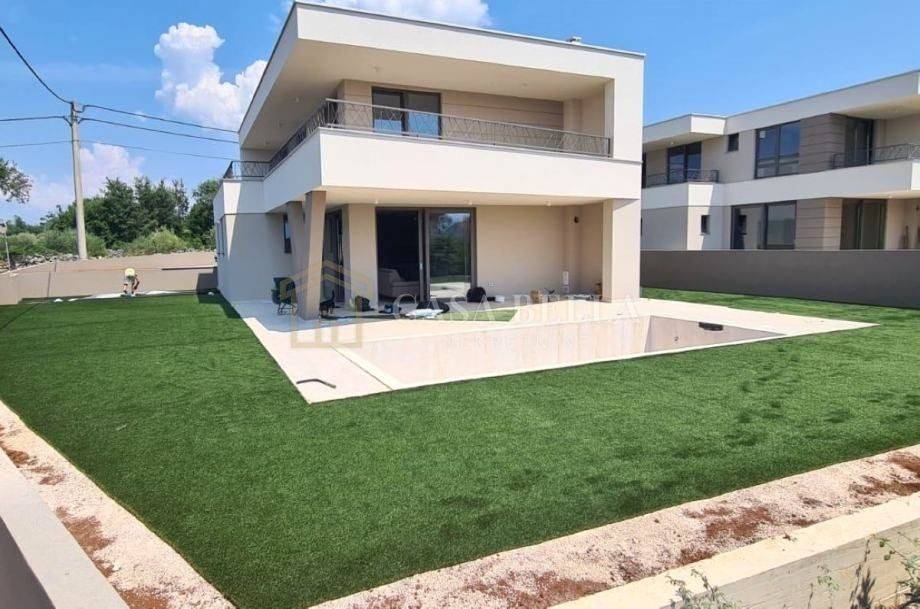 Casa Bella nekeretnine iz ponude izdvaja novu urbanu vilu na području općine Dobrinj. Kuća je uređena, ima sve potrebne sadržaje uključujući pločice i parket. Novi vlasnik mora samo izabrati i unijeti svoje pokućstvo (na slikama je računalna projekcija). U prizemlju je dnevni prostor s kuhinjom, dnevnim boravkom i blagovaonicom, prostorijom za pranje rublja i toaletom. Na prvom katu su dvije sobe s vlastitim en suite kupaonicama, balkonima i posebnom terasom. Na drugom je katu velika soba (koja se može preurediti u dvije sobe ako to vlasniku odgovara jer imamo dvoja vrata) zatim treća kupaonica i velika terasa koja gleda na sjever. S ove se terase pruža lijep pogled na more, cijelu liburnijsku obalu, Rijeku i crikveničku rivijeru. Okoliš obuhvaća 700 kvadratnih metara i na njemu je moguće napraviti bazen i dodatni pomoćni objekt (za garažu, hobije itd). Kuća je napravljena po suvremenim standardima, što podrazumijeva trostruka stakla na prozorima, aluminijske rolete i obvezne walk in prostore za tuš.