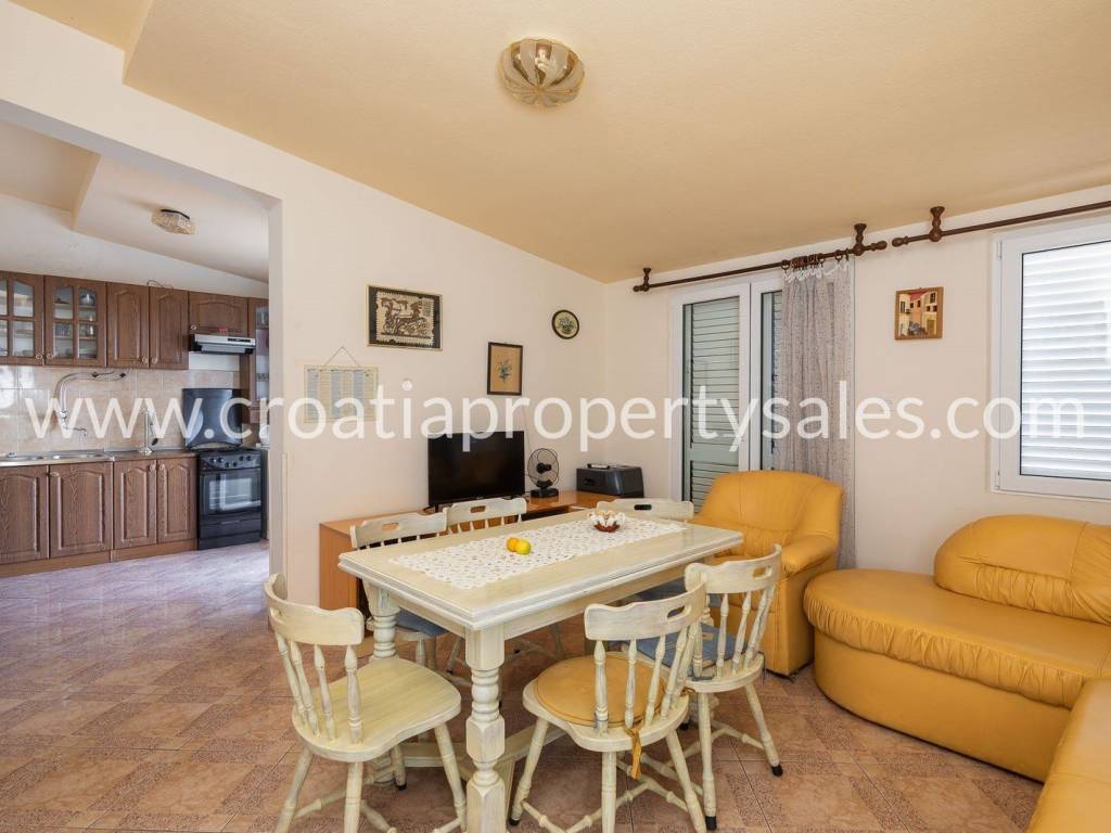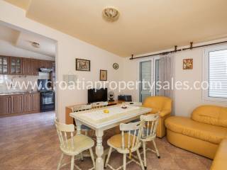 Izuzetna dvojna kuća smještena samo 100 m od mora i prekrasnih plaža kojima omiška rivijera obiluje.Kuća se sastoji od suterena, prizemlja i kata. U suterenu kuće nalaze se garaže sa ukupno 3 parkirna mjesta.U prizemlju i na prvom katu nalaze se identični stanovi sa kuhinjom, kupaonicom, blagovaonicom, dnevnom sobom, te dvije spavaonice.U nastavku stana  u prizemlju nalazi se prekrasna terasa u čijem se produžetku nalazi lijepo održavana okućnica.Kuća se prodaje potpuno namještena i opremljena.Stan na prvom katu također ima južno orijentirani balkon sa prelijepim pogledom na more i otoke.Sama lokacija objekta je izuzetno mirna čak i u ljetnim mjesecima a predivne plaže su udaljene samo par minuta hoda.Trgovina koja radi cijelu godinu i restorani su jako blizu što ovaj objekt čine dodatno poželjnim bilo za vlastiti odmor ili turistički najam.